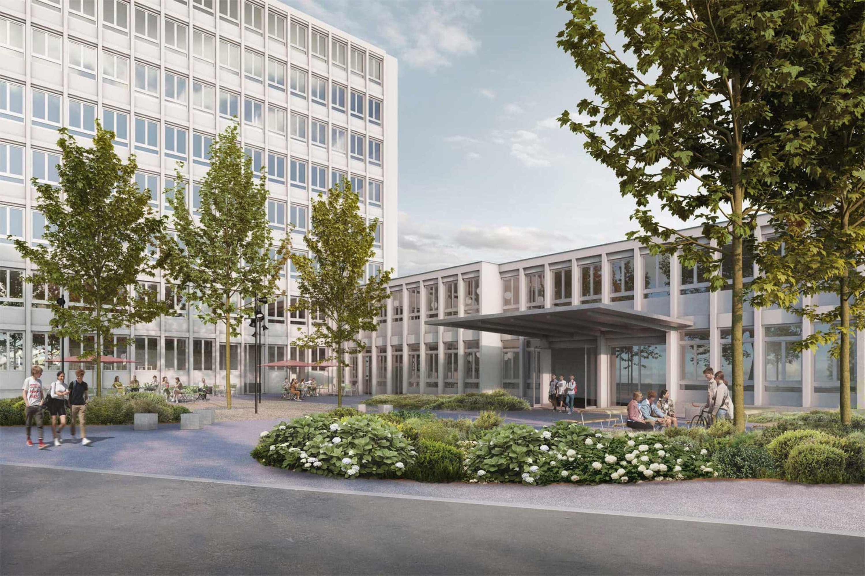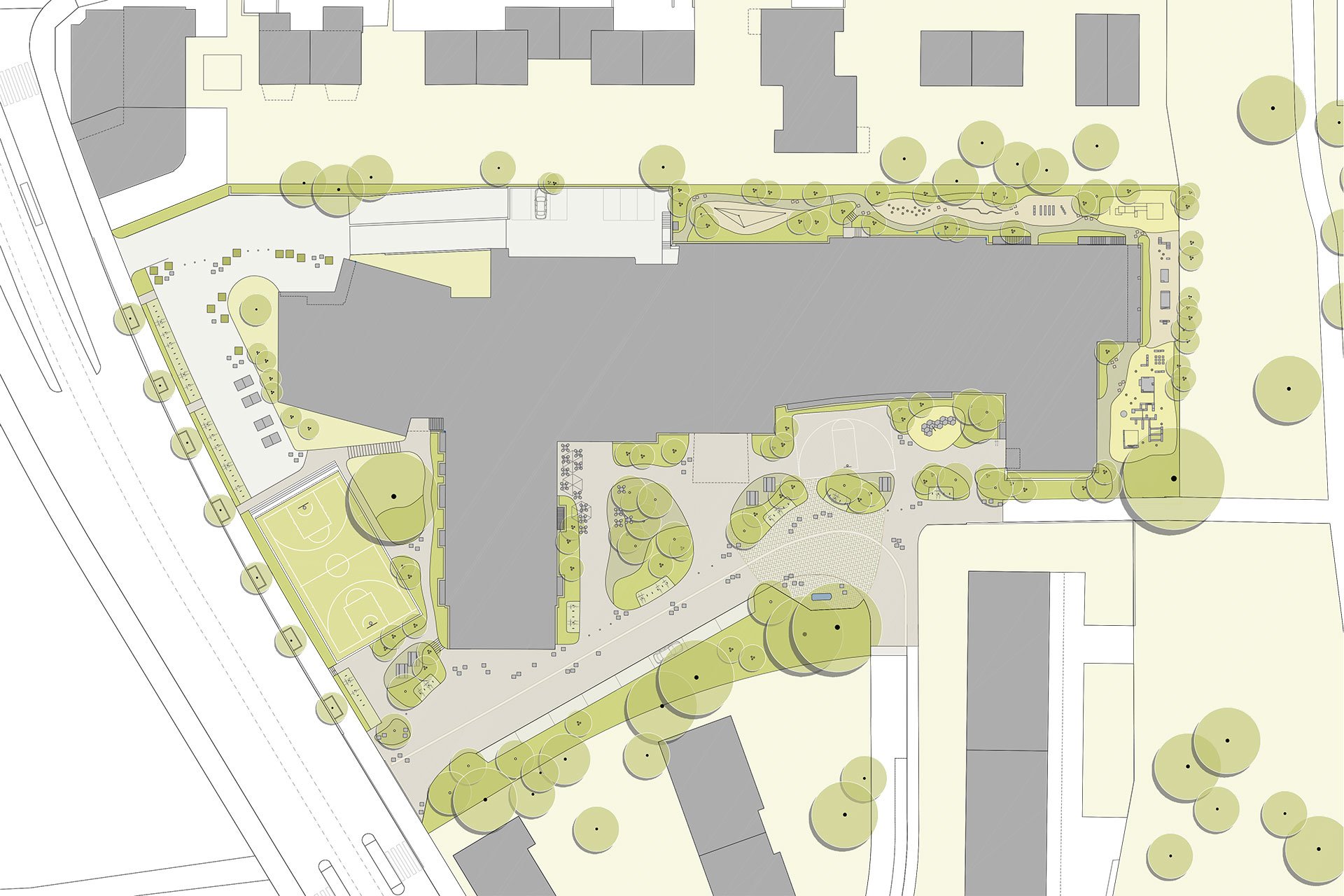 Eine vielfältig nutzbare Pausenebene spannt sich zwischen dem Brunnenhofweg und dem Haupteingang der Schule auf. Vegetationsinseln durchsetzen den Platz, bilden Aufenthaltsbereiche und nehmen das Oberflächenwasser der versiegelten Fläche auf. Eine zentrale Kiesinsel mit schattenspendenden Bäumen bietet einen attraktiven Aufenthaltsort für die Schüler und einen Aussenbereich für die Mensa. Ein Street-Basketballfeld und eine Klettermöglichkeit sind in die Pausenebene integriert. Zur Hofwiesenstrasse ergänzt zudem ein Allwetterplatz die Aktivitätsmöglichkeiten während den Pausen und für die Nutzung während des Sportunterrichtes.