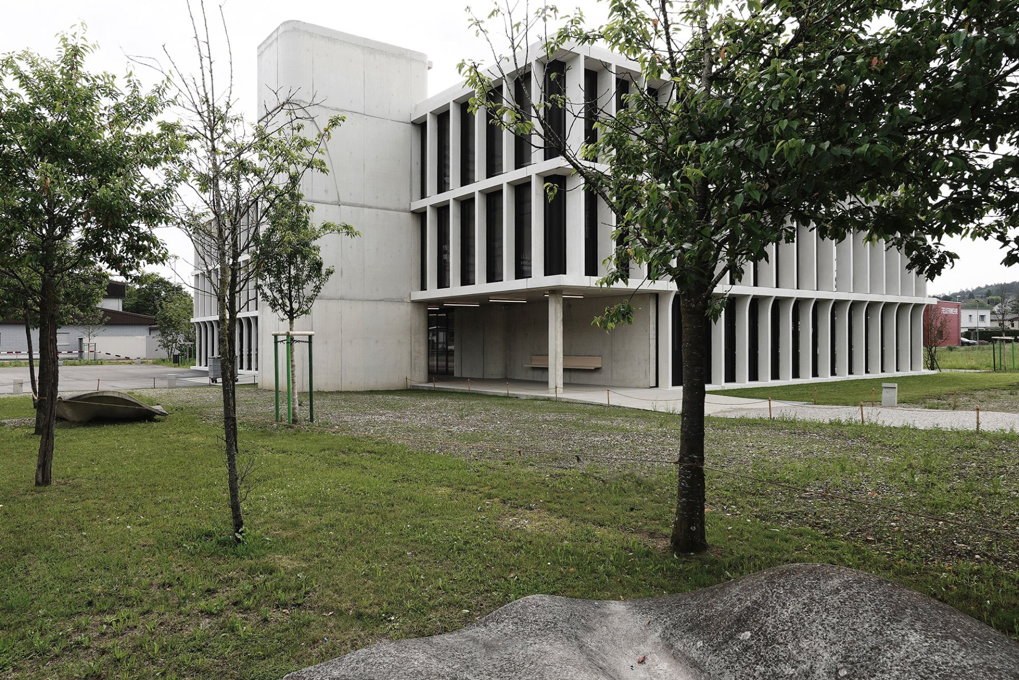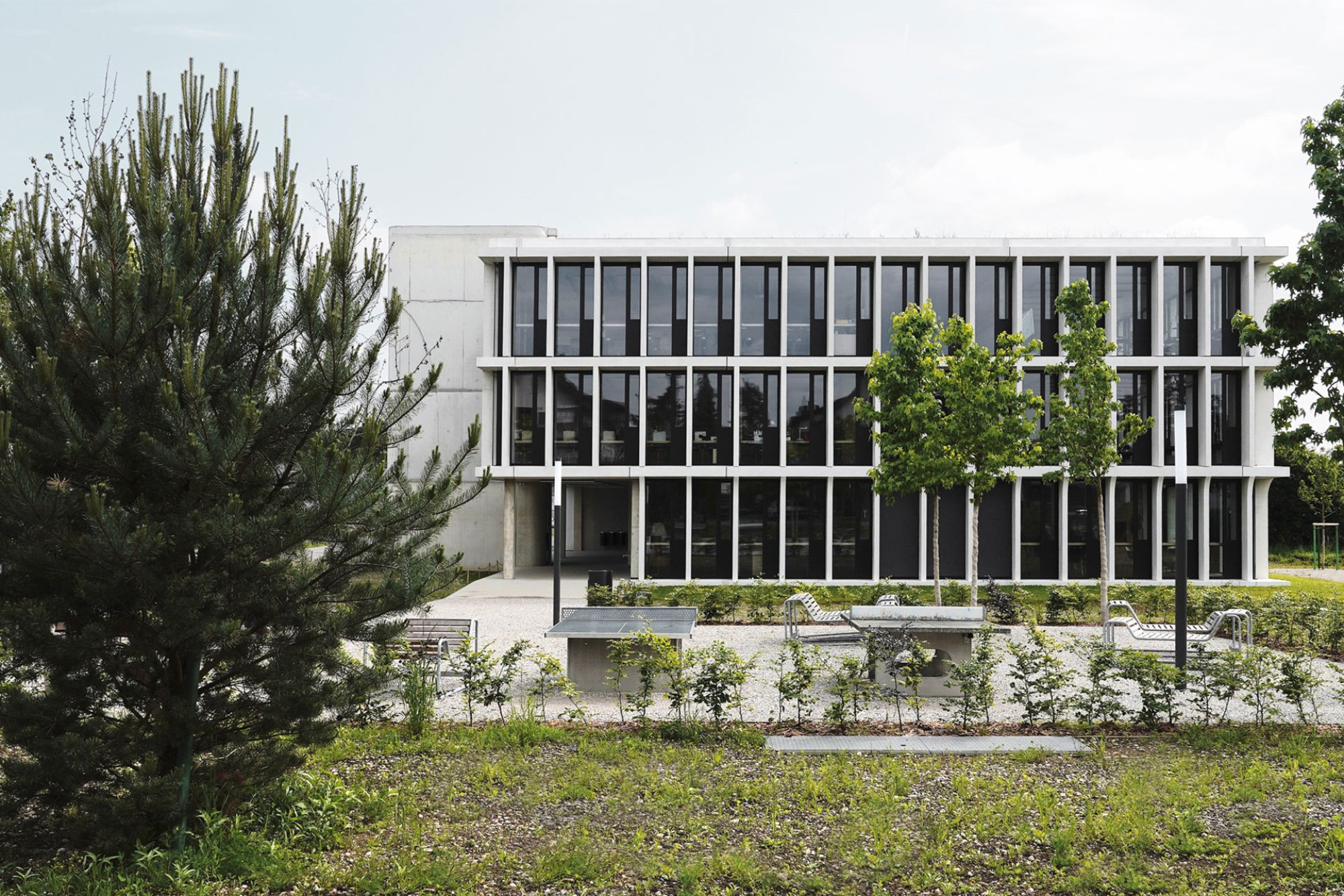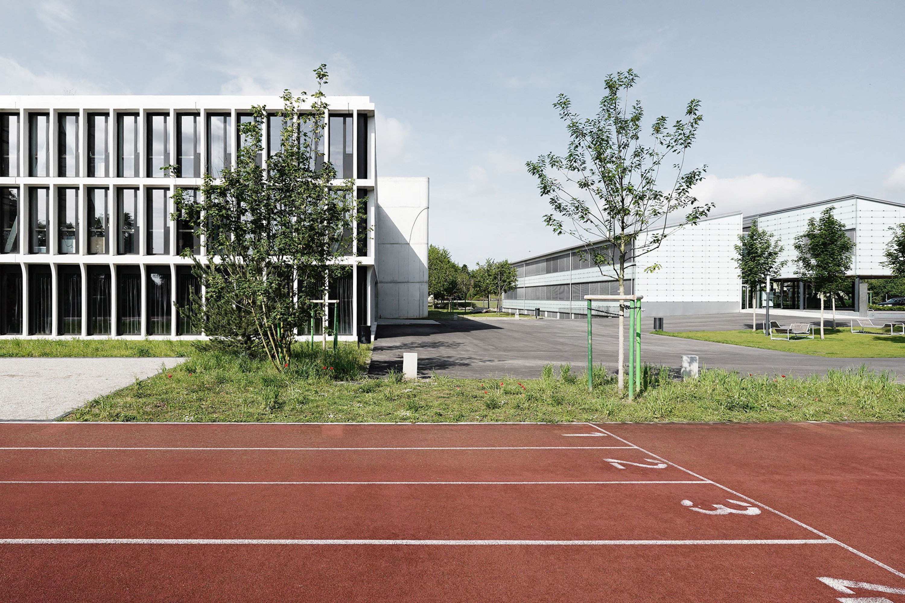 Angedockt an den Platz, liegt das Schulhaus im Grünen und ist umgeben von einem vielfältigen Spiel- und Sportraum. Heimische Gehölze stricken den Bestand zu locker stehenden Baumgruppen weiter. Im Westen des Neubaus, fügt sich ein Gartenzimmer als erweiterter Pausenplatz in die Wiesenfläche ein. Mit Pflanztischen, Sitzmobiliar und Tischtennistischen bestückt, bietet sich ein geschützter Ort für Pausen oder den Unterricht im Grünen. Eine Mischung aus schattenspendenden Hochstammbäumen durchsetzt die chaussierte Fläche und akzentuiert in Gruppen den Raum.