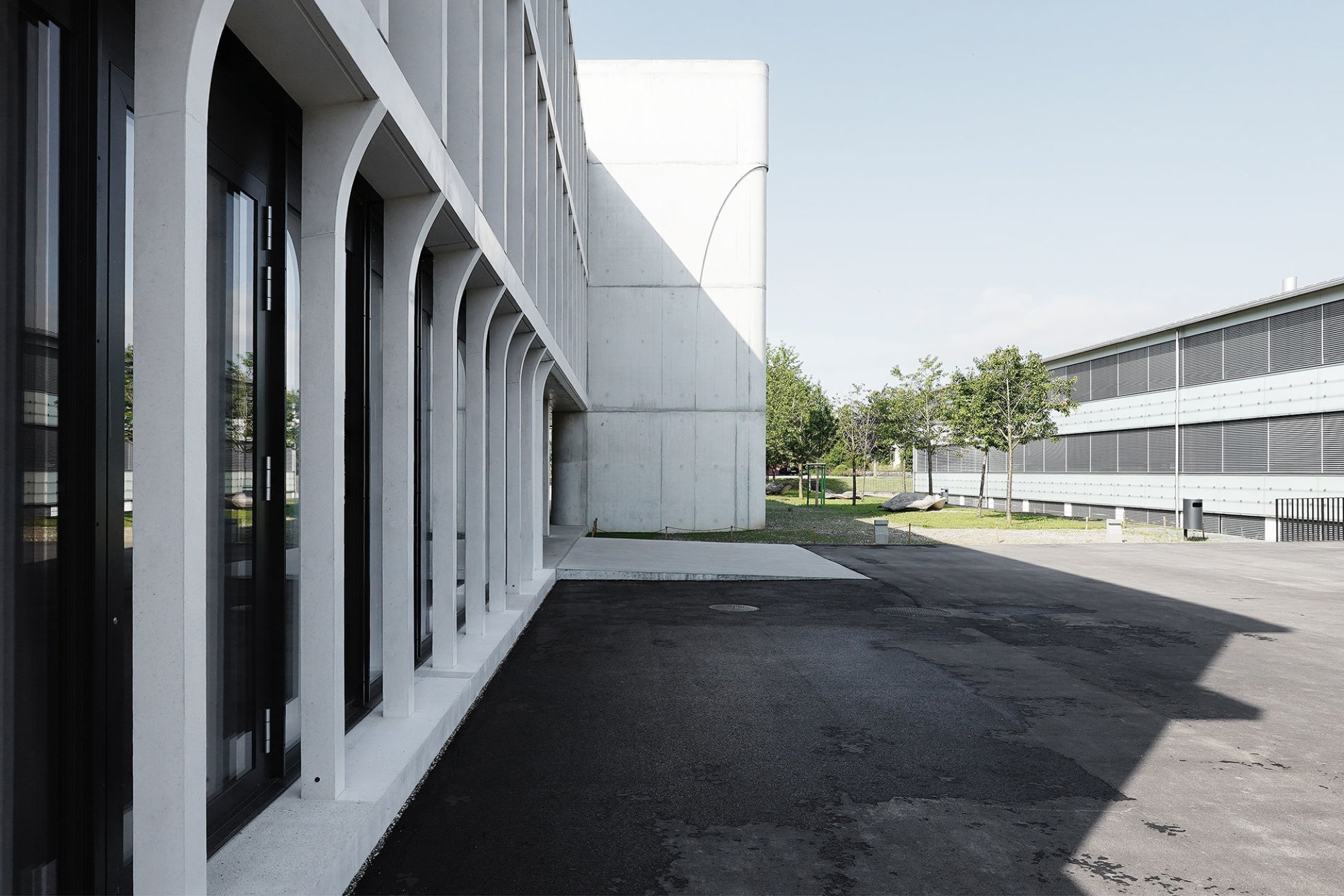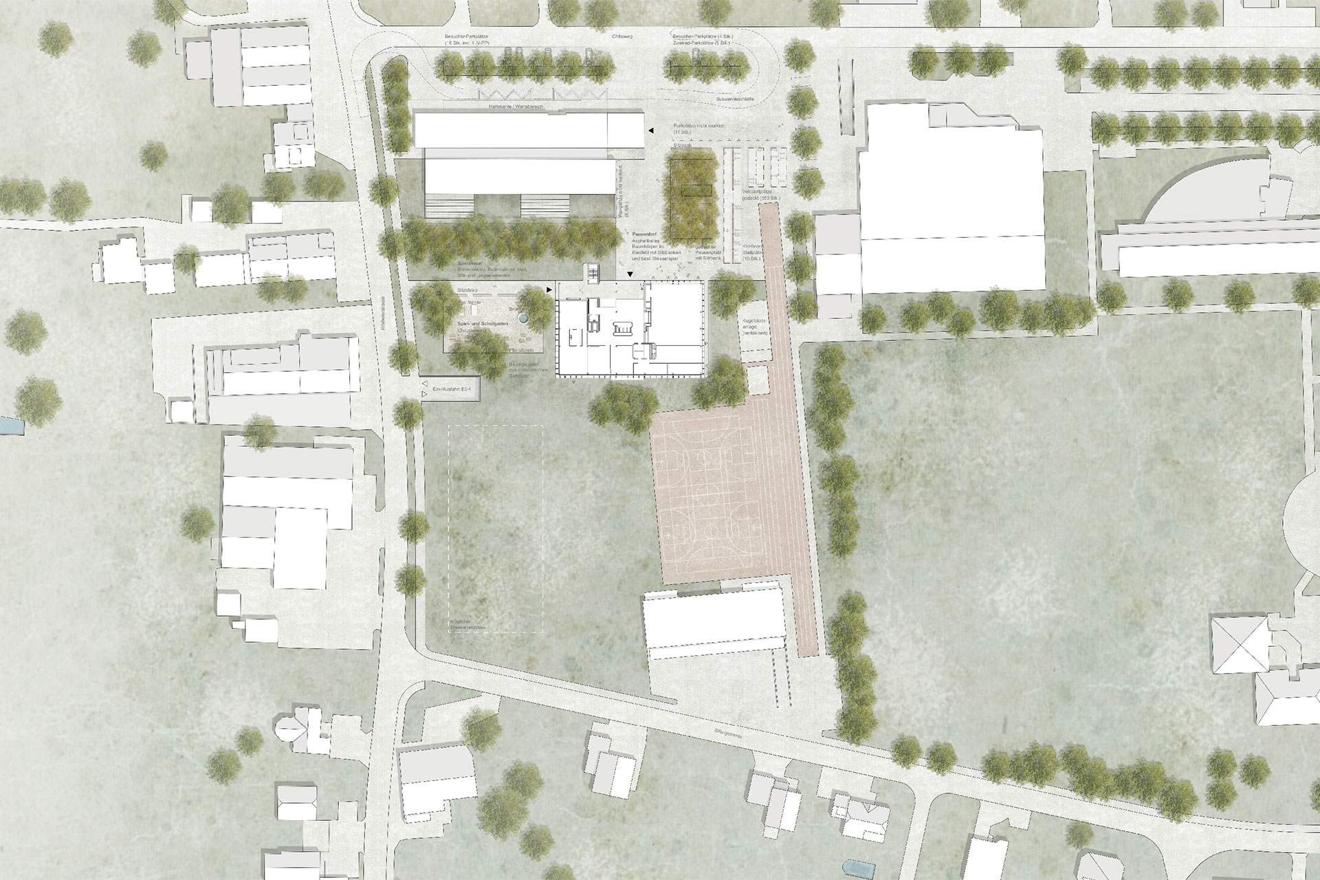 Zwischen dem bestehenden Schulhaus Carpe Diem, der Dorfhalle und dem neuen Schulhaus bildet sich ein offener und multifunktionaler Platz, der die Gebäude miteinander verbindet und eine einladende Adressierung am Chäsiweg schafft. Die zentrale Platzfläche bietet ein vielfältiges Angebot für Bewegung und Sport sowie Pausenaufenthaltsbereiche. Ein Baumdach aus hochstämmigen Laubbäumen fügt sich als klar umrissenes Baumvolumen in die offene Platzfläche ein. Ausgestattet mit Sitz- und Liegeelementen etabliert ein Kiesfeld einen attraktiven und beschatteten Treffpunkt mit Aufenthaltsqualität. Ein lineares Dach mit Velo- und Kickboardstellplätzen schliesst die Platzsituation im Osten ab.