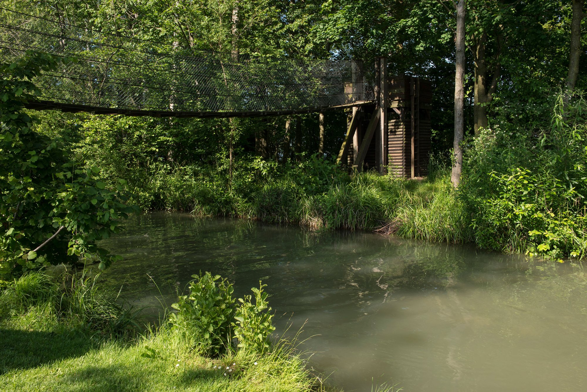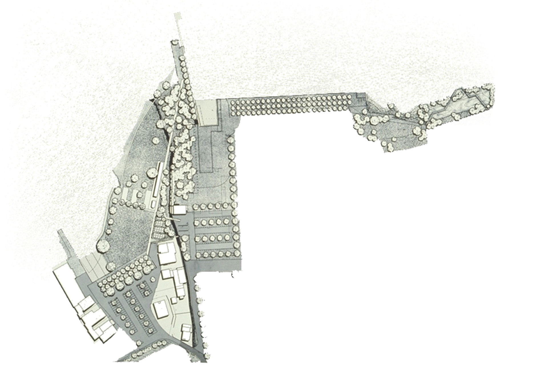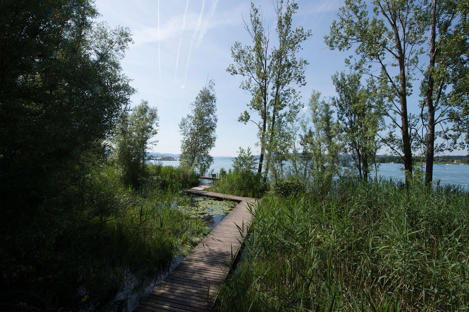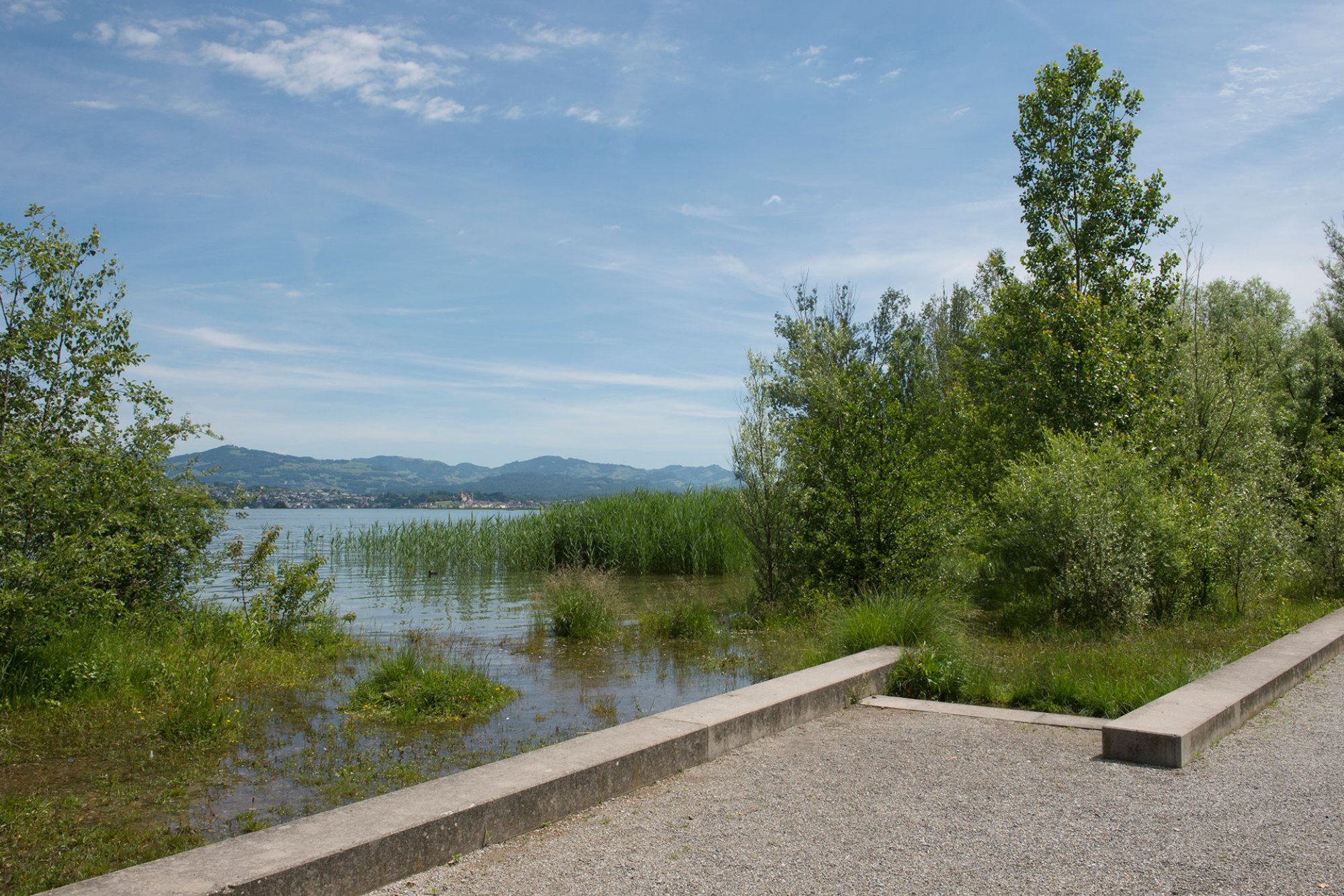 In Schlossnähe bildet ein Baumkörper den Auftakt zur Seeanlage. Eine lineare Wegachse quert den ausgebauten Dorfbach und führt vorbei an Blumengarten und Strandbadgebäude durch ein verwildertes Waldstück auf die Halbinsel mit Anlegestelle der Zürichsee Schifffahrtsgesellschaft. Zugleich erreicht auch der im Kontrast dazu stehende geschwungene Seeuferweg hier sein Ziel. Der anschliessende Hafenplatz mit Clubhaus bildet als räumliche Zäsur den Übergang zu der dem Steinfabrikareal vorgelagerten Promenade, die von einem dreireihigen Lindendach begleitet wird und zum angrenzenden Naturschutzbereich führt. Über einen Holzsteg gelangt man zum Hochsitz, der einen Rundblick zurück auf die Seeanlage und das weitläufige Naturschutzgebiet Frauenwinkel eröffnet.