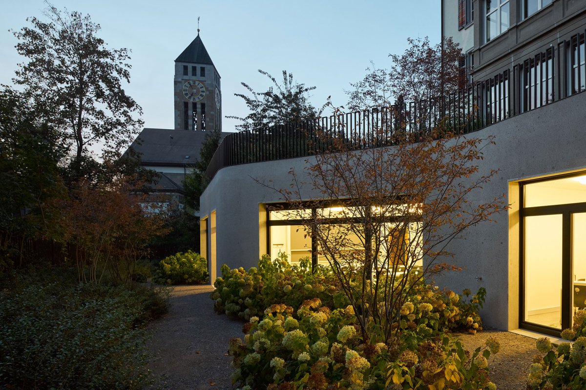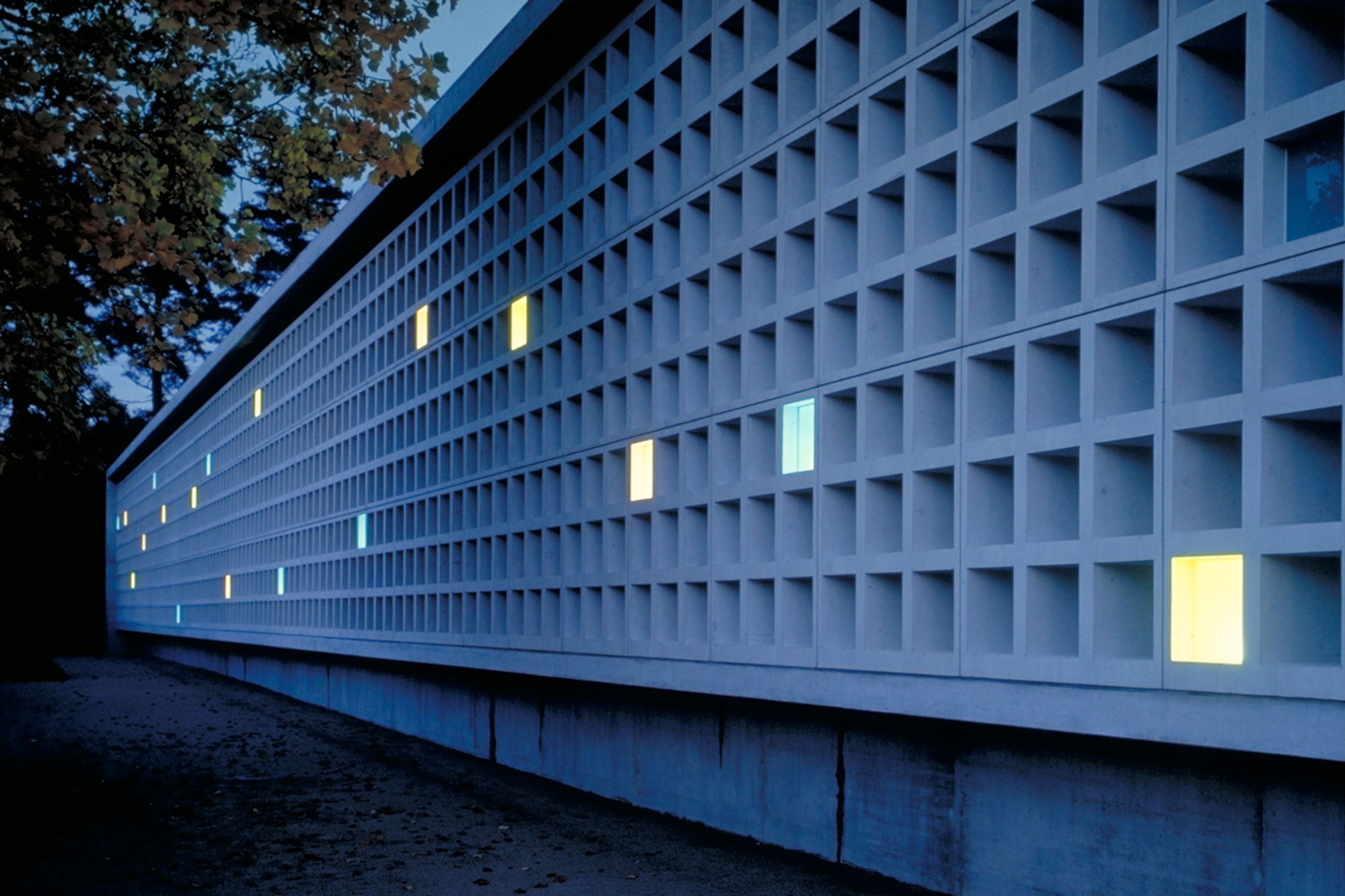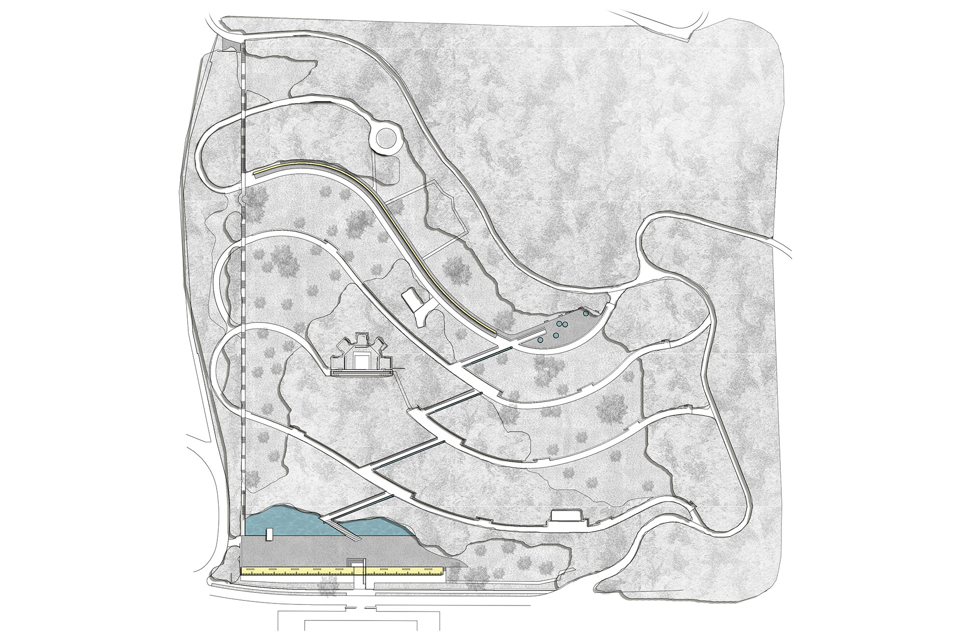 Der Entwurf löst die Symmetrie des Friedhofs zur angrenzenden Landschaft hin auf. Von der mächtigen Hauptachse führt der Weg in weiten Schwüngen gegen den Wald empor. Hinter dem Urnengebäude weitet er sich überraschend zu einem langgezogenen Platz, bietet dem Auge gefasste Ruhe vor dem Hintergrund wogender Haine am Hang. Über eine Brücke steigt der Weg durch den Waldgarten in sanft geschwungene Wiesenfluchten. Architektonische Zeichen und die horizontalen Linien der Wege durchwirken den Raum.