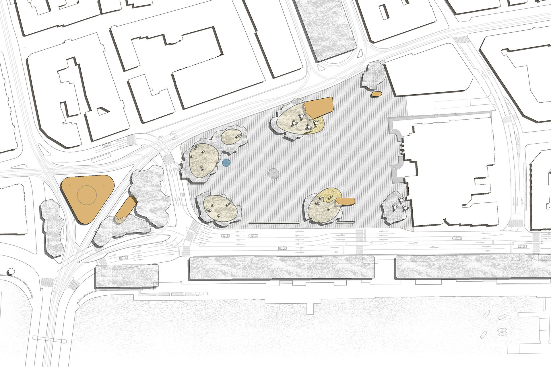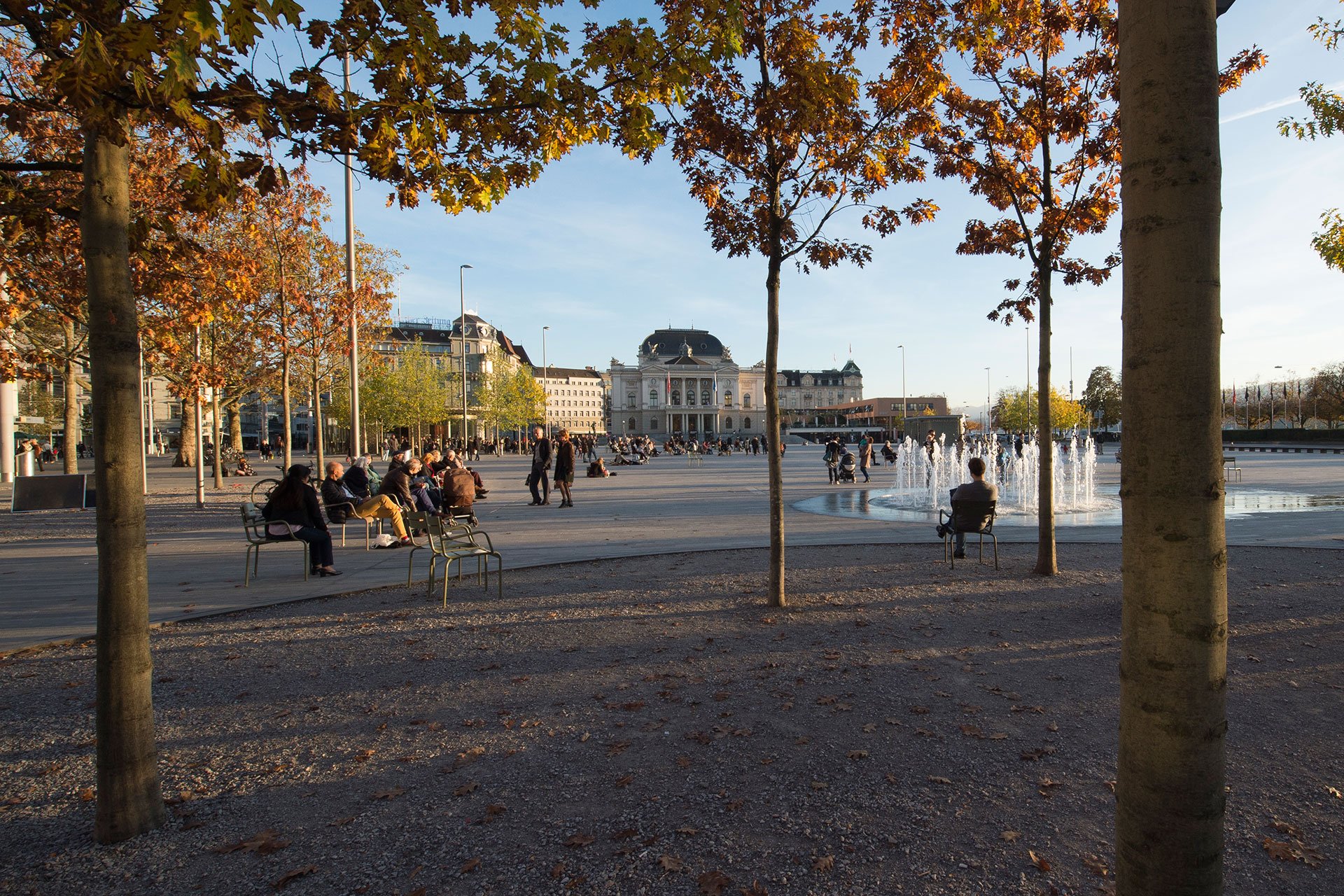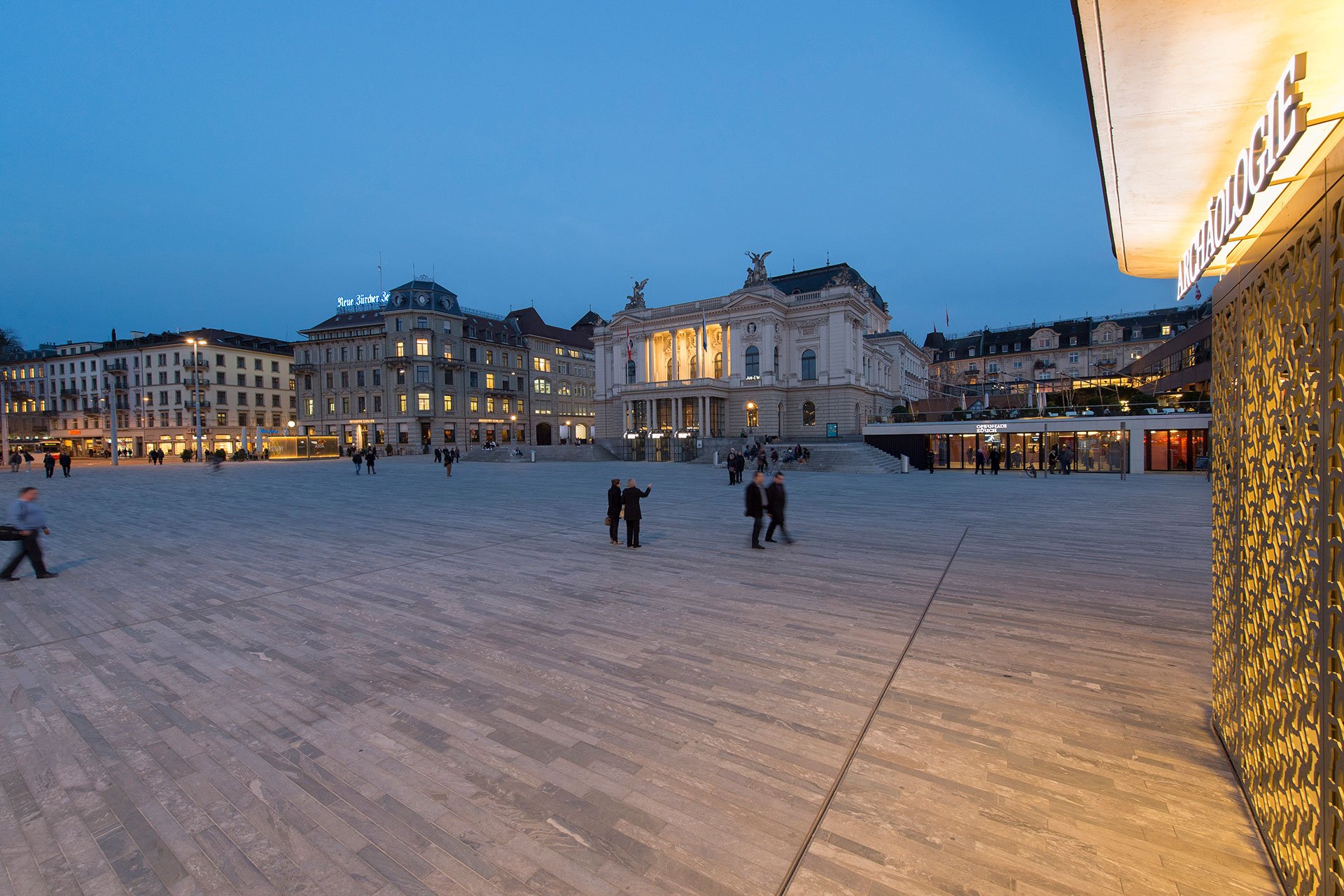 Den Hintergrund bilden die Fassaden der Altstadt und die Baumriesen des Bellevue, direkt am Platz steht prominent, doch nicht dominant das Opernhaus in seinem neuen Kontext. Zwei Pavillons und mehrere Baumhallen verteilen sich in tänzerischer Leichtigkeit auf dem steinernen Parkett. Dazwischen herrscht grosszügige Leere – für Flaneure, Skater, Stadtmenschen und Anlässe vom Sechseläuten bis zum alljährlichen Zirkus.