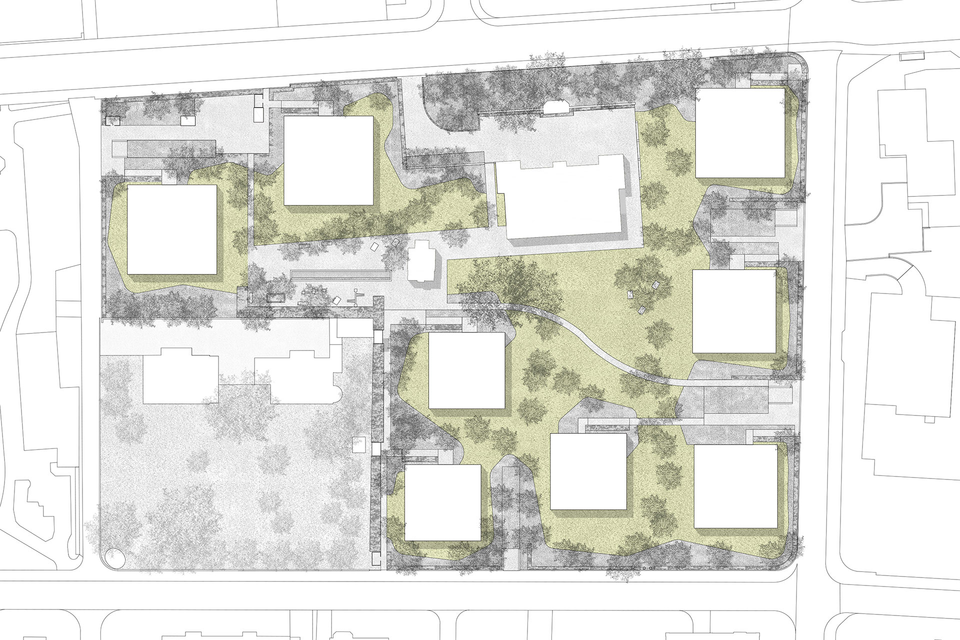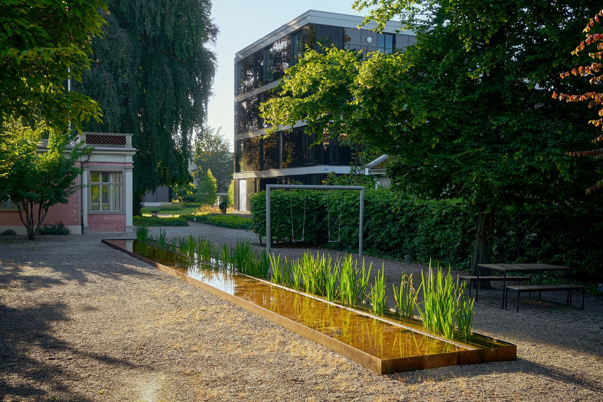 Stattliche Bäume und grosszügige Blumenwiesen prägen das Areal und geben ihm seine Identität. Wege durchlaufen den Grünraum und führen über den zentralen Platz mit dem bestehenden Pavillon. Eine Wasserfläche spiegelt das Blätterdach wieder und Spielelemente beleben den Quartierplatz. Sitz- und Liegeelemente im Park lassen verschiedene Nutzungen offen und schaffen gemütliche Orte im Park. Die Villa Fehlmann gewinnt durch die neu angelegte Wegführung an Eigenständigkeit. Eine zugeordnete Platzfläche verstärkt den Bezug zum Aussenraum und ist Anschlusspunkt an den Platz mit Pavillon und das Wegnetz der Anlage.