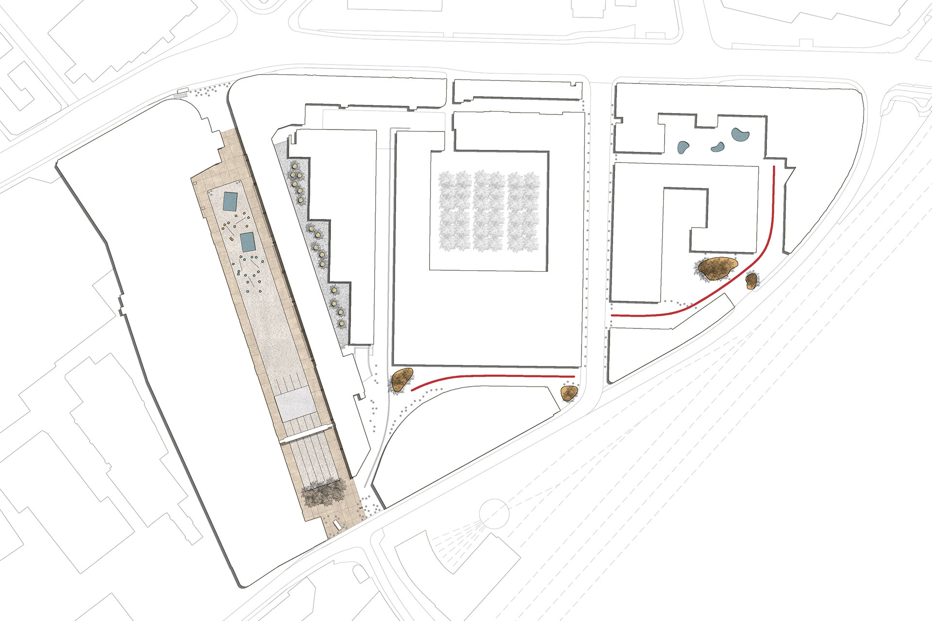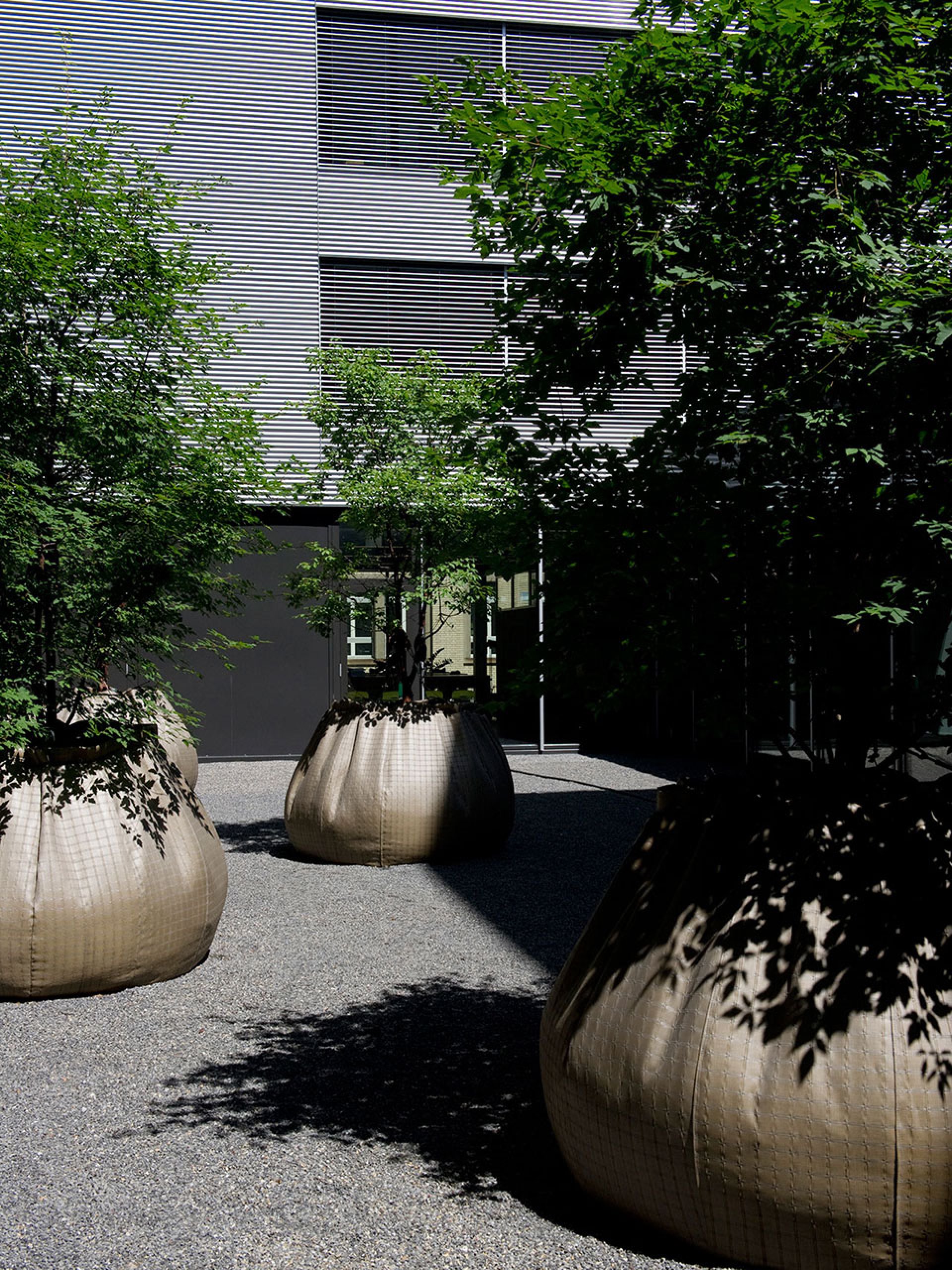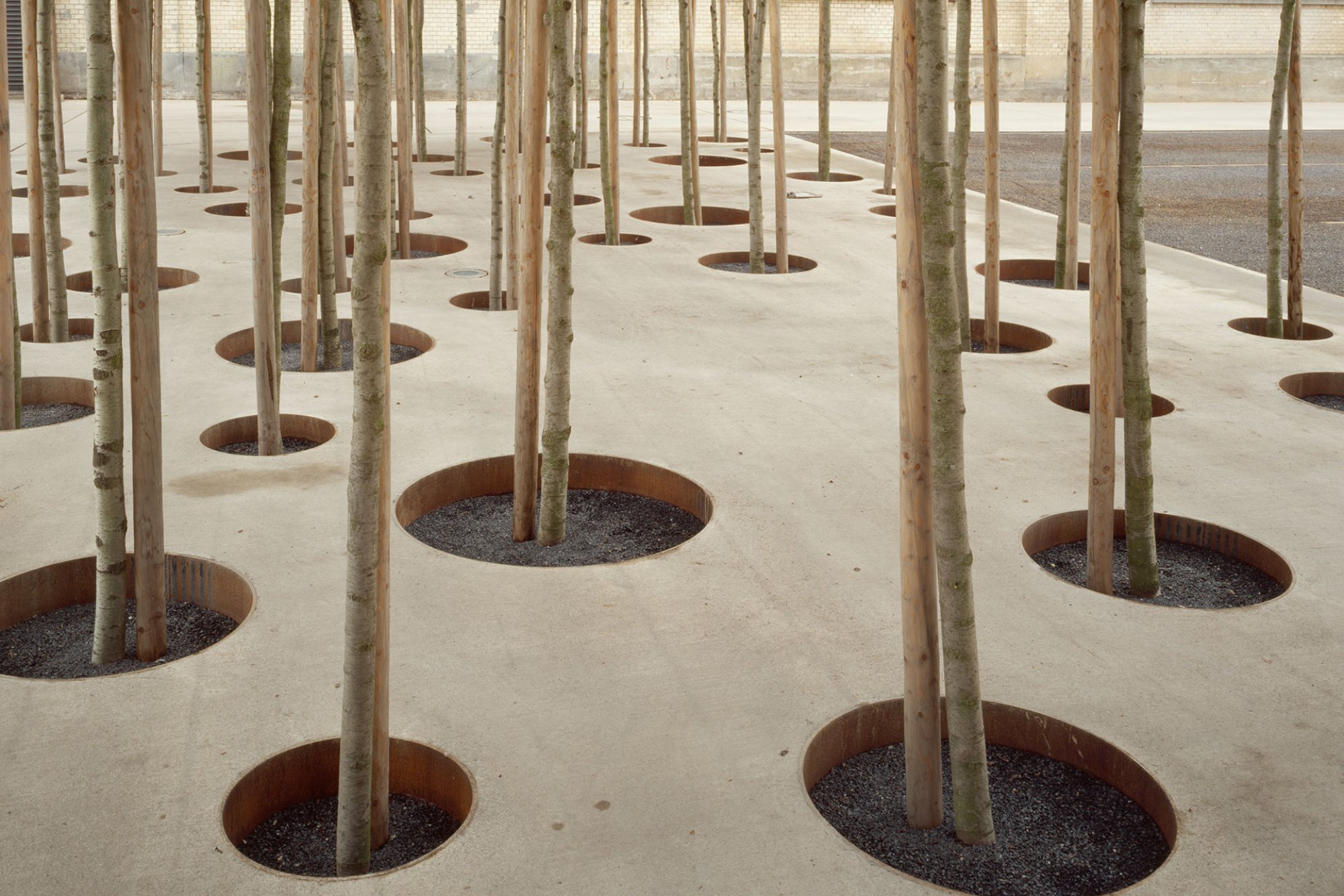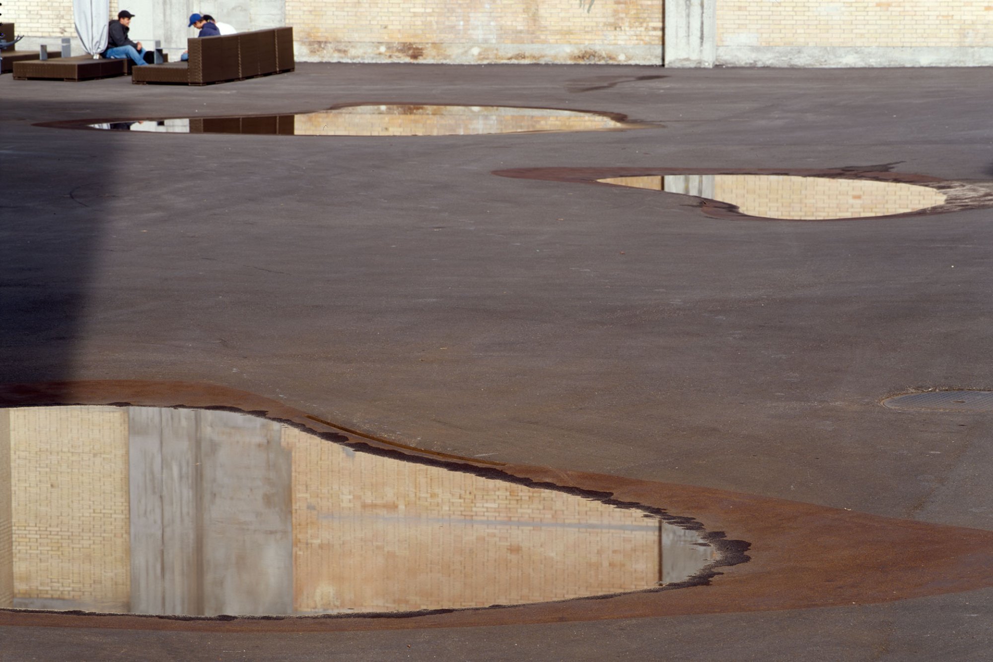 Der Entwurf zeichnet mit grosszügigen Gesten und leisen Tönen ein fragmentarisches, da und dort flüchtiges Bild. Zeichenhaftigkeit und Wandelbarkeit prägen die Atmosphäre. Das manifestiert sich beispielsweise in der unterschiedlichen Durcharbeitung der Oberflächen. Wo vielleicht auch früher auf dem von Lastwagen verdichteten Boden Pfützen stehen blieben, liegen gefasste, bodenebene Wasserbecken. Ruderalbaumarten sind von Asphaltritzenbewohnern zu Schatten spendenden Baumgruppen befördert worden.