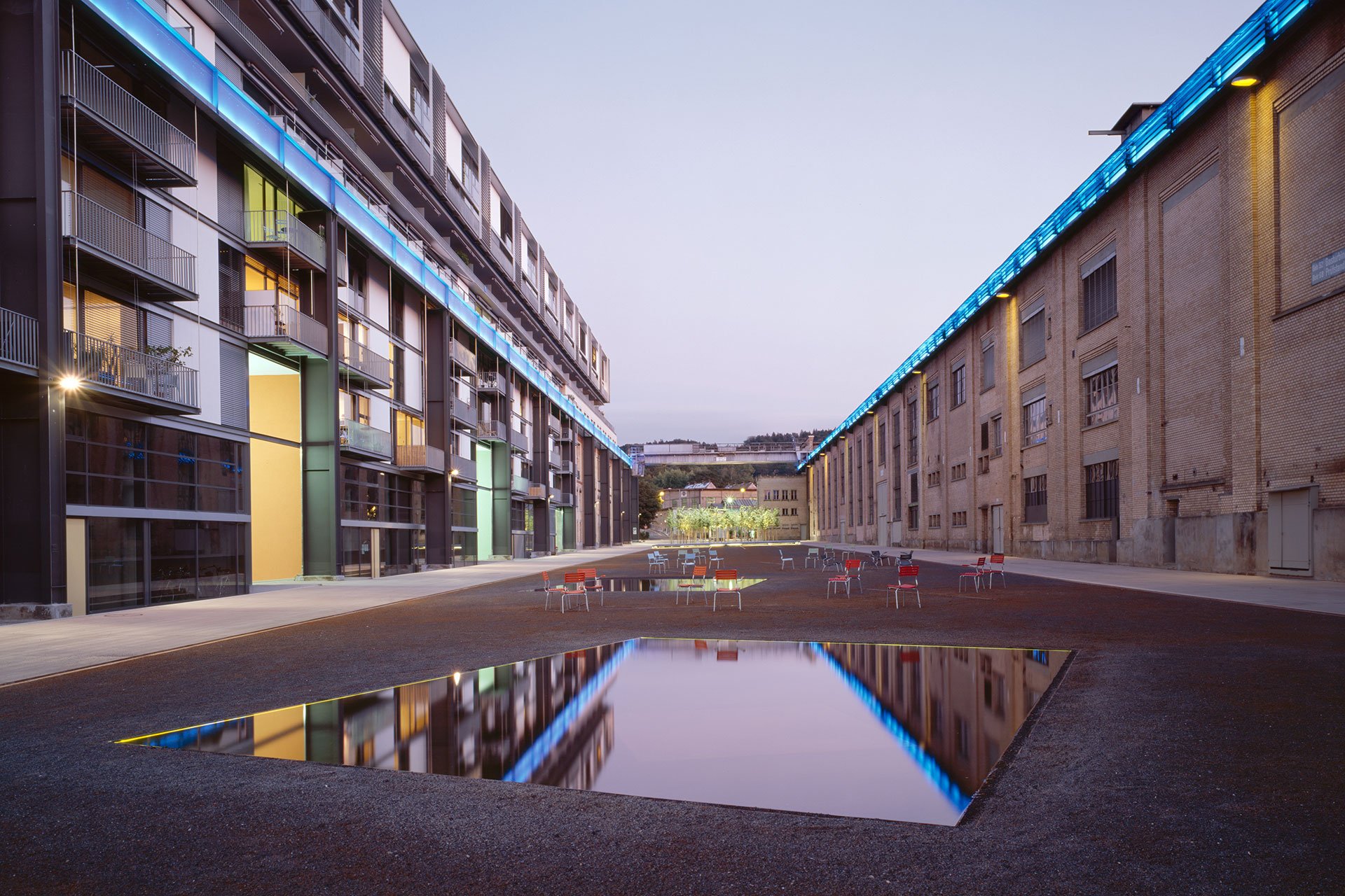 Eine übergeordnete Strategie bestimmt den gestalterischen Wandel der Freiräume. Sie sorgt für eine kontinuierliche, den Qualitäten dieses Raumes verpflichtete Fortführung der Geschichte. Ziel der Aussenraumgestaltung war, die Charakteristik einer fortlaufenden Transformation zu erfassen, die sich auf verschiedenen Ebenen gleichzeitig abspielt. Das Potential der Veränderung ist Programm. Der Umnutzungsprozess dauert an. Das neue, variable Bild bereichert die Stadt.