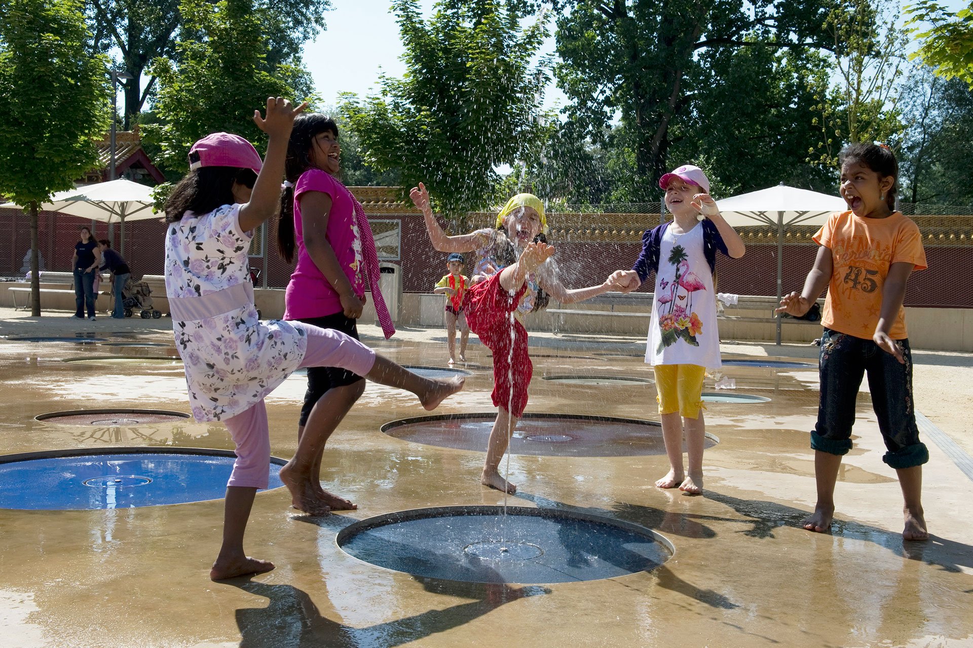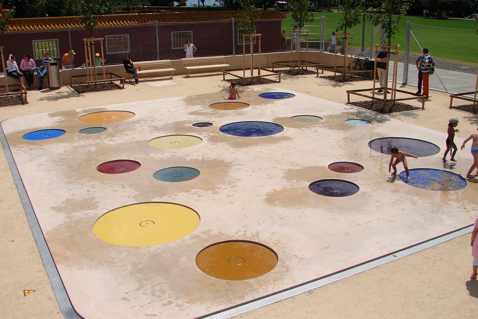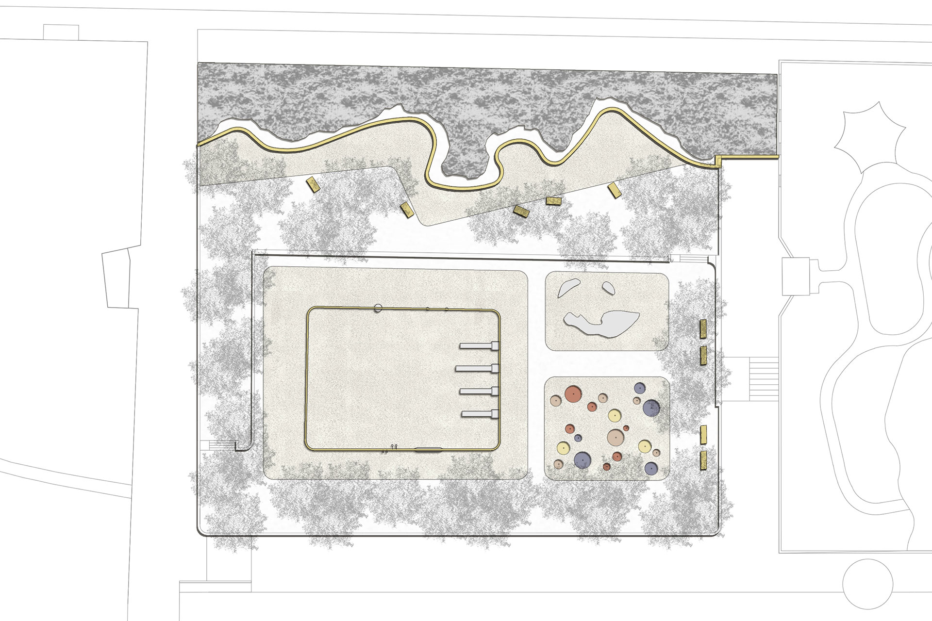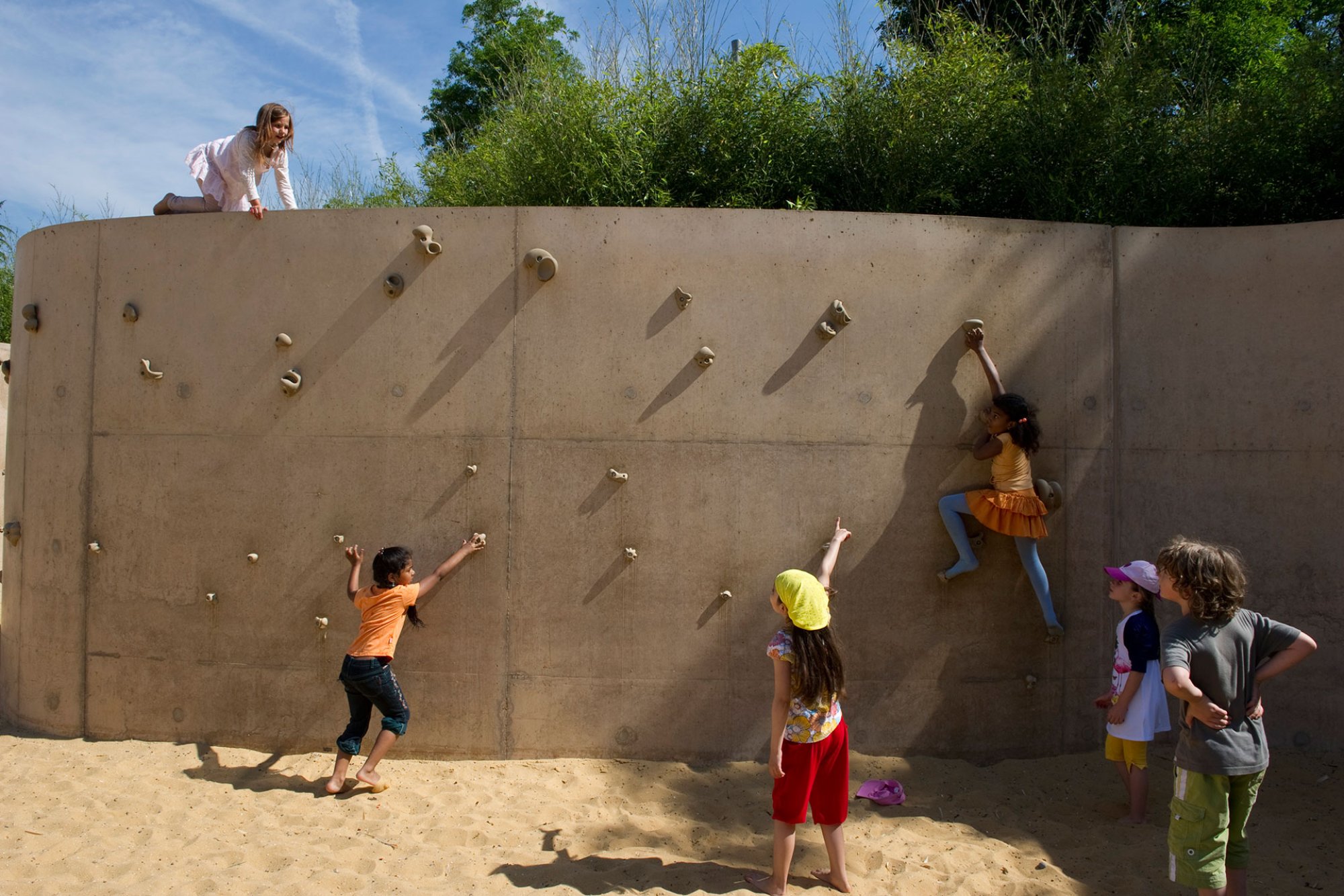 Für die Kinder ist die Mauer dank einer Vielzahl an Klettergriffen nicht Barriere, sondern abenteuerliche Herausforderung mit spannenden Nischen. Zum Park hin öffnet sich der Spielplatz, eine Sitzstufe führt zur unteren Ebene. Der Sandspielbereich und Felsblöcke neben einem farbenfrohen Wasserspiel, aber auch klassische Geräte bieten ein breites Spektrum an Möglichkeiten. Mit ihren Sitzgelegenheiten, Schattenplätzen und Rückzugsmöglichkeiten, aktiveren und stilleren Bereichen bietet der Spielplatz Kindern wie Eltern Raum für Spiel und Aufenthalt.