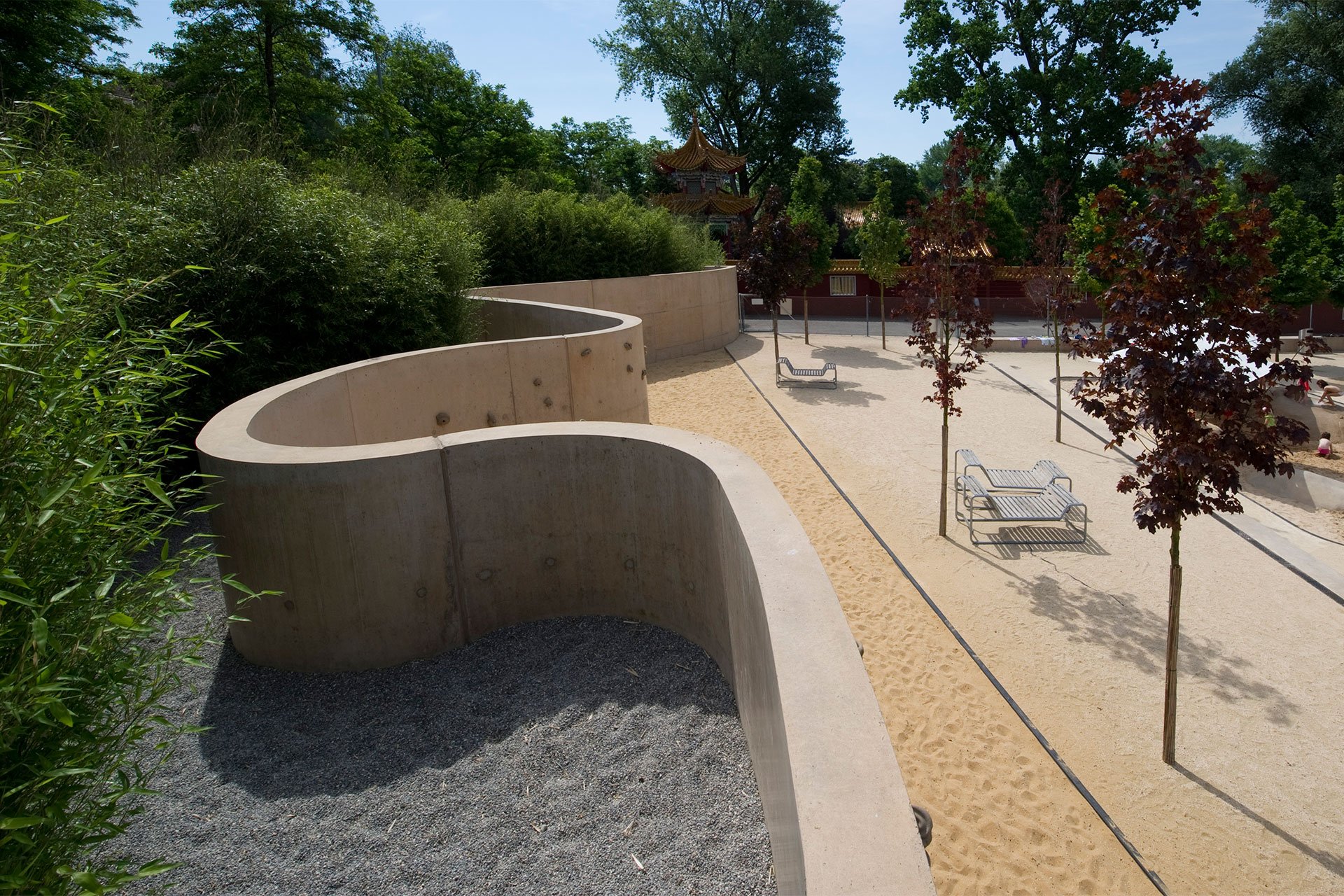 Wie eine Schlange windet sich eine Mauer durch das Gelände. Zusammen mit dem begleitenden Bambushain – einem Bezug zum nahen Chinagarten – grenzt sie den Spielplatz optisch und akustisch von der angrenzenden Bellerivestrasse ab und bildet das räumliche Rückgrat der Anlage.