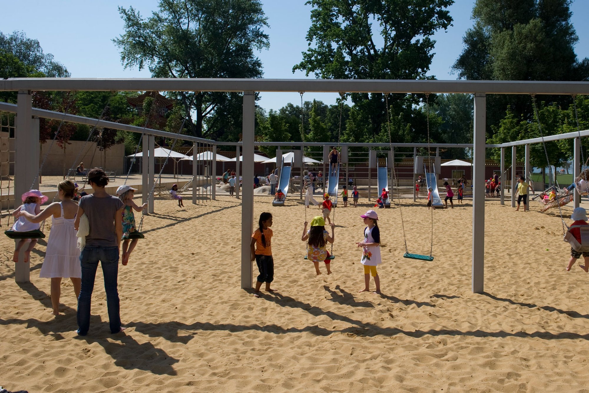 Die Geräte sind in einem Spielrahmen organisiert. Elemente wie Schaukelspiele, hängende Spielgeräte und Rutschbahnen sind so bei Bedarf unkompliziert austauschbar. Der durchgehend sandige Bodenbelag sorgt für Strandatmosphäre. Locker über die ganze Anlage verteilt, werfen Bäume stimmungsvolle Schattenbilder und binden die Anlage in die Parkumgebung am Zürichsee ein.