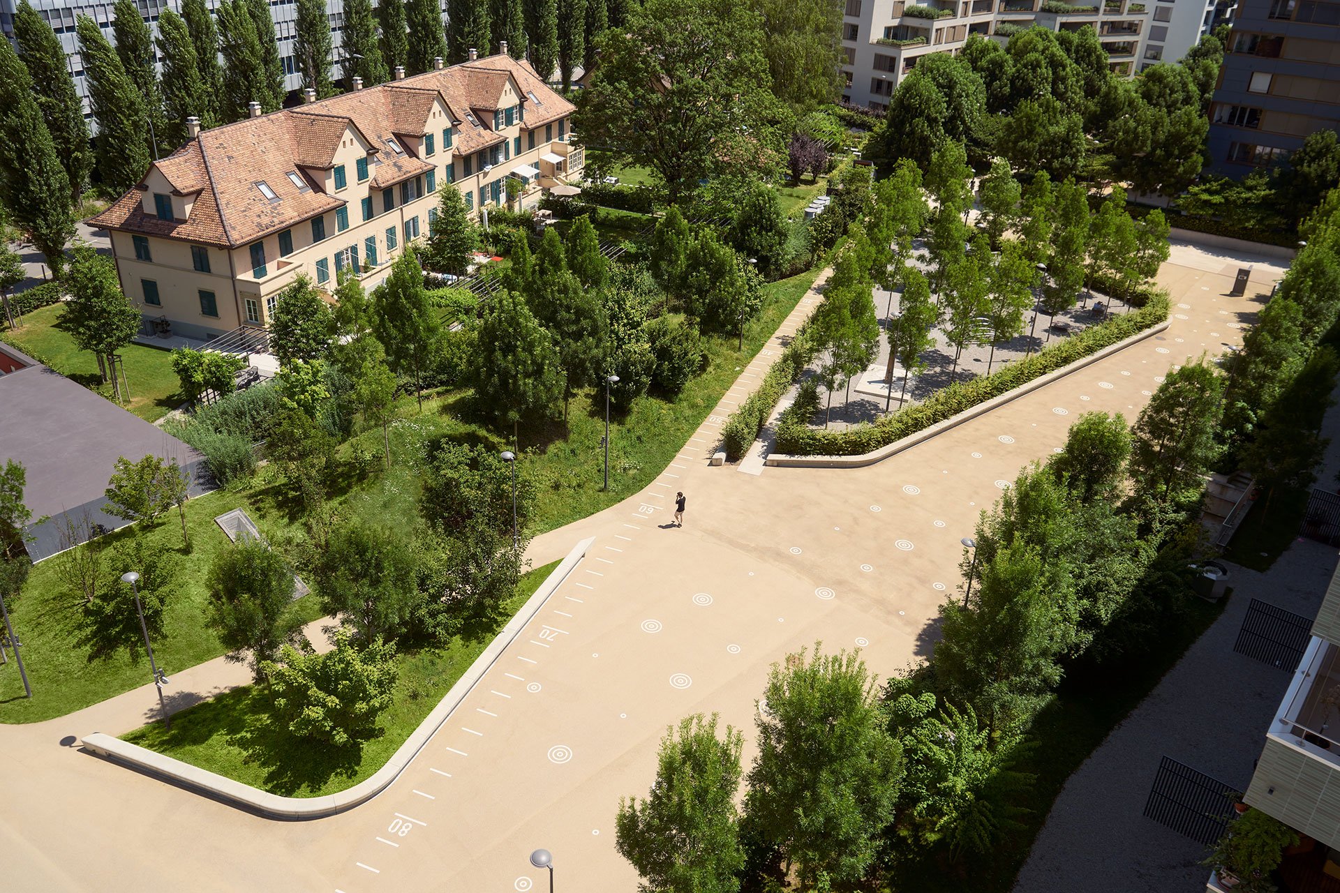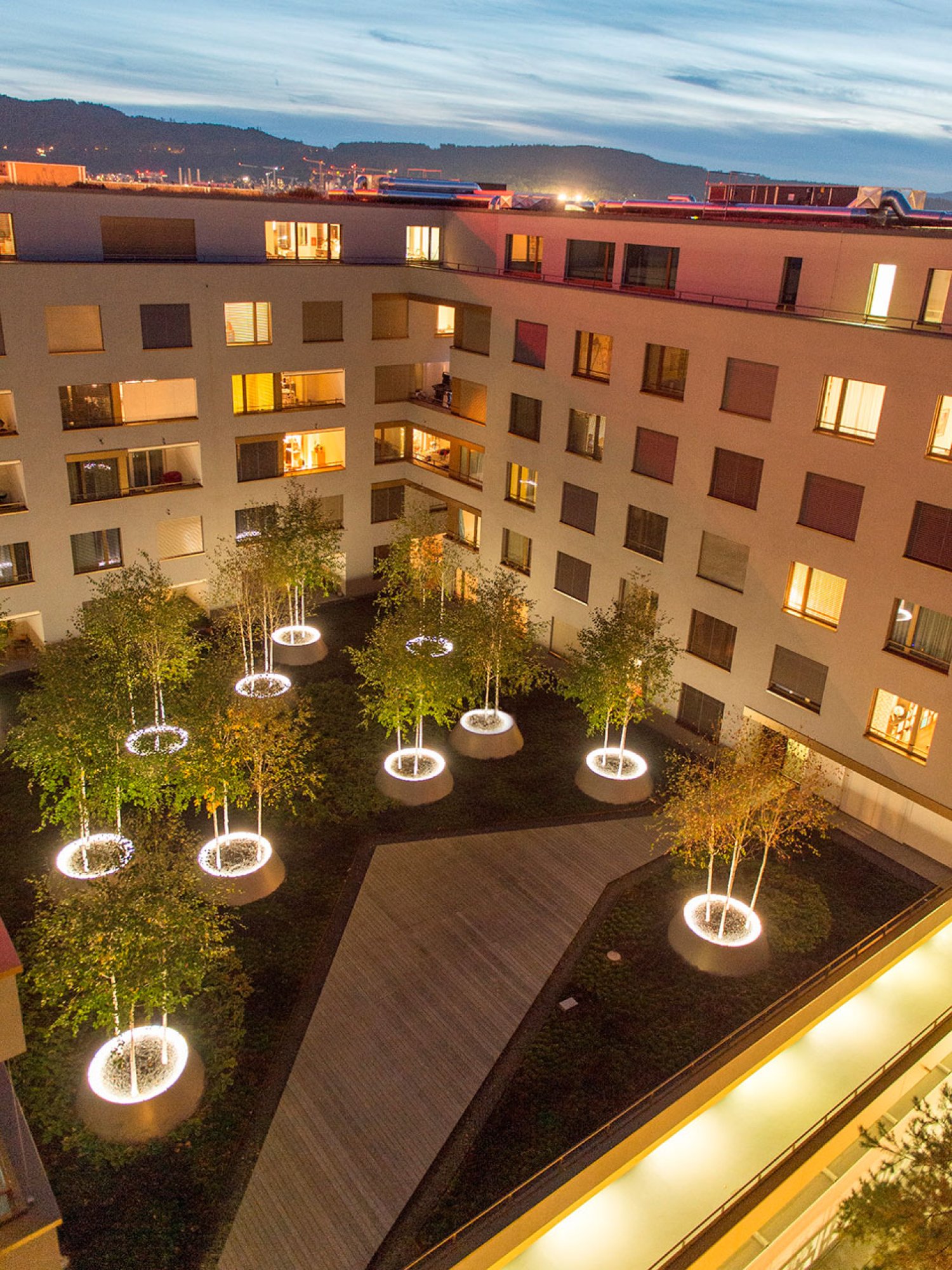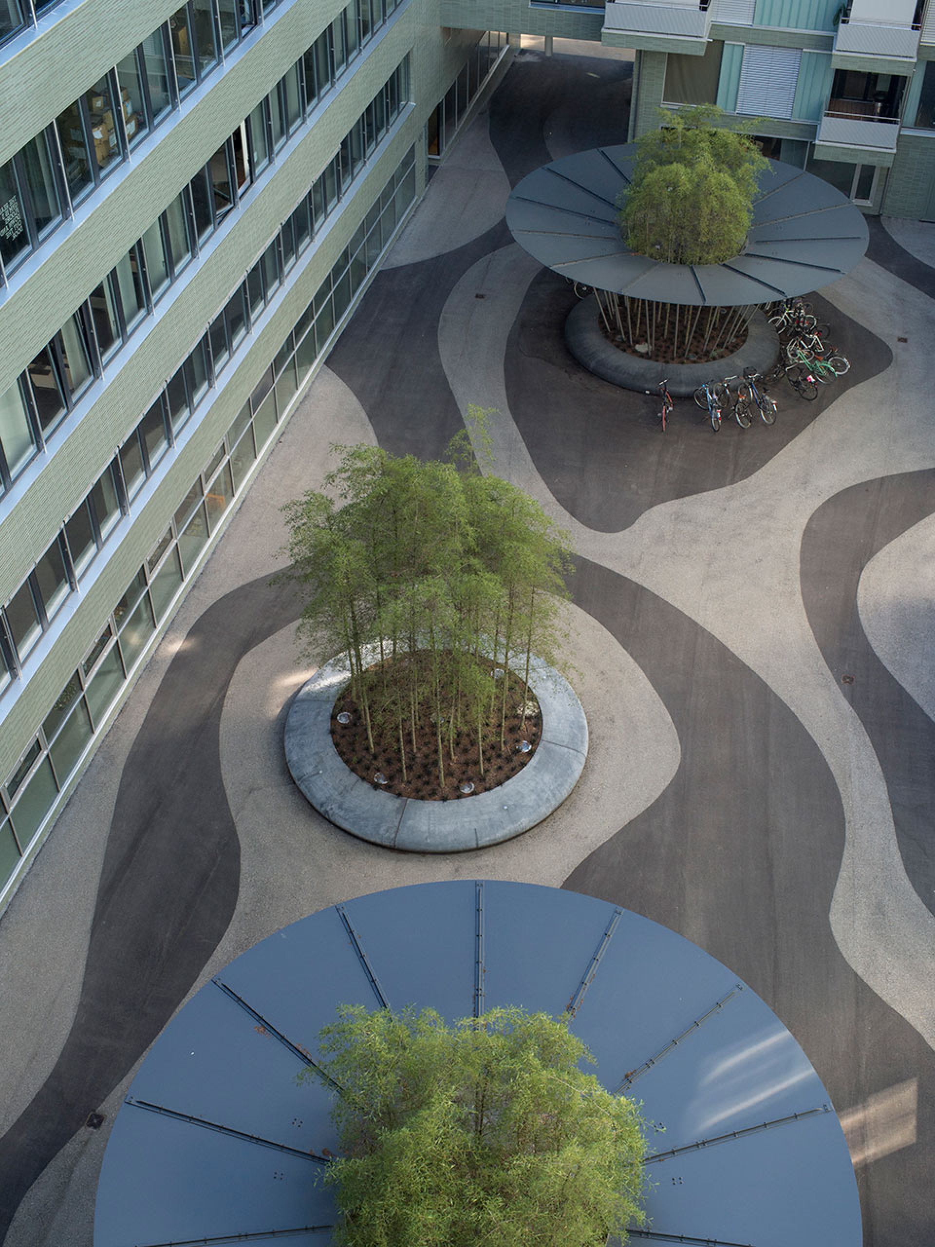 Die zelluläre Grundstruktur der Neubauten setzt sich im Freiraum fort. Freiraumzellen und Zirkulationsflächen verbinden sich zu einer integrativen Vielfalt: Wohnliche Innenhöfe, gemeinschaftliche Spielplätze, grosszügige, öffentliche Bewegungsräume und Plätze gehen fliessend ineinander über. Über die Aussenräume treten Neubauten und bestehende Bauten wie das denkmalgeschützte Ensemble der Wohnhäuser an der Förrlibuckstrasse in Beziehung zueinander. Im Kontext gewinnt die Einheit aus Alt und Neu an Identität.