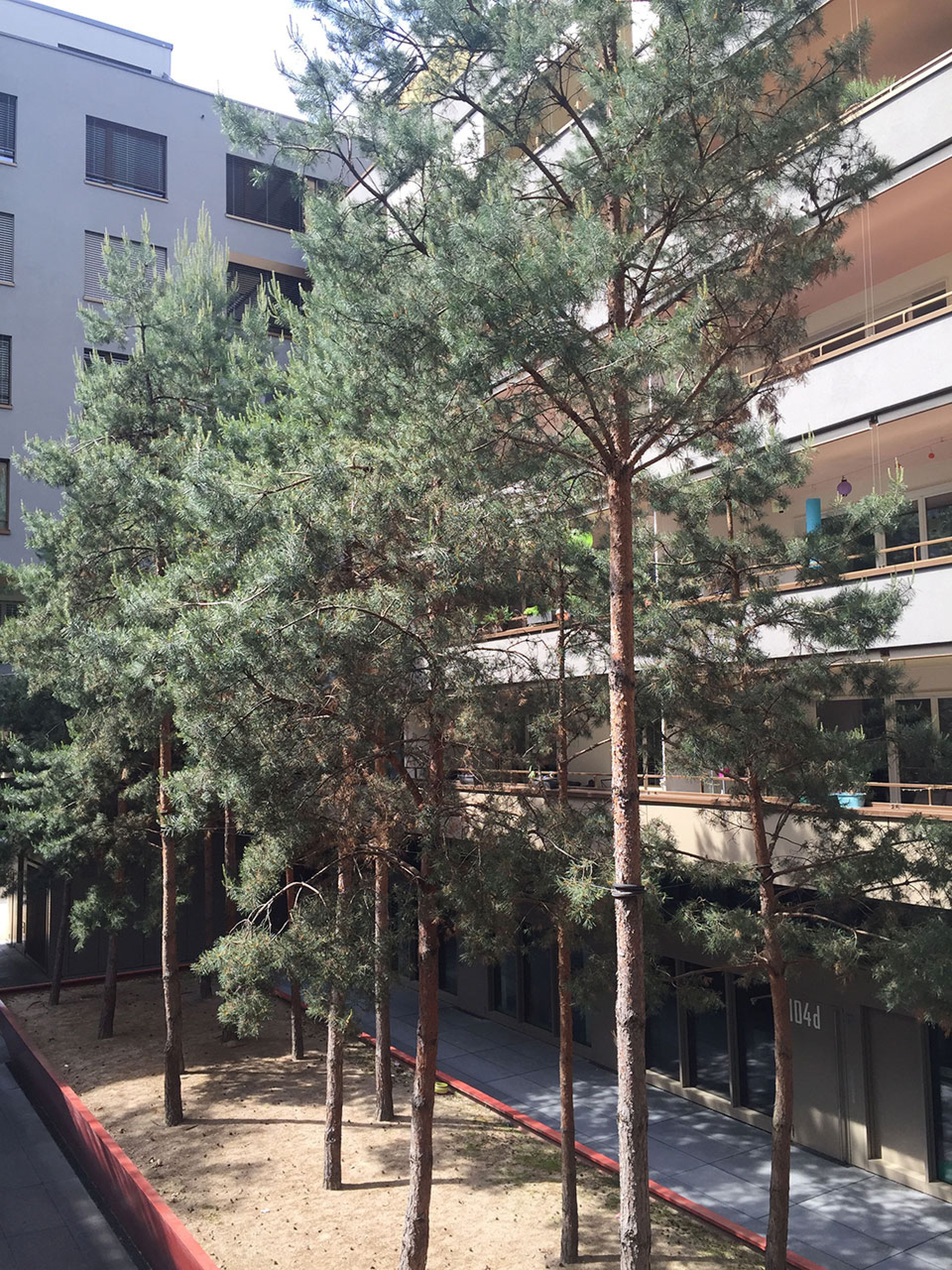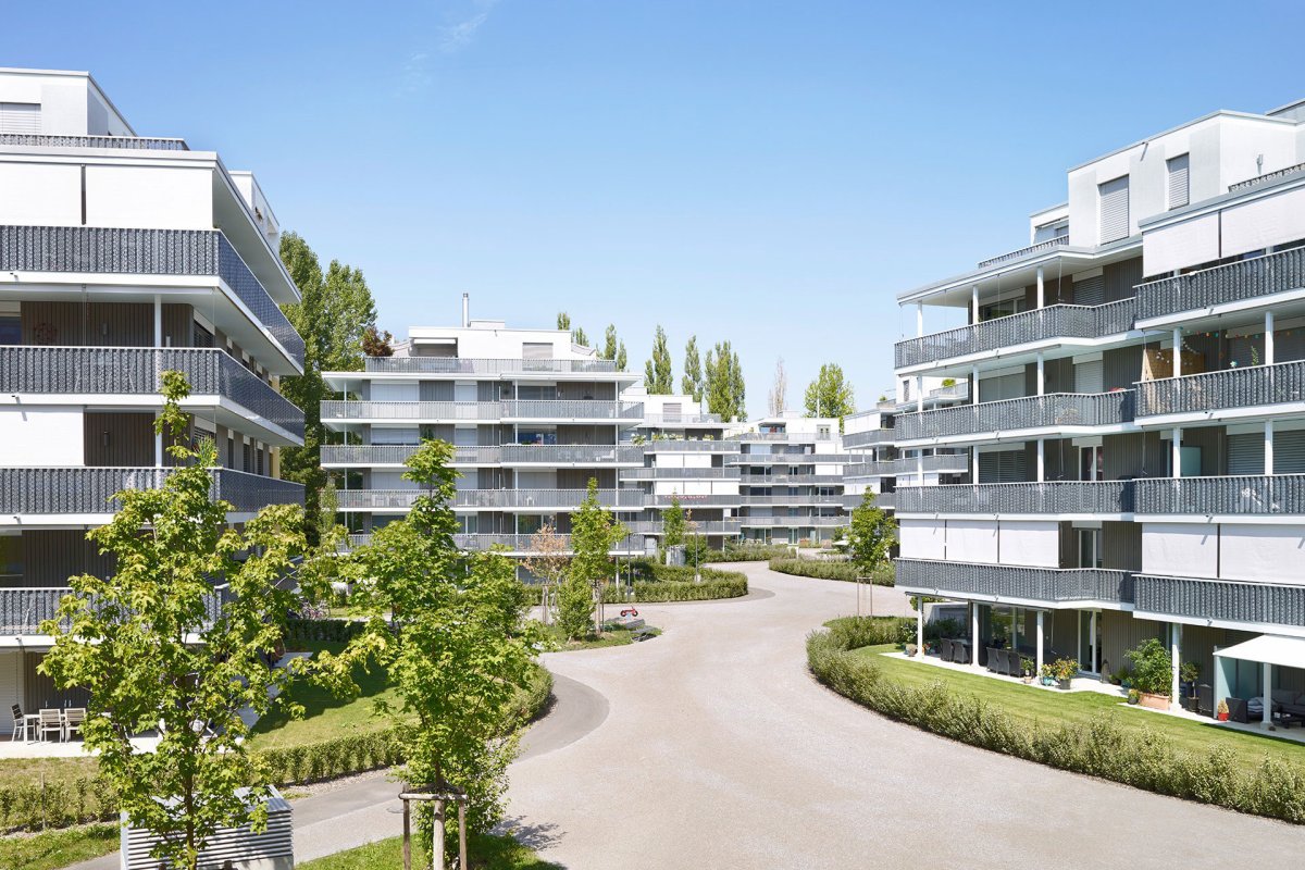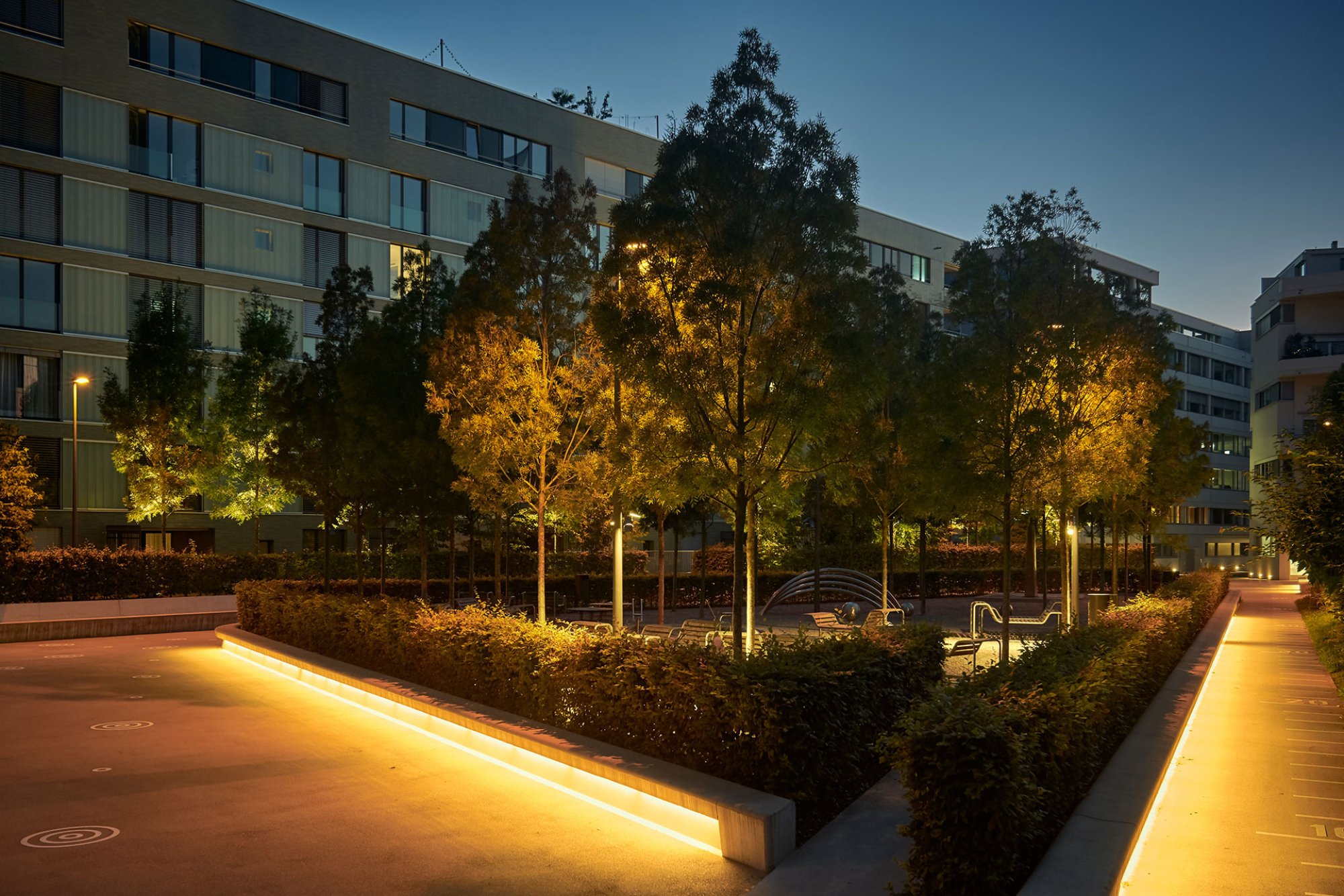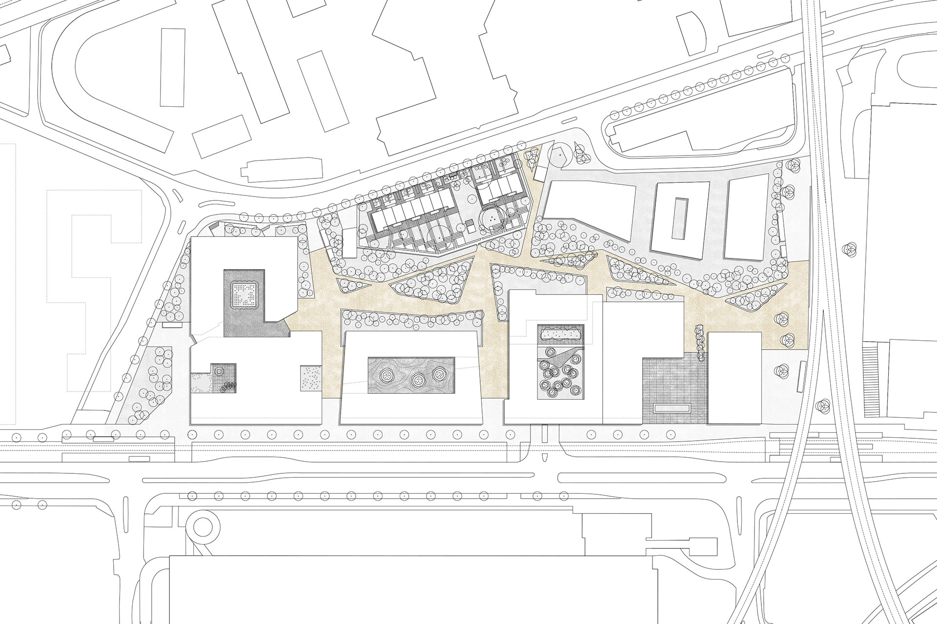Die zelluläre Grundstruktur der Neubauten setzt sich im Freiraum fort. Freiraumzellen und Zirkulationsflächen verbinden sich zu einer integrativen Vielfalt: Wohnliche Innenhöfe, gemeinschaftliche Spielplätze, grosszügige, öffentliche Bewegungsräume und Plätze gehen fliessend ineinander über. Über die Aussenräume treten Neubauten und bestehende Bauten wie das denkmalgeschützte Ensemble der Wohnhäuser an der Förrlibuckstrasse in Beziehung zueinander. Im Kontext gewinnt die Einheit aus Alt und Neu an Identität.