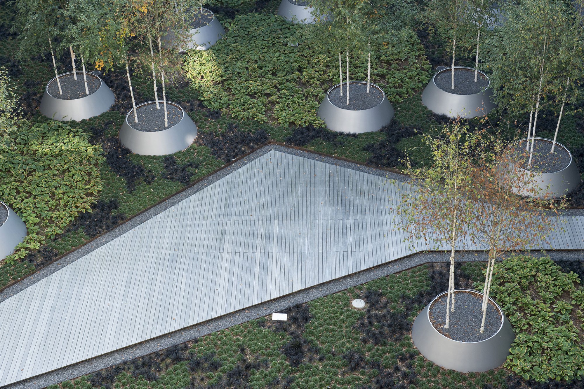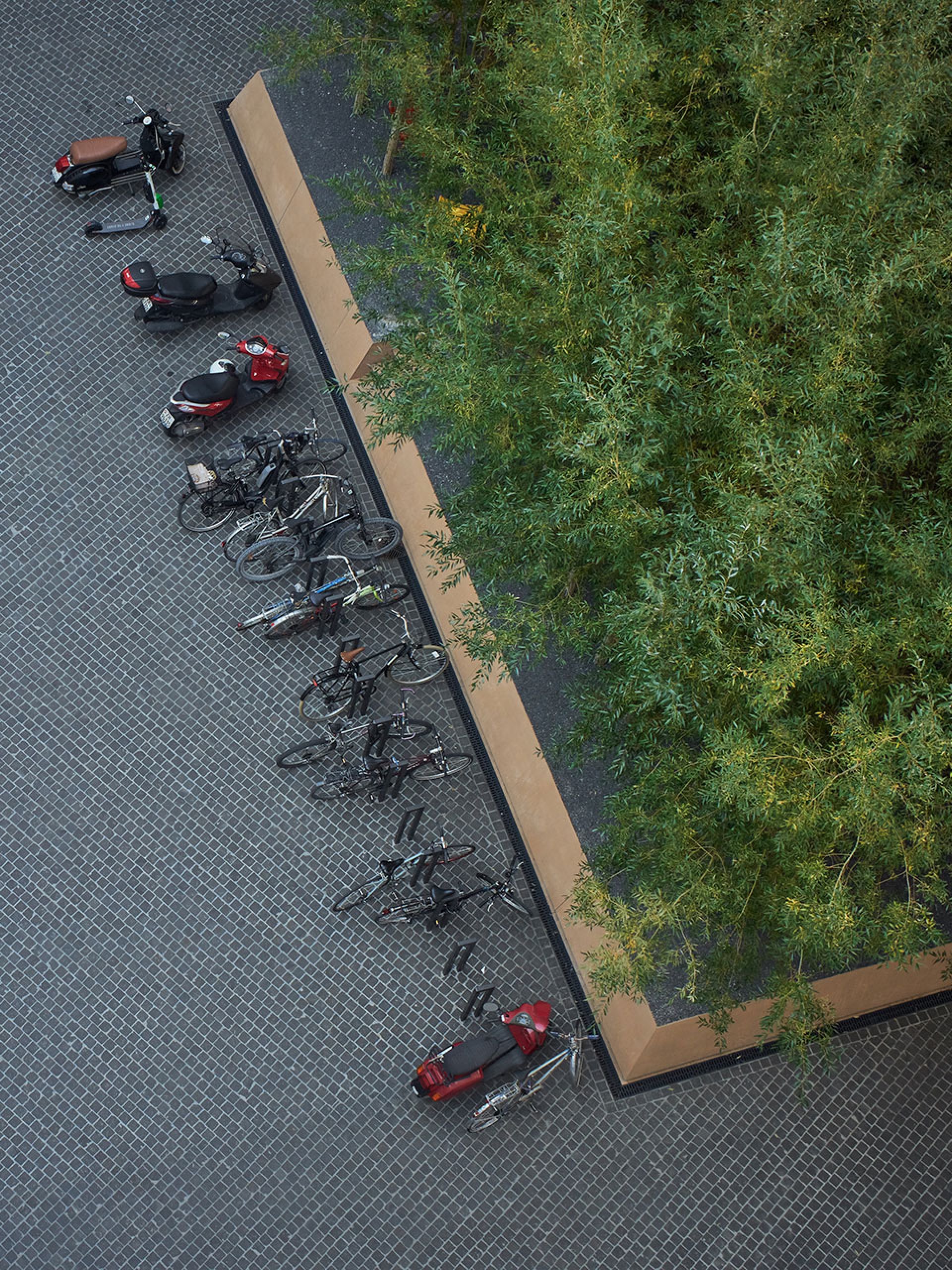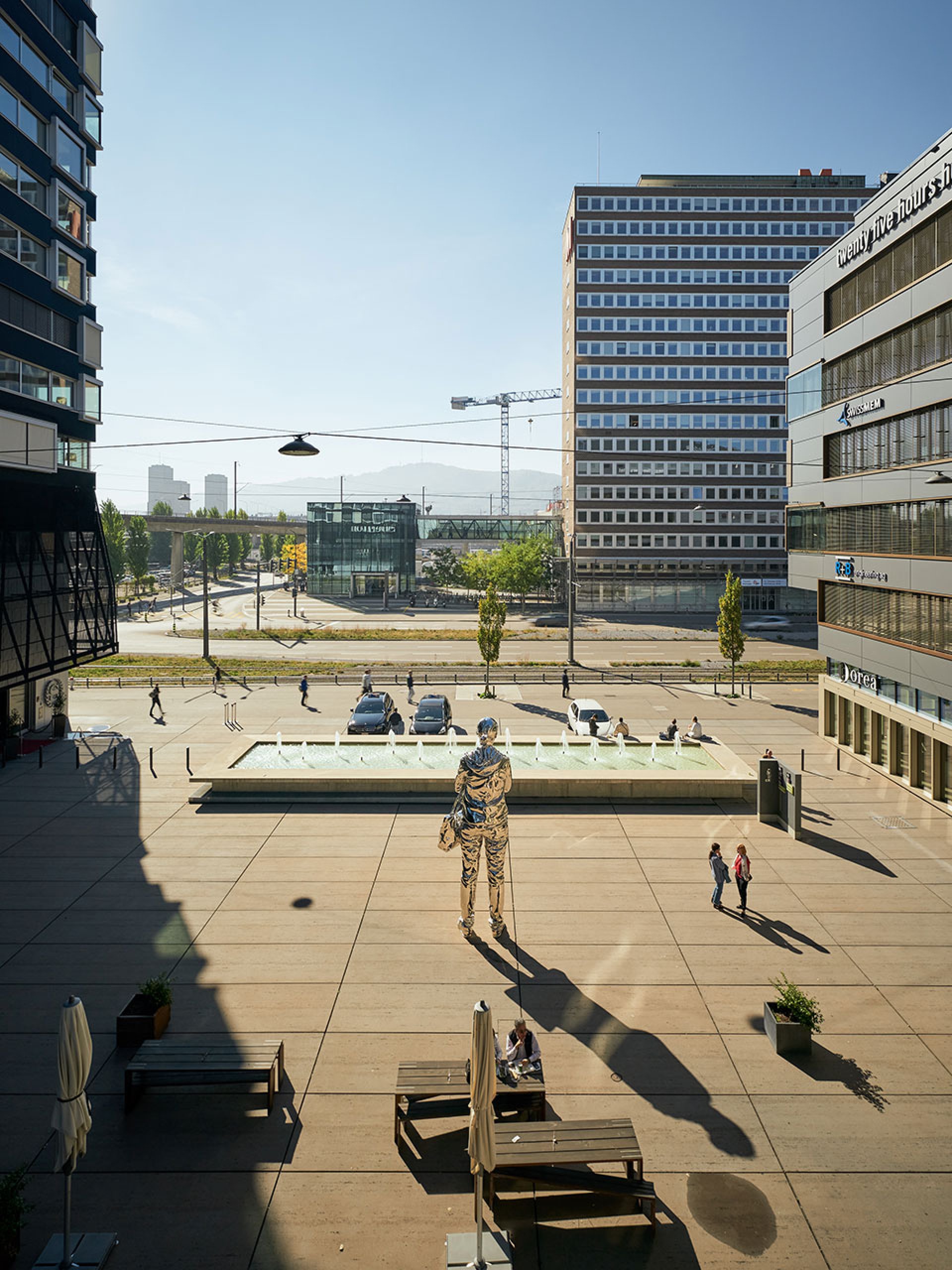 Übergreifende Elemente, vor allem der Bodenbelag, verbinden die artifizielle Stadt-Landschaft. Dagegen differenzieren sich die Aussenraum-Zellen in ihrer Atmosphäre und Detailgestaltung zu spezifischen Orten. Gegensätzliche Räume und Stimmungen schaffen ein spürbares Spannungsfeld. Das freiräumliche Beziehungsnetz, das vom Kleinen zum Grossen, von der nächsten Nachbarschaft bis zur umgebenden Stadt reicht, füllt die Leere zwischen den Grossformen mit Atmosphäre und Leben.