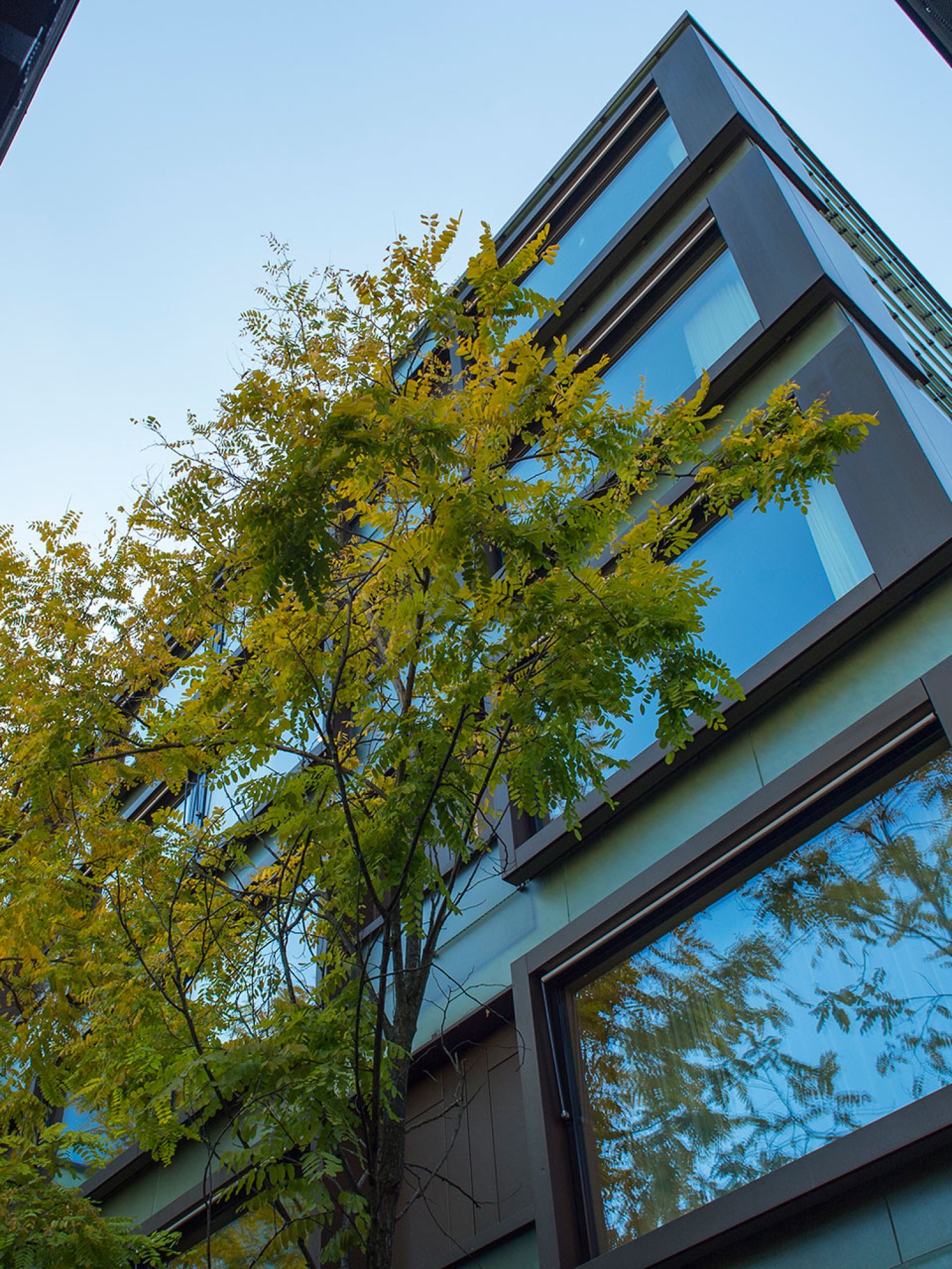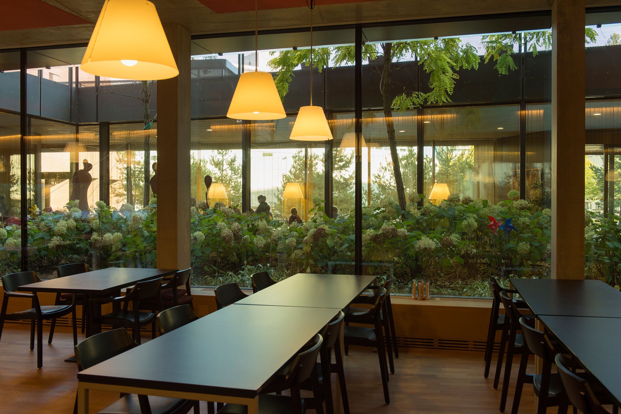 Ein grünes Atrium im Erdgeschoss bringt Tageslicht und die Jahreszeiten in die Cafeteria. Schnurbäume verbinden zwischen den Geschossen: Ihre markanten Stämme stehen im Grün des Atriums, ihre hellen Kronen ragen hinauf zu den Dachgärten, geschützten Bereichen für demenzkranke Bewohner, die architektonisch den Übergang von Alt- zu Neubau markieren.