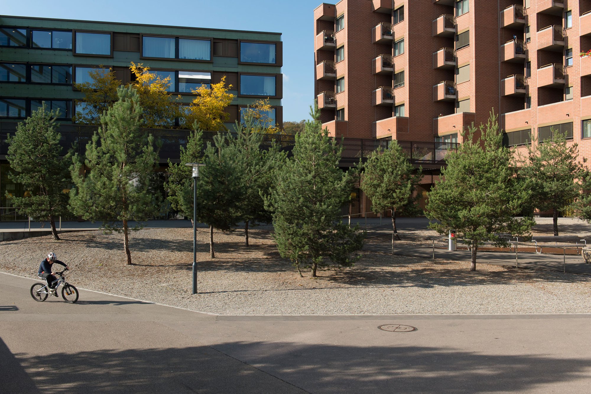 Die Vielfalt der Wohnformen und Ansprüche des Alterszentrums spiegelt sich in der Vielgestaltigkeit der Aussenräume. Im Zuge der Erweiterung wurden sie neu organisiert. Ein Kiesplatz im lichten Kiefernschatten bildet das öffentliche Entrée und bietet Begegnungsraum zwischen Heimleben und öffentlichem Leben. Fliessend geht der Platz in die eigentliche Eingangspartie mit ihren grossflächigen Ortbetonplatten über. Als Mittler zwischen Aussen- und Innenraum bietet dieser Bereich Platz für das Aussencafé.