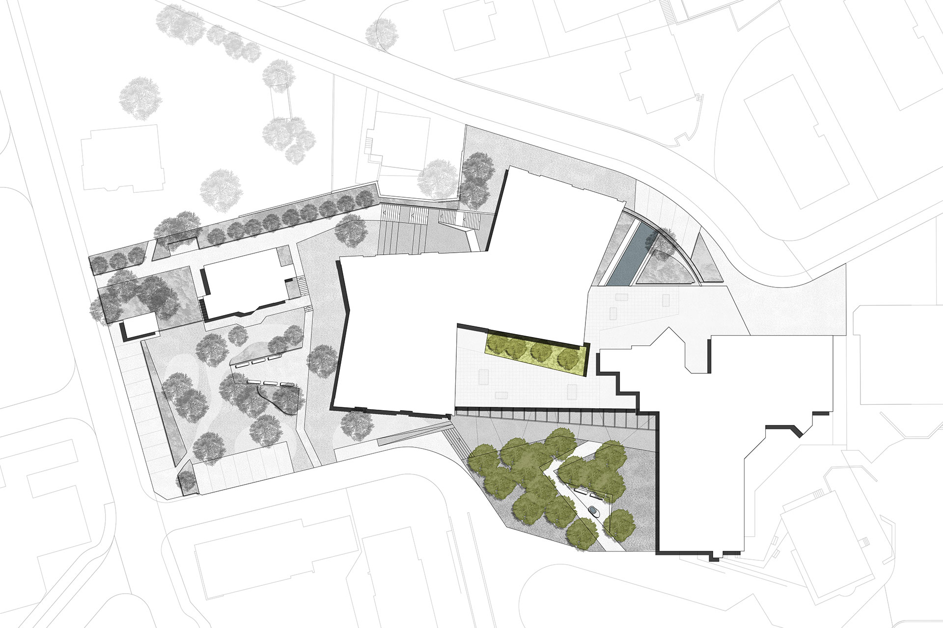 Nach hinten bietet der Wasserhof mit seinen Gräsern und spiegelnden Wasserflächen attraktiven Ausblick. Seitlich, zwischen dem Alterszentrum und der Musikschule vernetzt ein kleiner Park mit altersgerechtem Grünraum, lockerem Baumbestand und Sitzgelegenheiten das Areal mit dem umliegenden Quartier. Fliessend gehen alt und neu, privat und öffentlich, grün und grau, hart und weich in einander über. Auf kleinem Raum entsteht eine Vielfalt von Orten und Stimmungen für Nutzer mit unterschiedlicher Mobilität und individuellen Bedürfnissen.