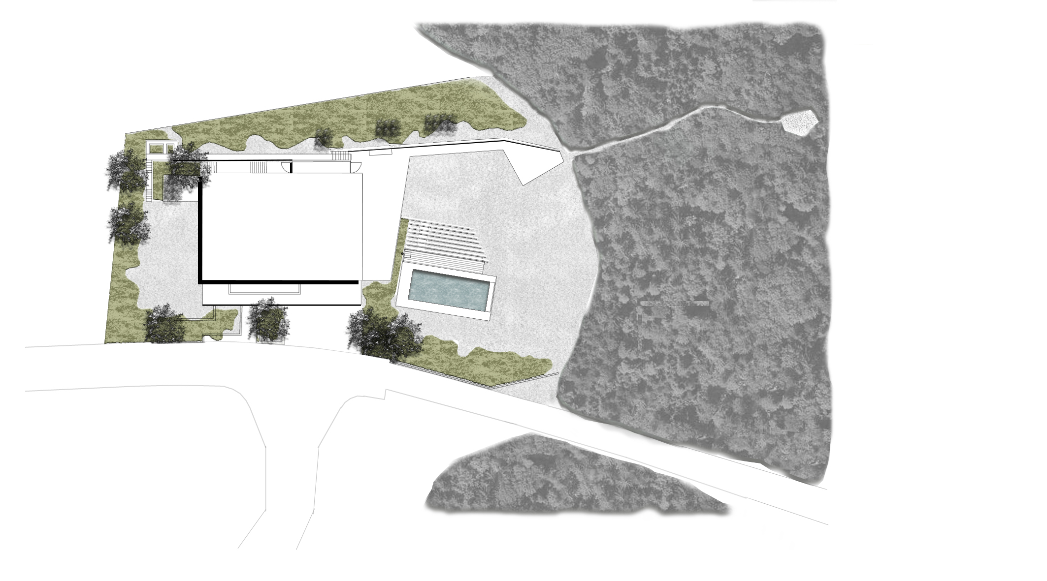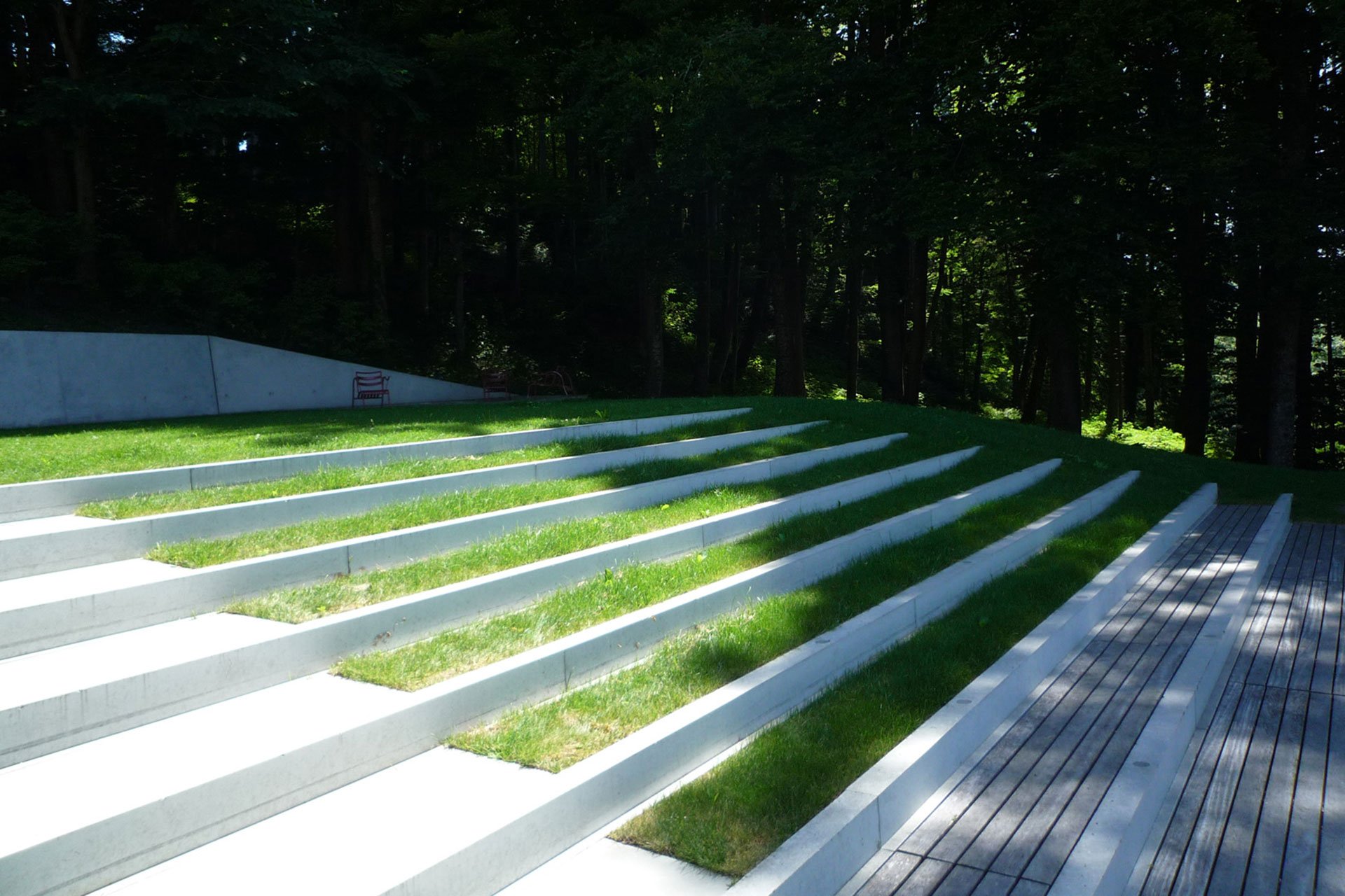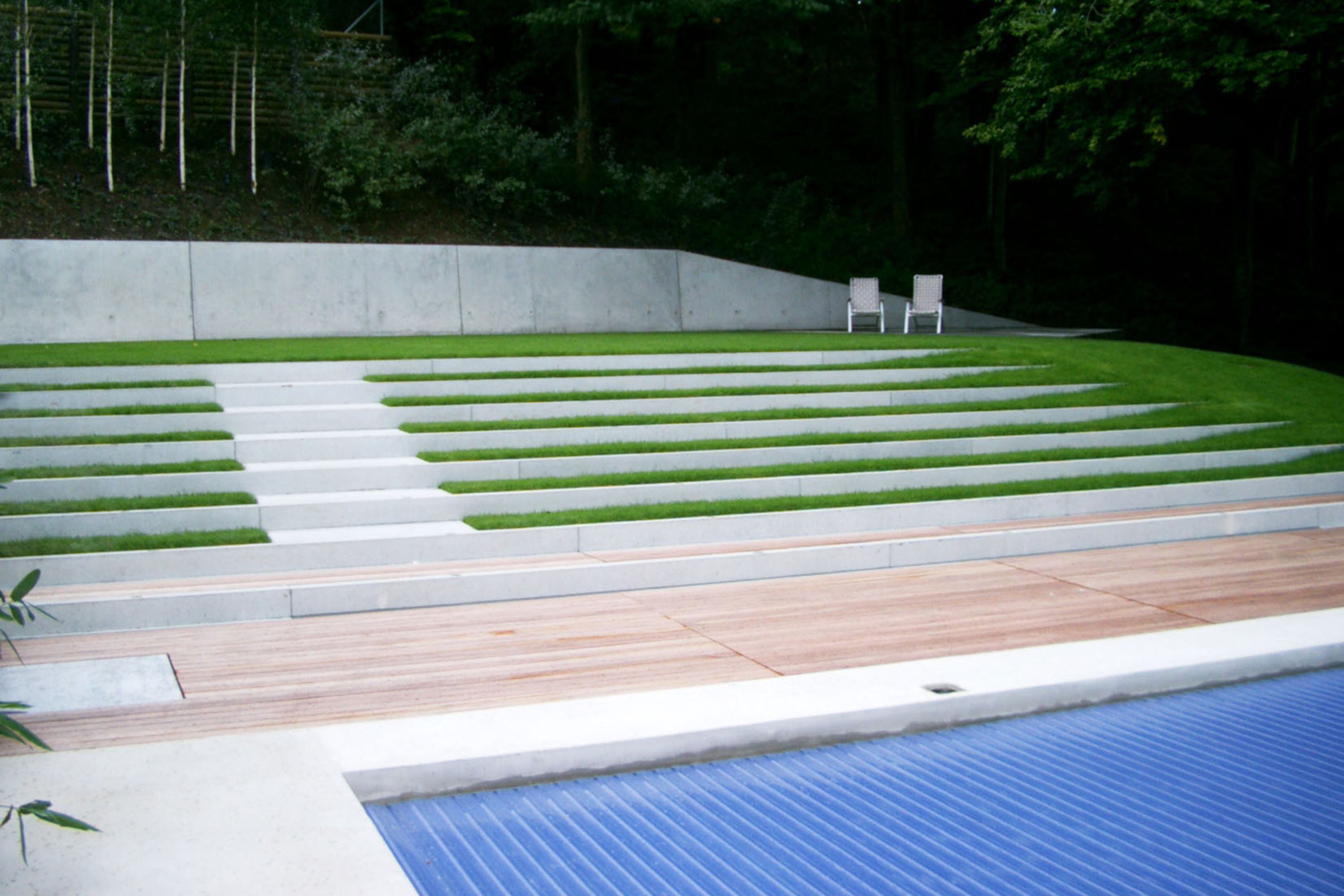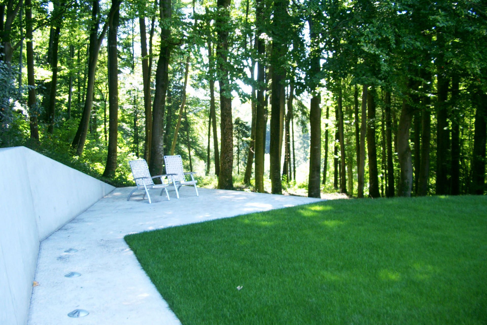 Ein schmaler Gartensaum umfliesst das Gebäude beidseitig und öffnet einen intimen Gartenraum gegen Westen. Diese Raumstruktur bildet den Ausgangspunkt für die konzeptionelle Weiterführung des Gartenthemas. Im Gegensatz zur statischen Qualität des Gebäudes wird die unmittelbare Umgebung dynamisiert. Die bewegte Topografie ist in die präzise Ausformung von Gartenräumen miteinbezogen, der Pool und seine Schnittstellen sind überarbeitet. Eingangszone und Ränder verstärkt. Die peripheren Übergangsbereiche zu den Nachbargrundstücken sind durch Vegetationsstrukturen saumartig verdichtet, die Ausblicke von Innenräumen in Gartensequenzen gegliedert. Der Wald wird in seiner Tiefe thematisiert. Der weisse Stamm der Himalayabirke zieht sich in klarem Raster durch den Garten und kontrastiert durch weisse Farbakzente.