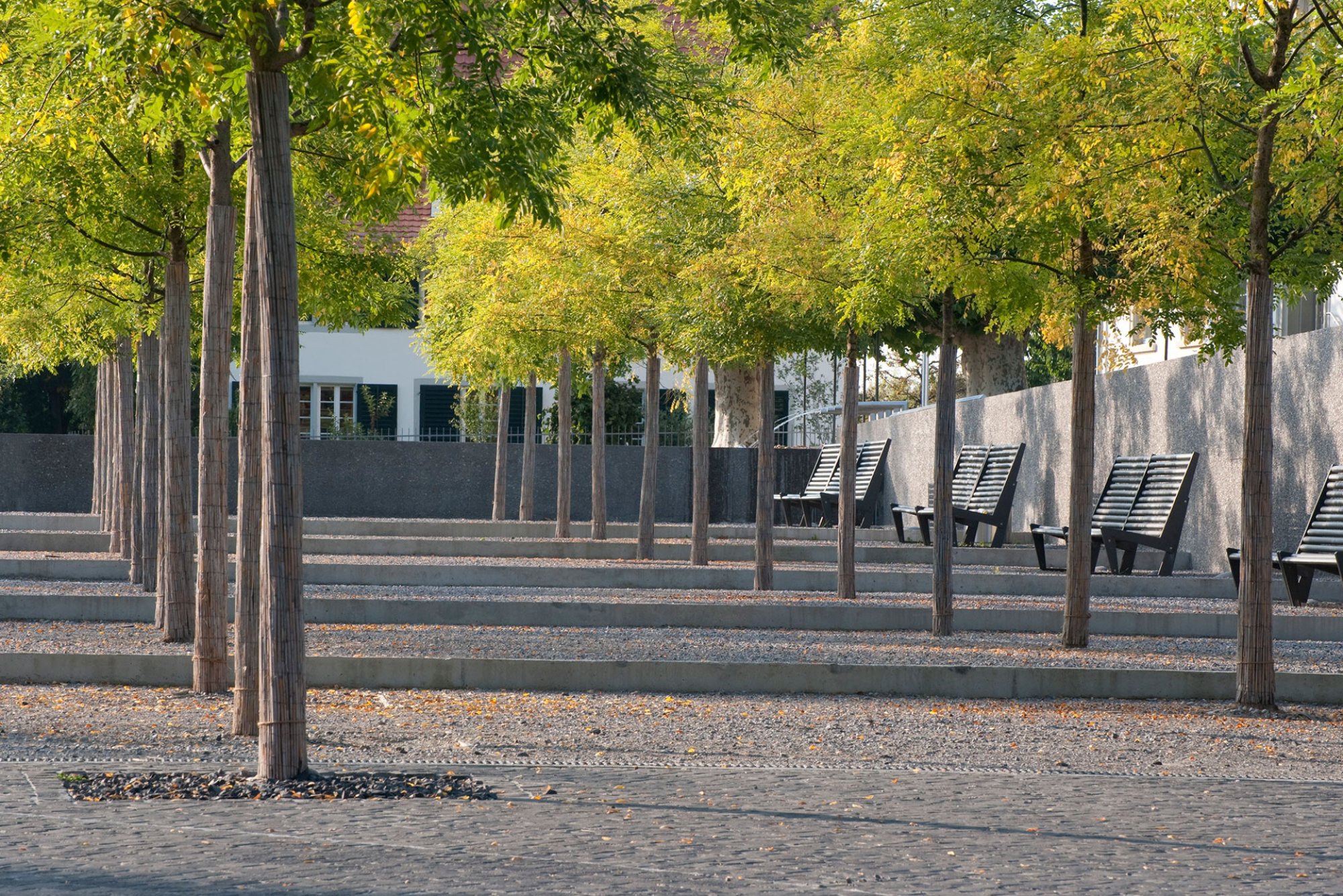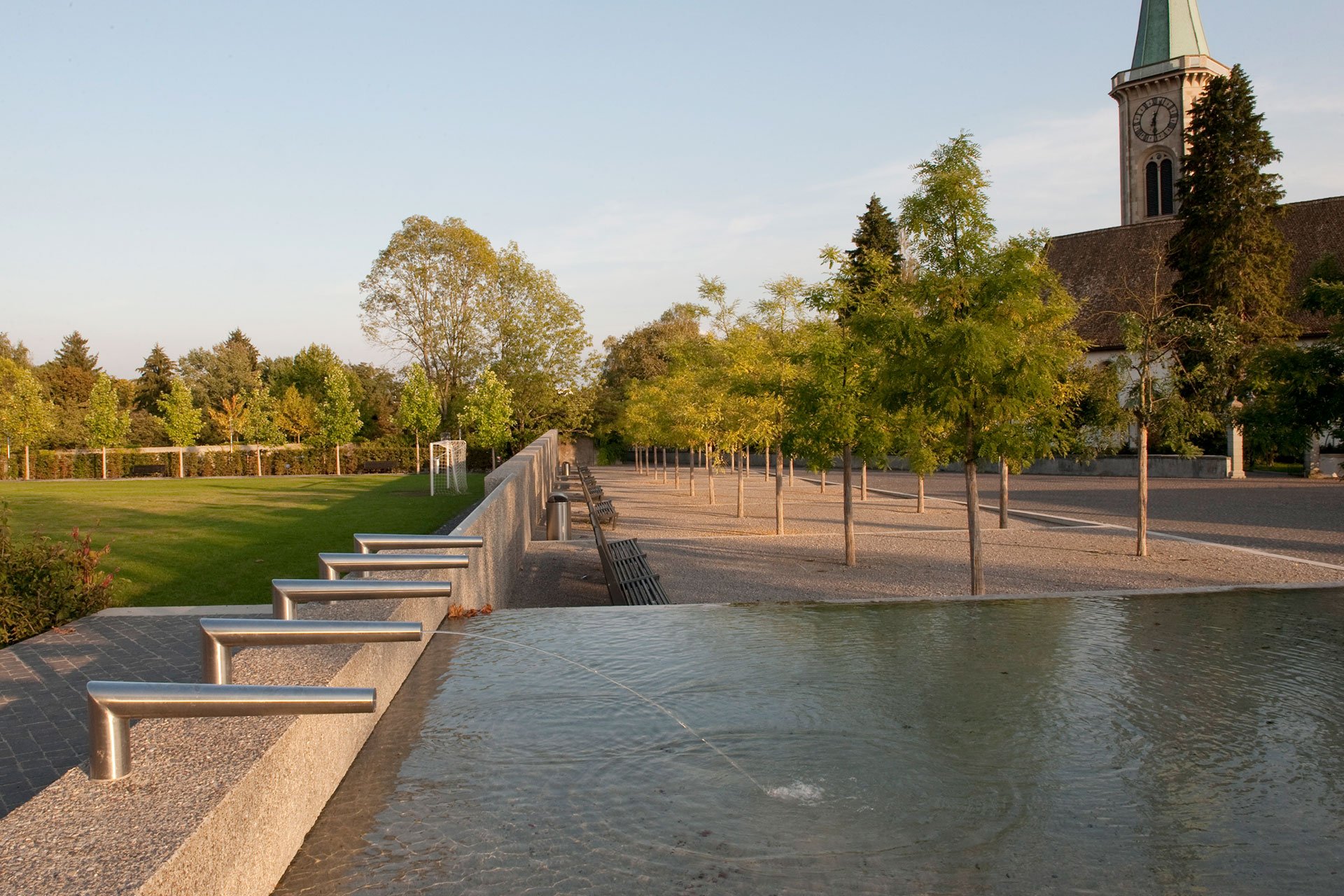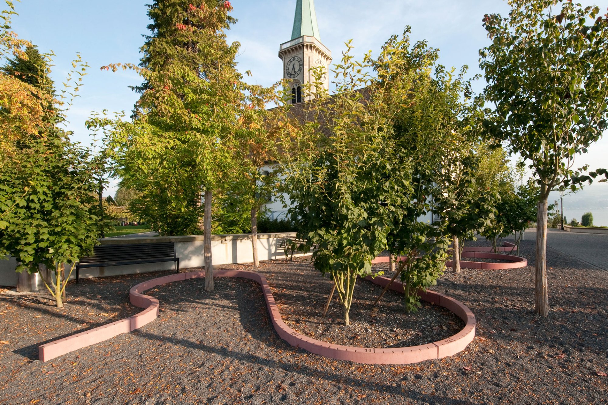 Ganz vorne an der Hangkante formt das Ensemble aus Kirche, Pfarrhaus und dem neuen Forum einen stimmungsvollen, zentralen Platz. Die drei Solitärbauten der Schule bilden mit dem Mehrzweckgebäude die Adresse des Ortes zur Kirchbühlstrasse hin und fassen die Schul-Aussenräume. Die Einzelbauten und die Schul-Freiräume verflechten sich zu einem markanten Gefüge, die Zwischenräume werden zur Zirkulationszone: Sie verbinden das Forum mit dem Schulhaus Nord, dem Mehrzweckgebäude Tränkebach und dem zentralen Parkraum Kirchbühl. Die kirchlichen Bauten werden mit der Friedhofanlage Süd und die Schule Kirchbühl Süd mit ihrem umfangreichen Freiraumangebot sowie dem nördlichen Teil des Friedhofes verbunden.