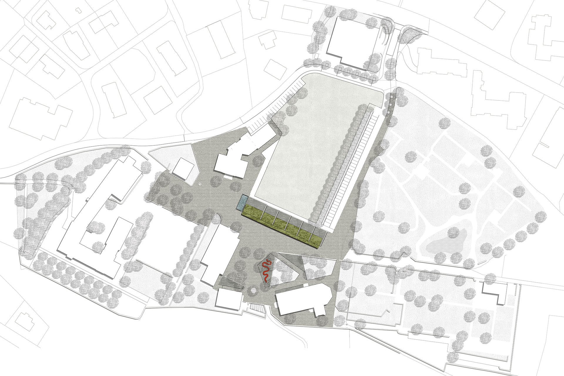 Statt zu vereinheitlichen, kultiviert der Aussenraumentwurf die Unterschiede und schafft so einen vielfältigen Ort des öffentlichen Lebens. Einerseits, indem er die bestehenden Freiräume in ihrer Ausstrahlung stärkt. Andererseits, indem er die undefinierten Räume dazwischen von der trennenden Negativform zum präzisen räumlichen Verbindungsstück uminterpretiert und so die Bezüge zwischen den verschiedenen Räumen klärt.
