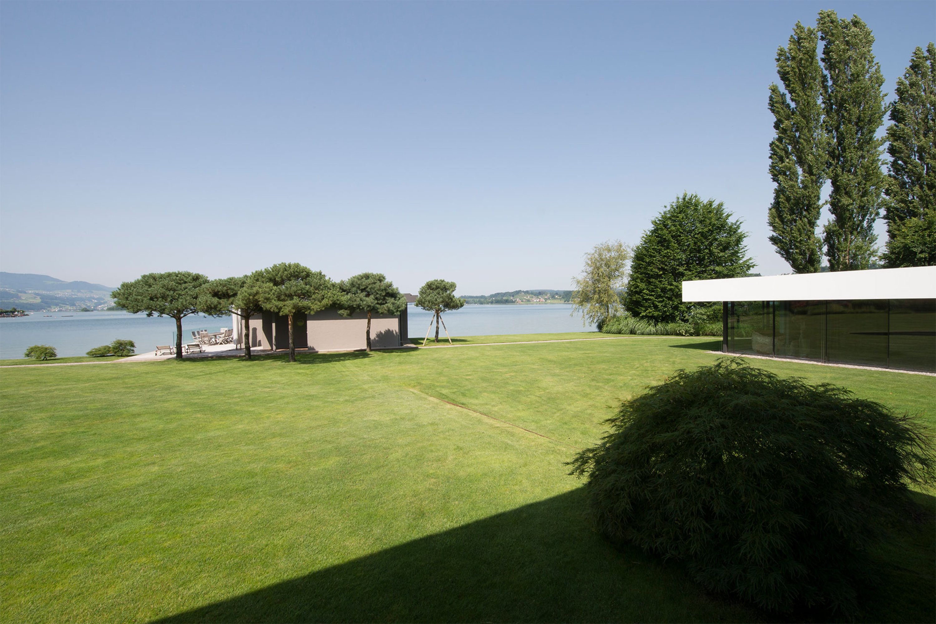 Das Thema der fliessenden Flächen zieht sich bis in den seeseitigen Garten – doch hier präsentieren sie sich im Kontrast zum Vorgarten in grösster, fein strukturierter Offenheit. Weite Rasenflächen ziehen sich vom Haus zum Wasser, den Blick fängt und lenkt die markante Föhrengruppe, die den Pavillon umfasst und das Holzdeck am Wasser beschirmt. Ein Kiesweg verbindet in feinem Schwung Wohnhaus und Pavillon. Gefasst wird er von grosszügigen, wogenden Gräser- und Vegetationsbändern, die den ganzen Garten schützend und fliessend fassen.
