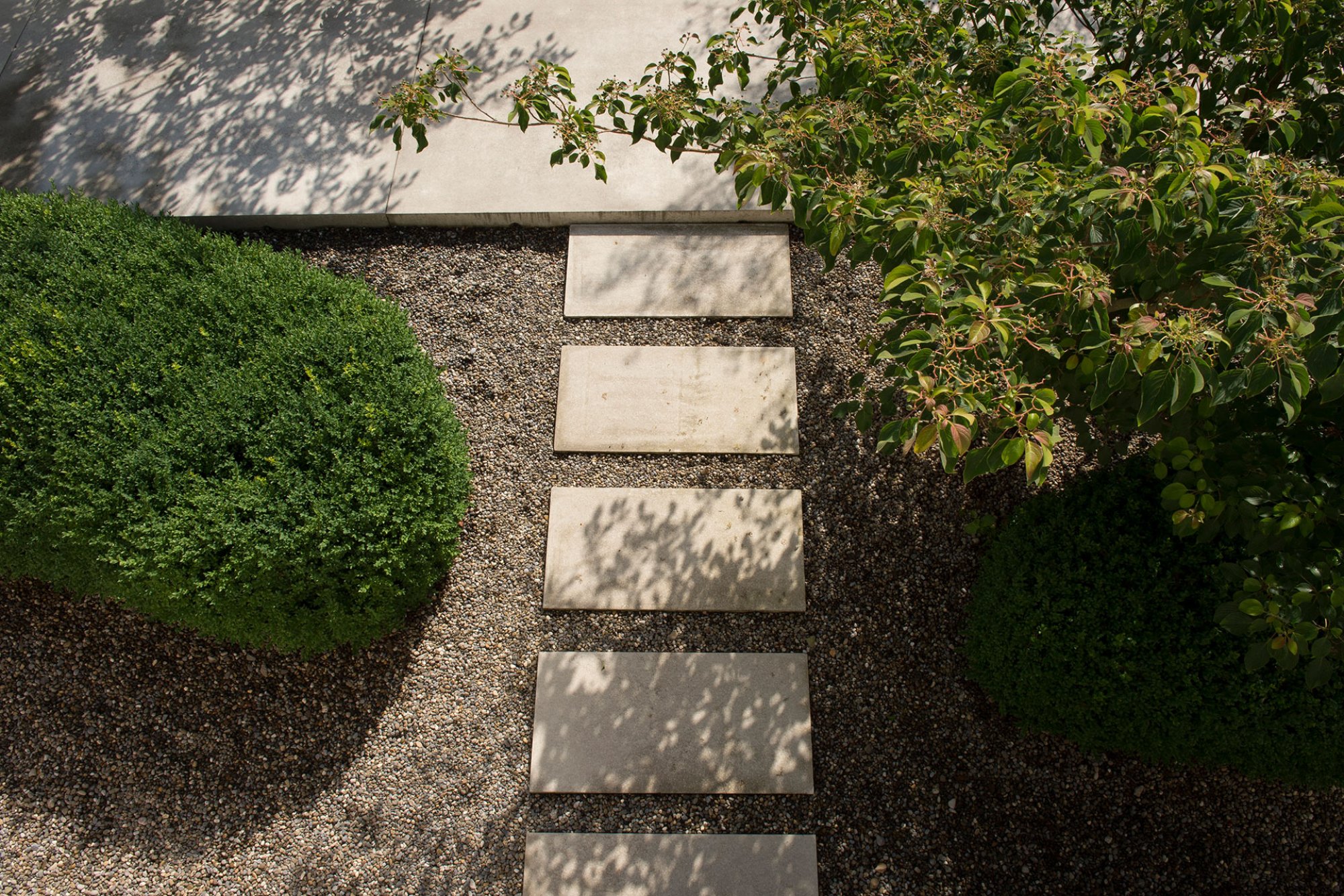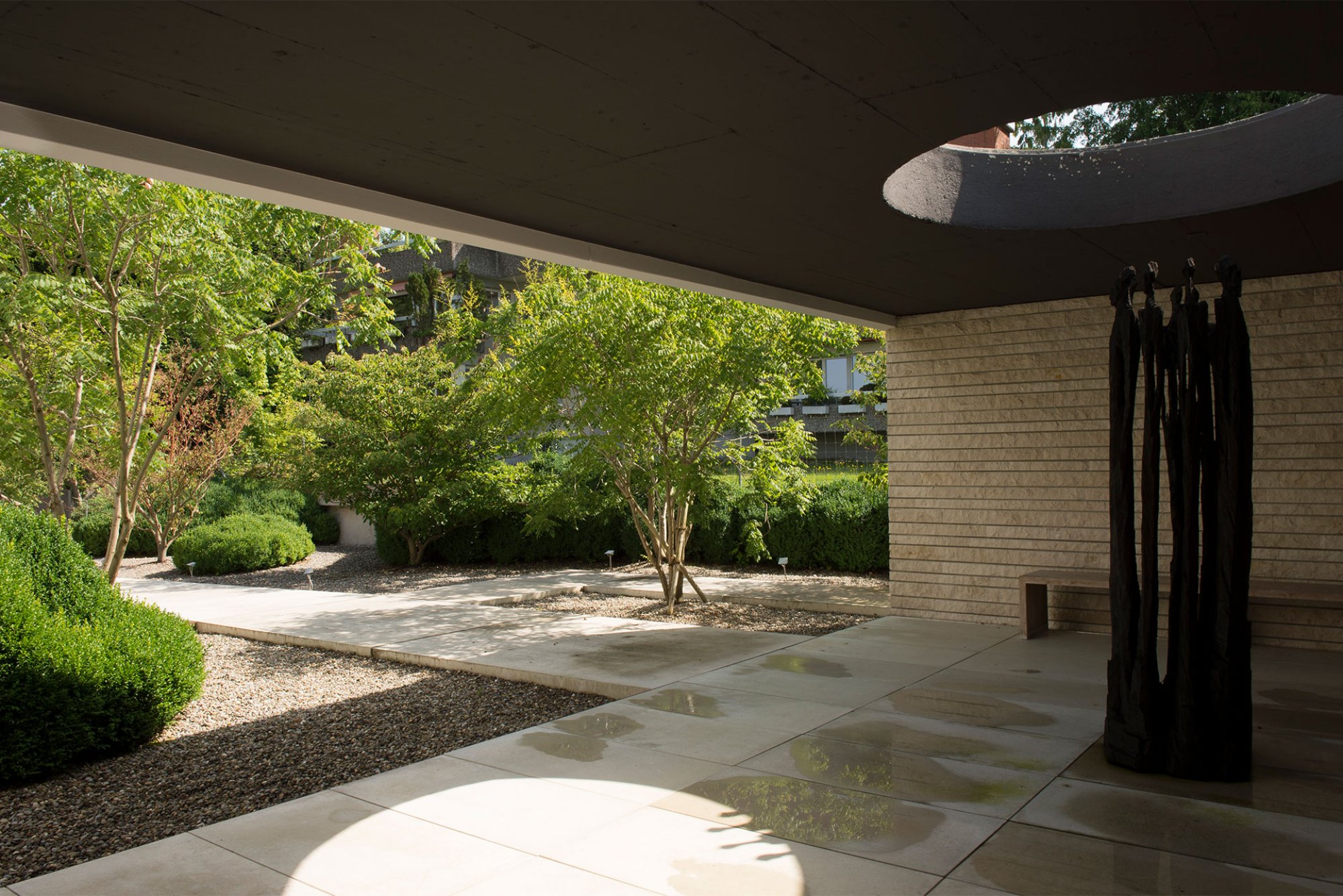 Sandfarbene Betonplatten schwimmen im Kies des Vorgartens. Vorbei an Inseln mit Vegetationskörpern und malerischen Gehölzen führen sie zum Hauseingang. Der zieht seine Anziehungskraft auch aus der Ausstrahlung der Skulptur, die hier – im Licht der kreisrunden Öffnung des Vordachs – unter freiem Himmel steht.