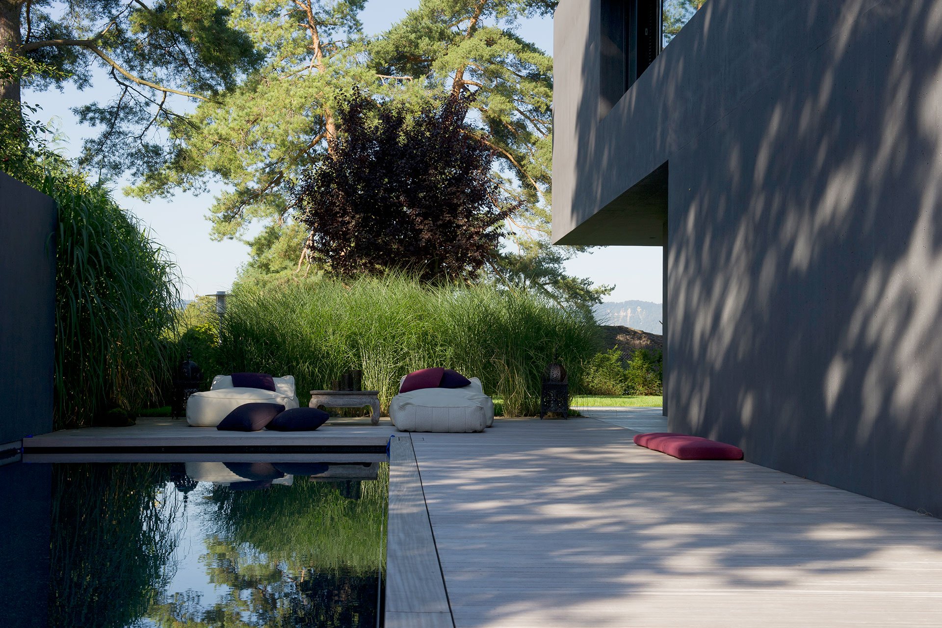 Im Plattenbelag des Entrées wachsen Zimt-Ahorne aus grünen Gräserteppichen. Hinter dem Haus geht das Holz des Pooldecks nahtlos in den Spiegel des Wasserbeckens über. Ein mediterran anmutendes Lavendelband verbindet die Rasenfläche mit dem kontemplativen Gartenteil, wo vor Ort vorgefundene Felsblöcke auf einer Kiesfläche ihre skulpturale Wirkung entfalten.