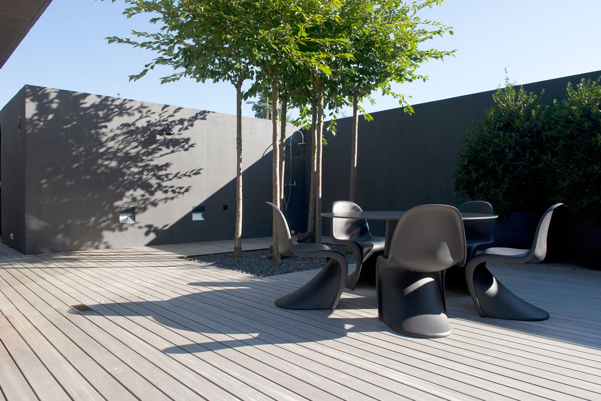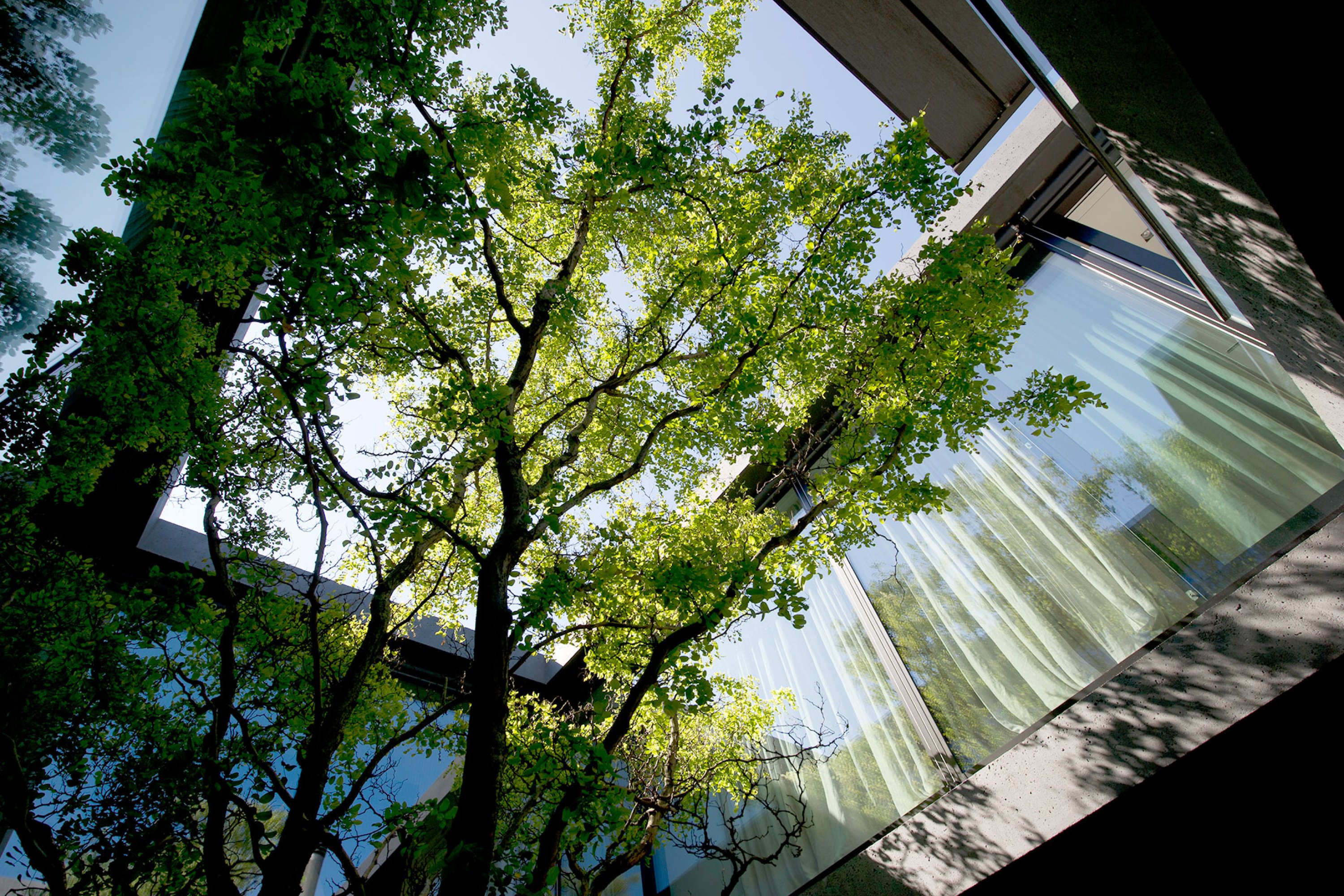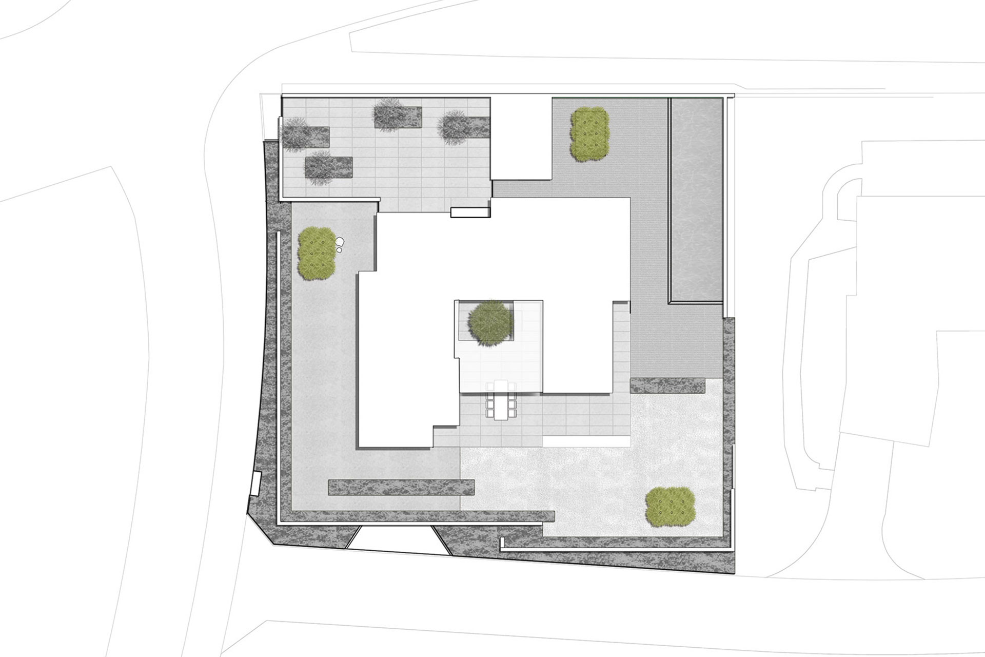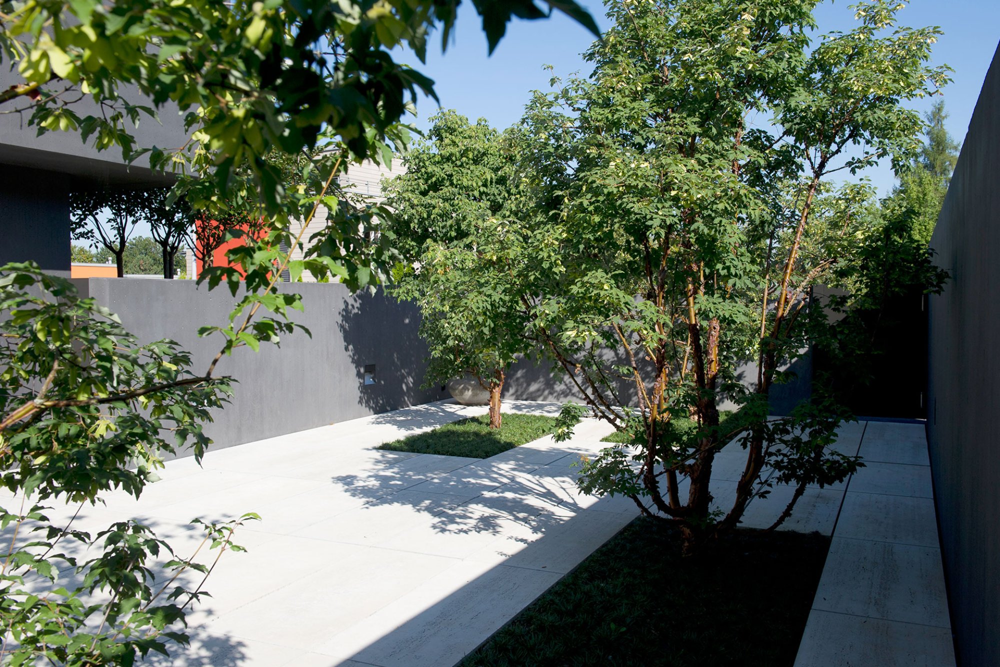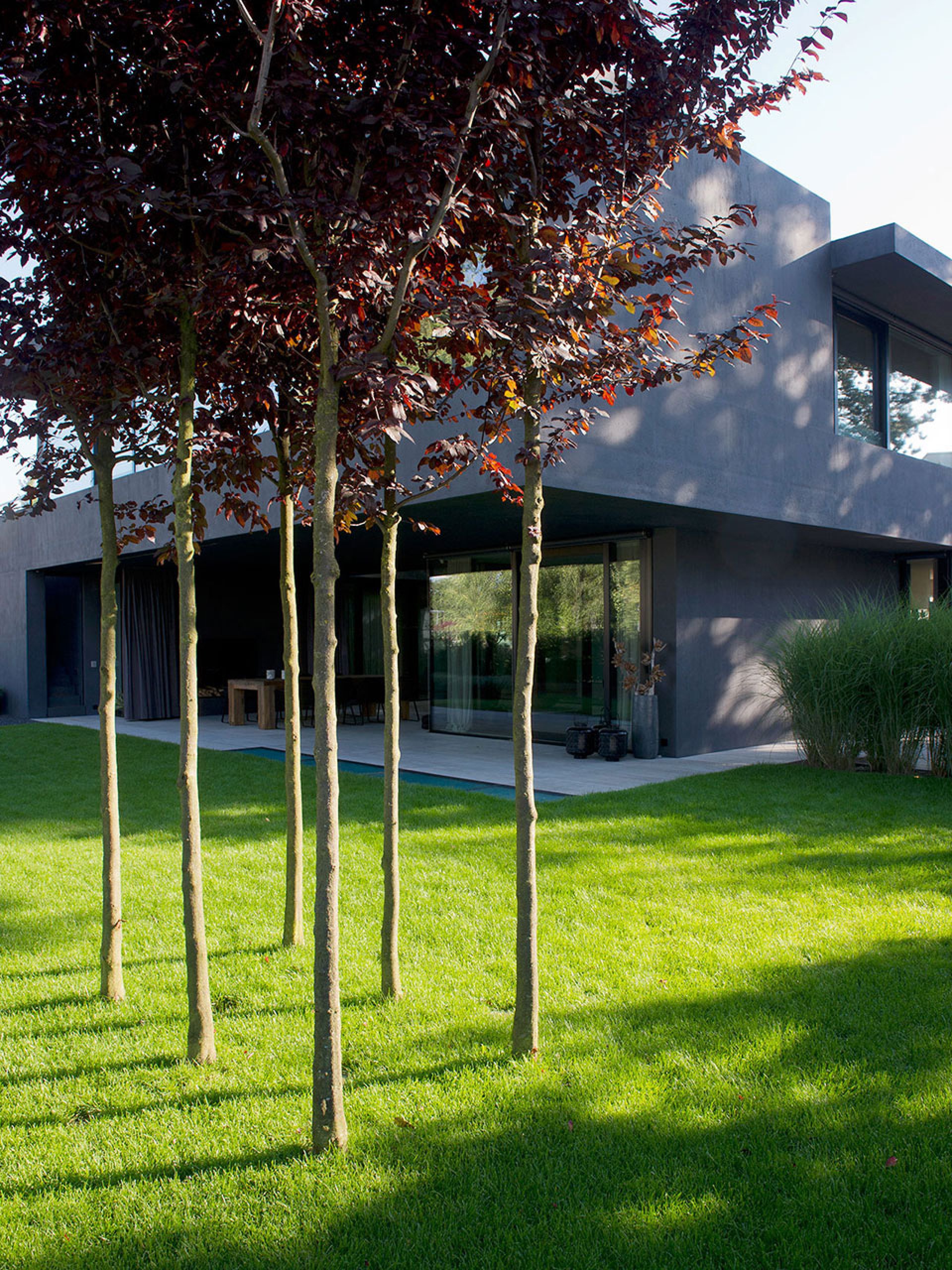 Aus dem zentralen Motiv, dem Hof mit der Korkenzieher-Akazie, entwickelt der Garten seine Formensprache. Sichtbetonmauern in der Geometrie und Materialität des Hauses definieren eine Folge von geschützten Gartenräumen als erweiterten Wohnraum. Im Sinne der Folies der Gartenkunst werden Baumgruppen als dekorative Körper eingesetzt: Serien aus je einer Baumart treten in Wechselwirkung – untereinander und mit der solitären Akazie im Lichthof. So prägen wenige vegetative Elemente den Gartenzimmern ganz unterschiedliche Atmosphären auf.