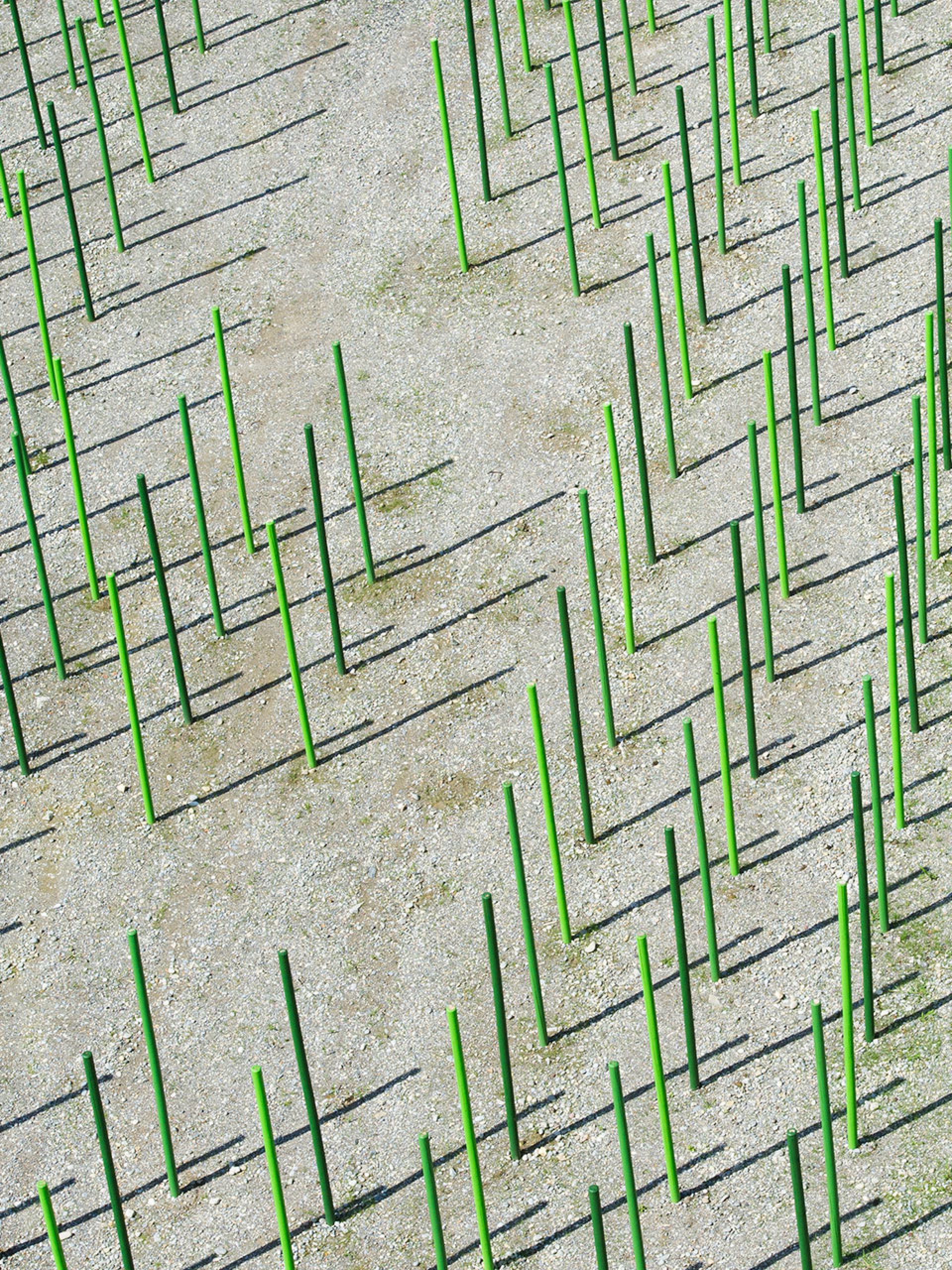 Weil der dritte Baukörper des Ensembles erst in der zweiten Bauetappe entstand, füllte eine temporäre Installation aus grünen Stangen mit ihrer Raumwirkung und ihrem spannenden Schattenbild die kurzzeitige Leere.