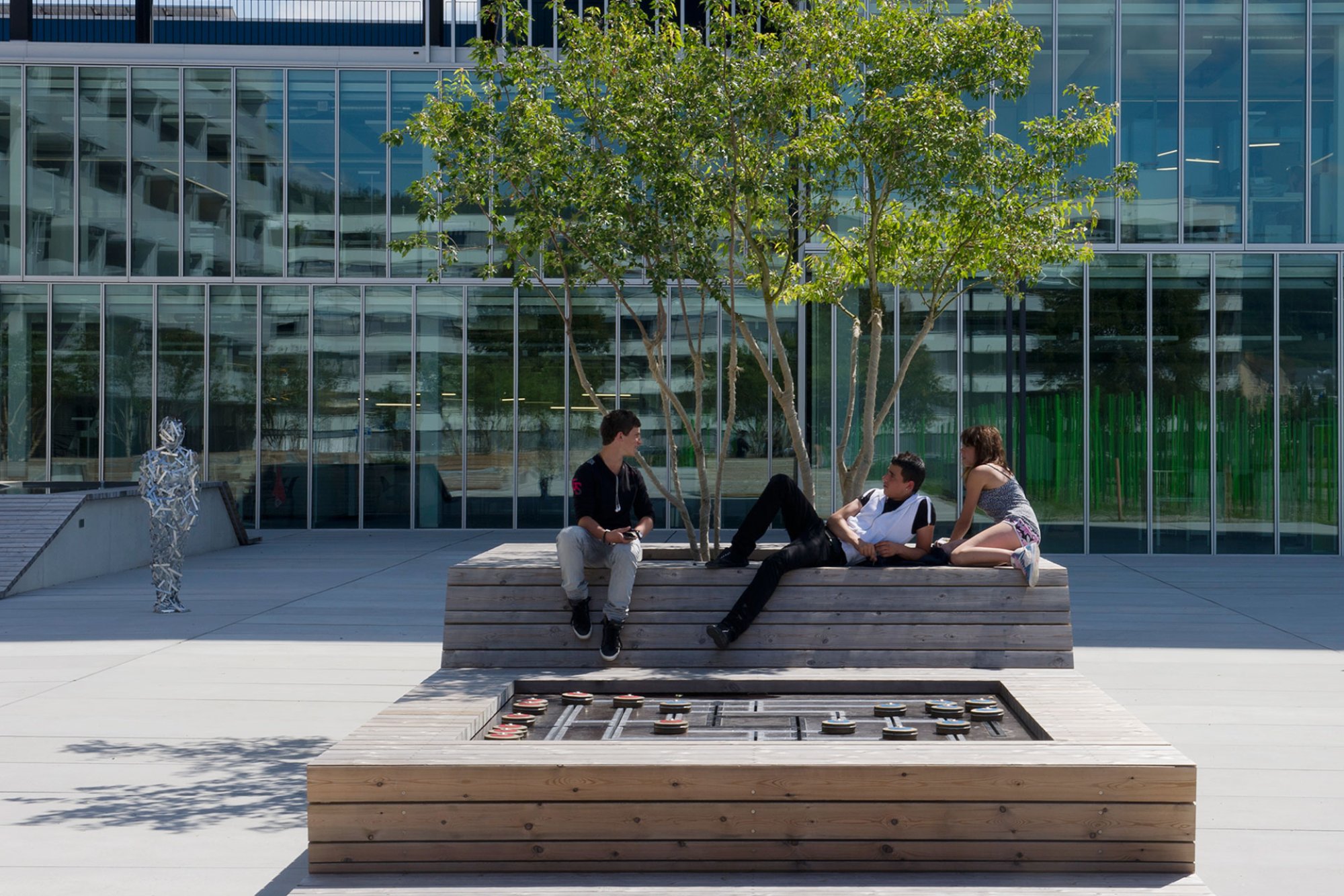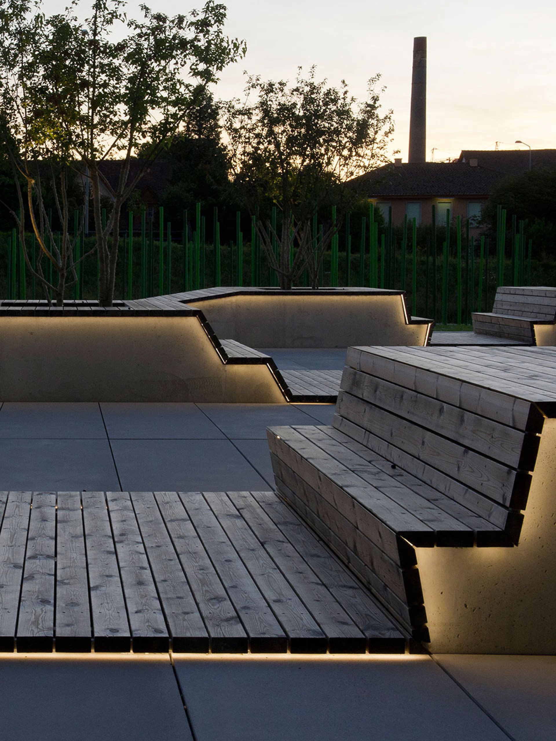 Drei Funktionsbänder – als Relief ausgebildete Holzdecks – durchziehen den komplett unterbauten und daher mit einem Hartbelag ausgestatteten Innenhof. Auf verschiedenen Höhenniveaus sind in die Decks Pflanzgefässe für Schatten spendende Gehölze und Sitzgelegenheiten integriert. Auch die für die Decks und den Ort massgeschneiderten Spielelemente wie das überdimensionierte Tischfussball- oder das Mühle-Spiel, Sandkästen und Wasserbecken bieten unterschiedlichen Nutzergruppen auf kleinster Fläche adäquaten Raum. Nachts hebt die dezente Beleuchtung der Decks von unten deren Reliefform hervor und taucht den Hof in indirektes Licht.