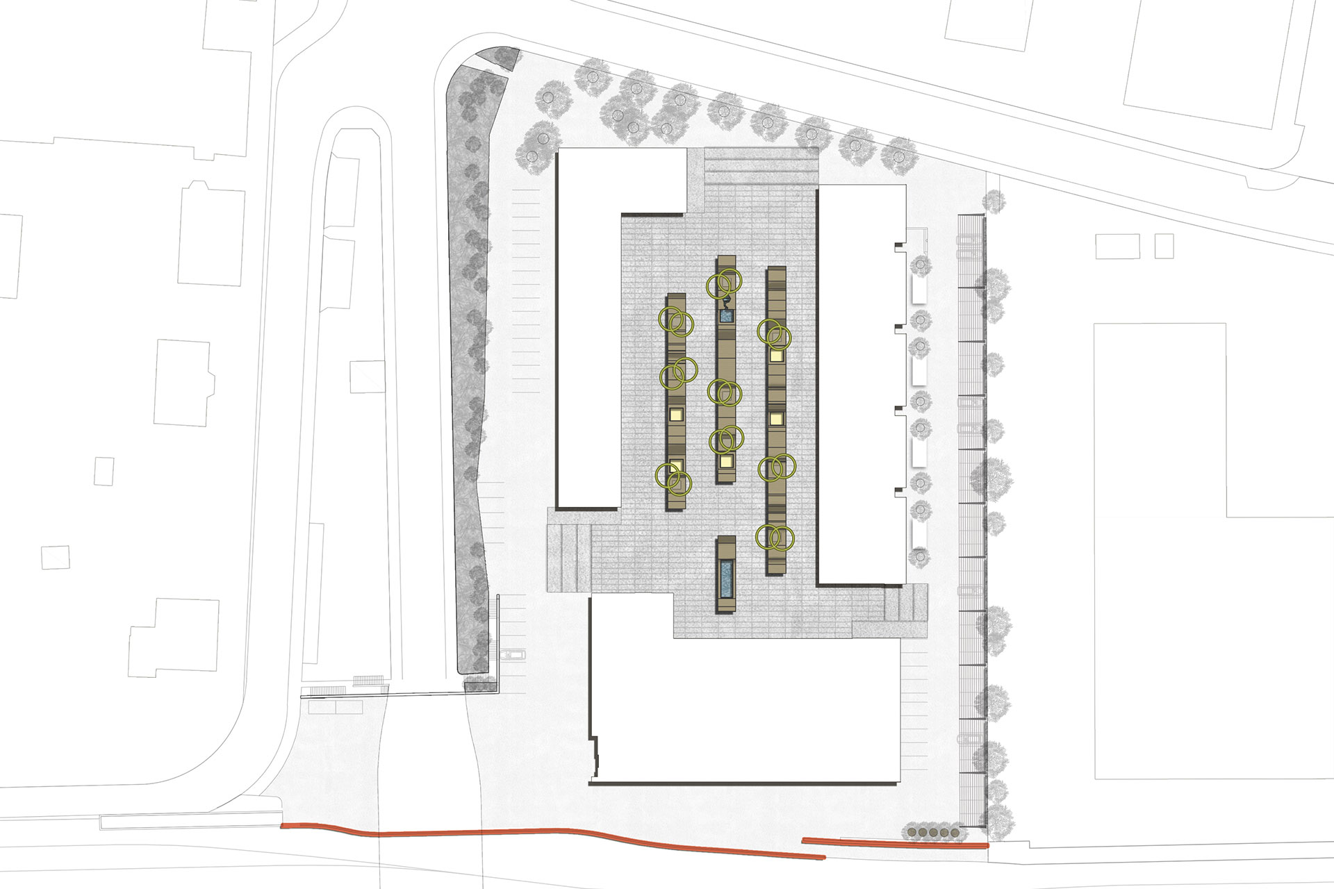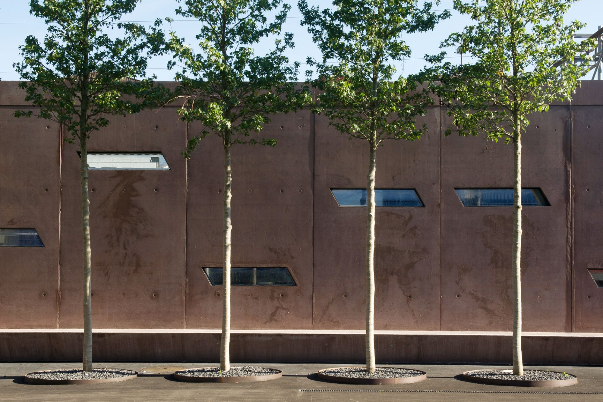 Von den Gleisen ist der Hof durch eine Lärmschutzwand aus rot gefärbtem Ortbeton getrennt. Fünf Amberbäume und eine in die Mauer integrierte Bank wandeln das funktionale Element zum Gestaltungselement, kleine Fenster in der Mauer gewähren punktuelle Einblicke in das Geschehen auf und hinter den Gleisen.