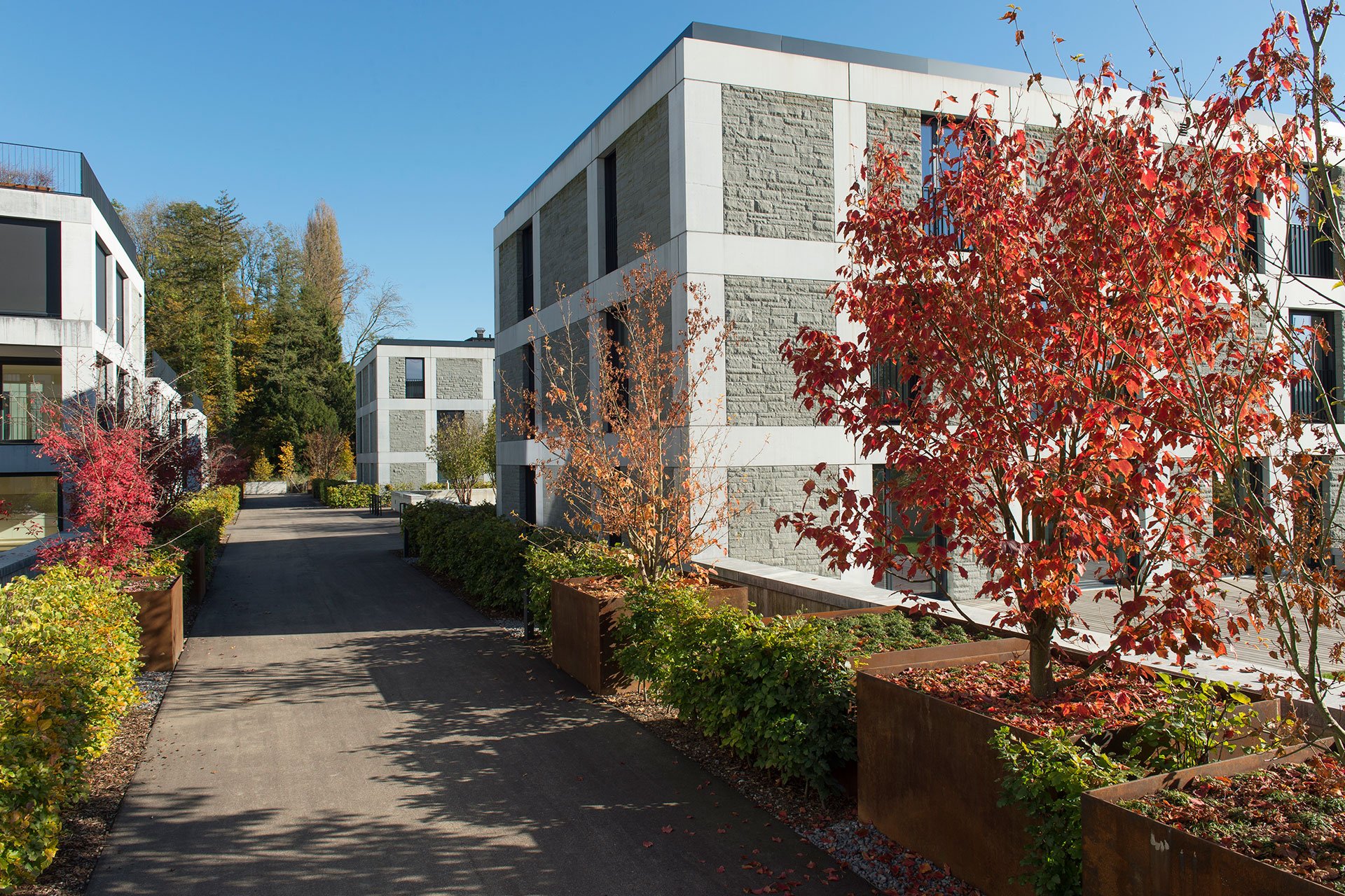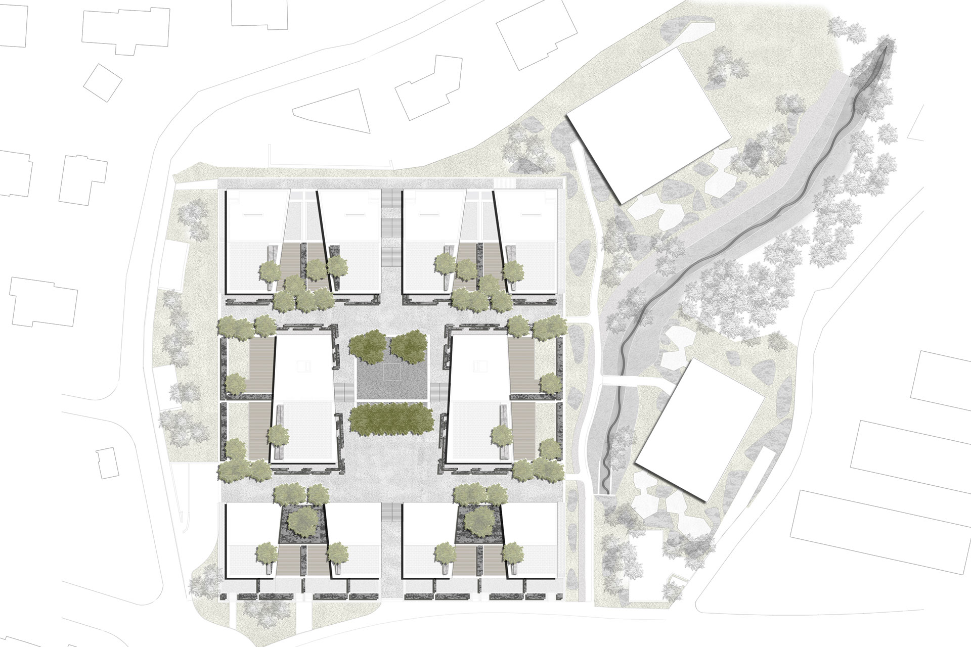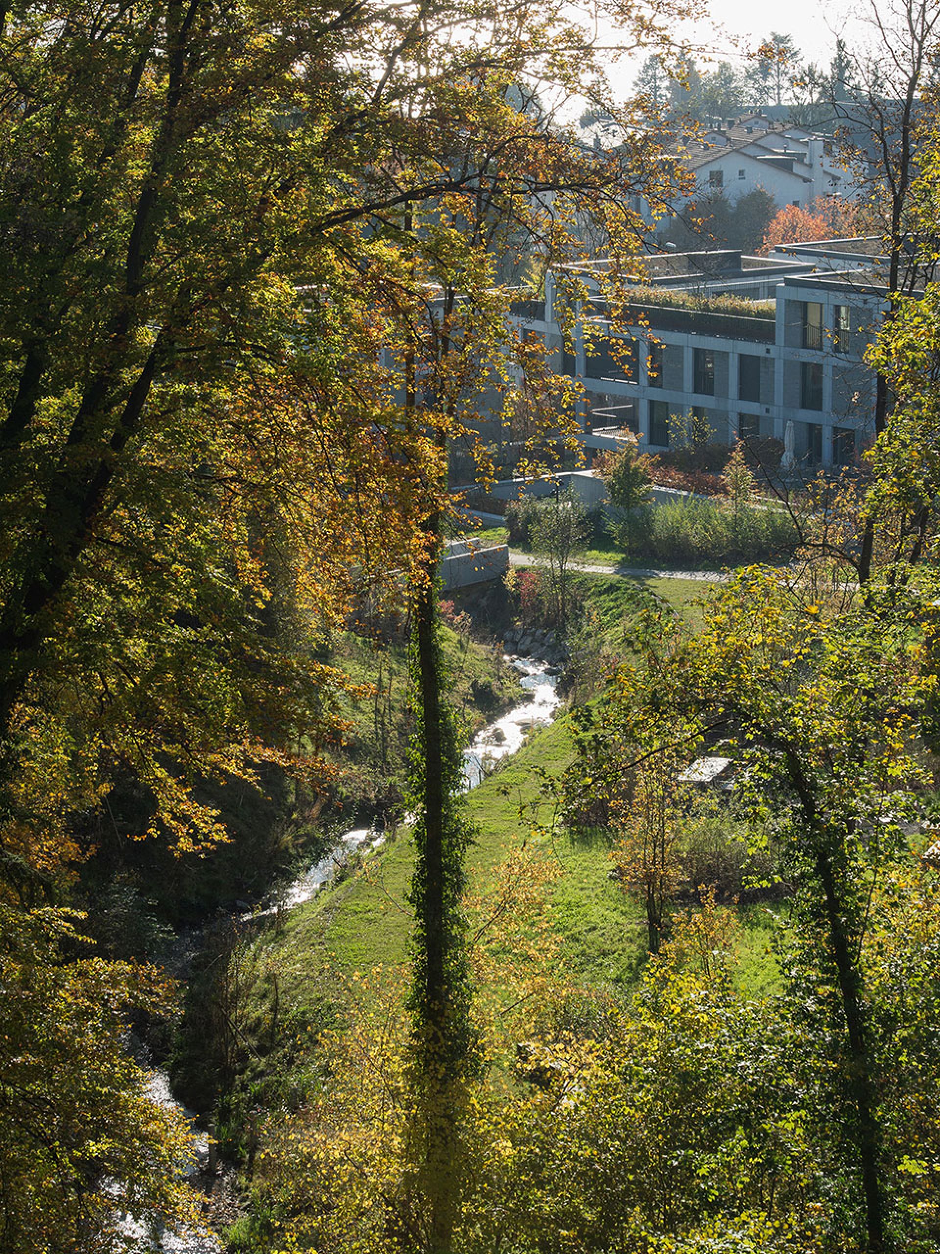 Die Wohn-Insel und der umgebende Naturraum bilden einen reizvollen Kontrast. Auf der einen Seite steht die zwischen Park- und Naturlandschaft changierende Umgebung mit dem revitalisierten Beugenbach und den neuen, wertvollen Zugängen zum Wasser. Auf der anderen das vielschichtige, orthogonale Aussenraumsystem der Baukörper: Rund um den zentralen, urban gestalteten Platz gruppieren sich die Bauten mit ihren klar abgegrenzten, privaten Freiräumen. Durch die Gebäude zieht sich ein Wegenetz mit hochwertiger Begrünung als Durchgangs- und Begegnungsraum. Am Rande der Bebauung bietet der Pocketpark Nischen im Grünen – mit Ausblick, schützendem Grün im Rücken und Sitzgelegenheiten.