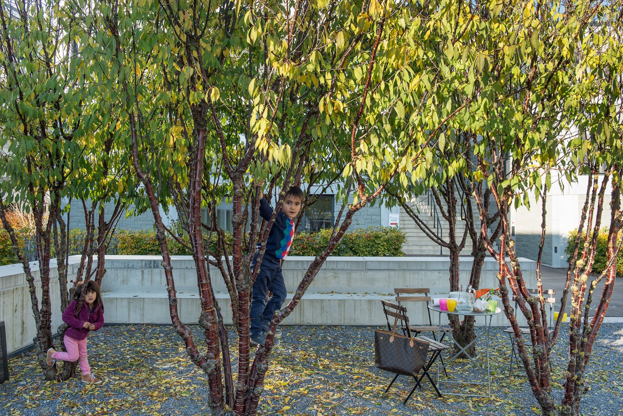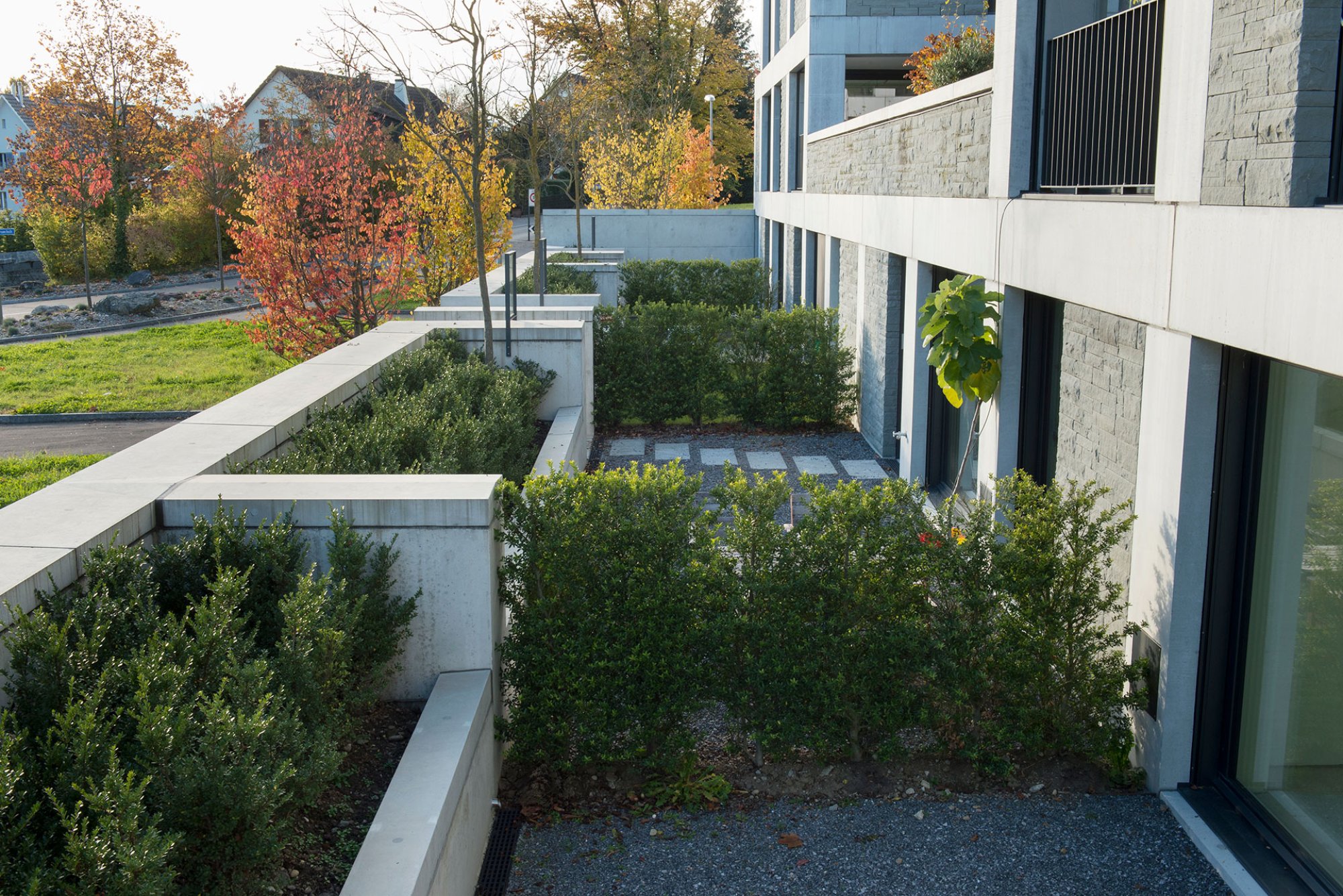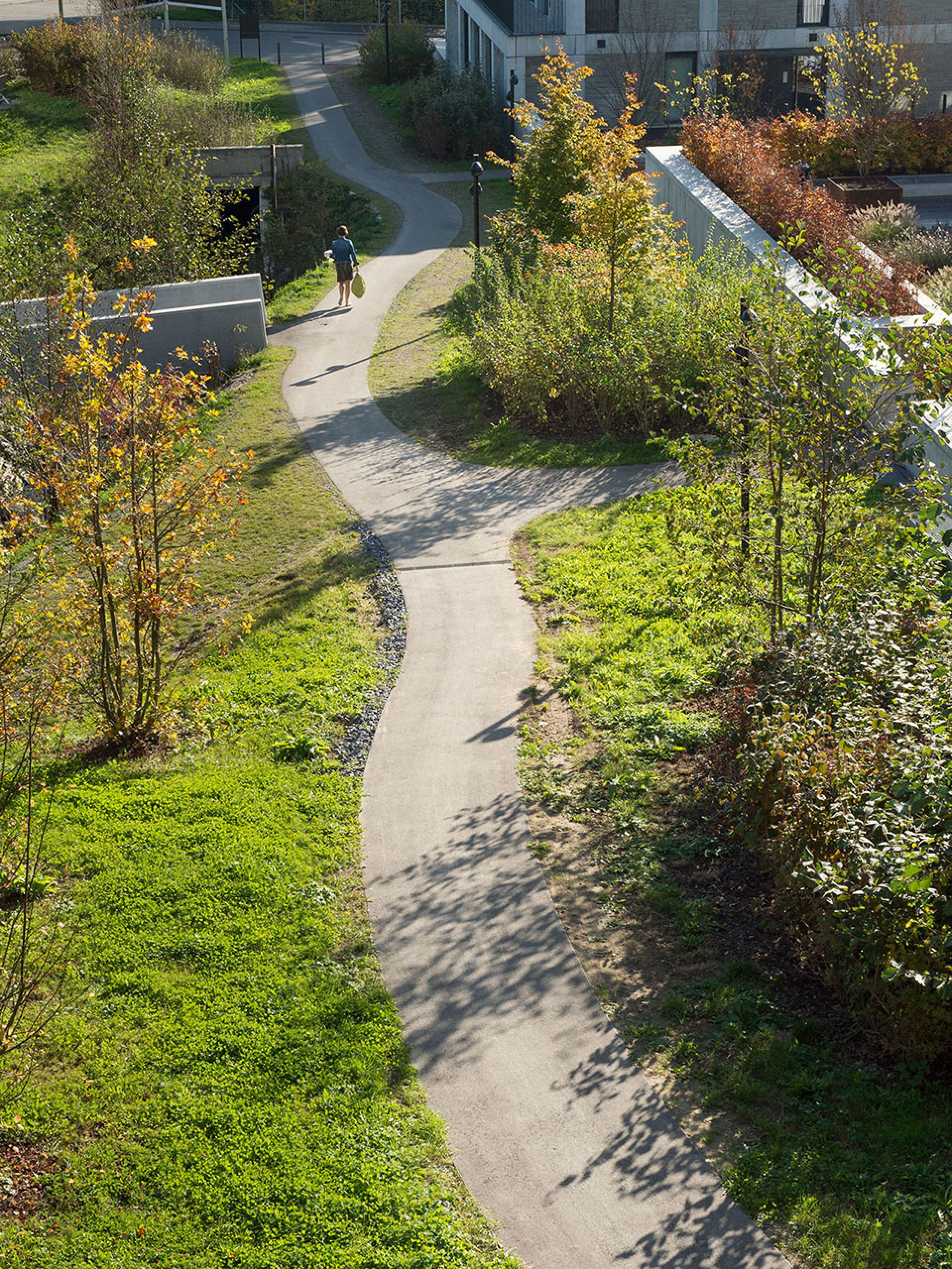 Die Wohn-Insel und der umgebende Naturraum bilden einen reizvollen Kontrast. Auf der einen Seite steht die zwischen Park- und Naturlandschaft changierende Umgebung mit dem revitalisierten Beugenbach und den neuen, wertvollen Zugängen zum Wasser. Auf der anderen das vielschichtige, orthogonale Aussenraumsystem der Baukörper: Rund um den zentralen, urban gestalteten Platz gruppieren sich die Bauten mit ihren klar abgegrenzten, privaten Freiräumen. Durch die Gebäude zieht sich ein Wegenetz mit hochwertiger Begrünung als Durchgangs- und Begegnungsraum. Am Rande der Bebauung bietet der Pocketpark Nischen im Grünen – mit Ausblick, schützendem Grün im Rücken und Sitzgelegenheiten.