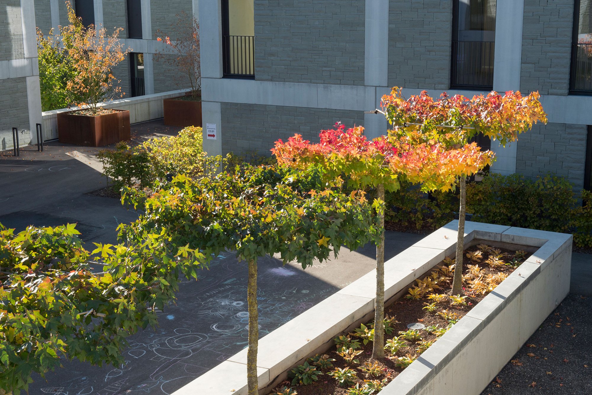 Die umgebende Rahmenpflanzung und die Bepflanzung im Kern des neuen Quartiers ergänzen sich in spannungsvollem Kontrast. Einheimische Kleinbäume und Sträucher bilden den vermittelnden Rahmen zwischen Wald, Beugenbach und den Bauten. In der Siedlung bilden Ziergehölzgruppen mit ihrer wechselnden, langandauernden Blütenpracht und Herbstfärbung den farbenfrohen, lebendigen Kern des kleinen Quartiers am Bach.