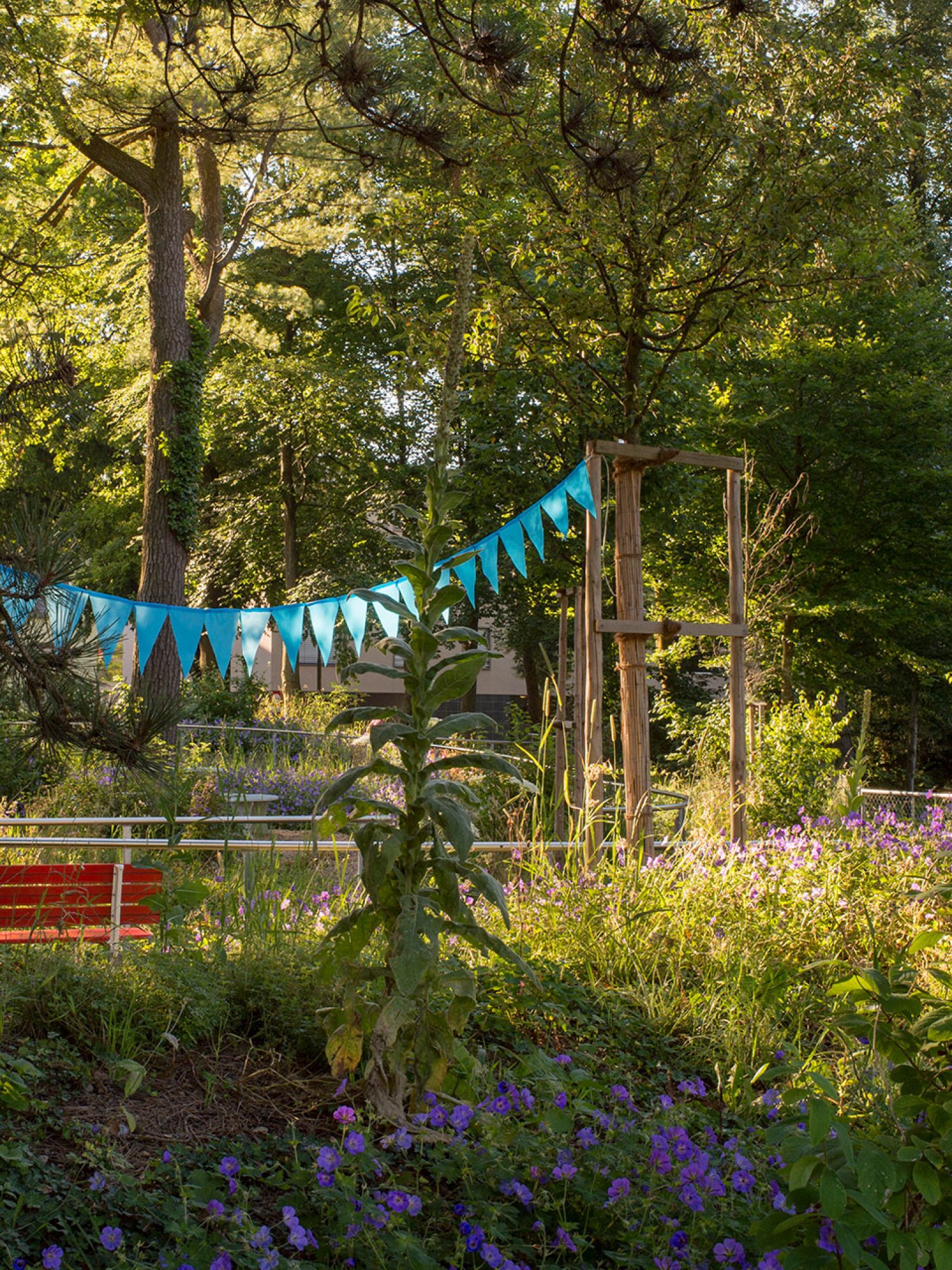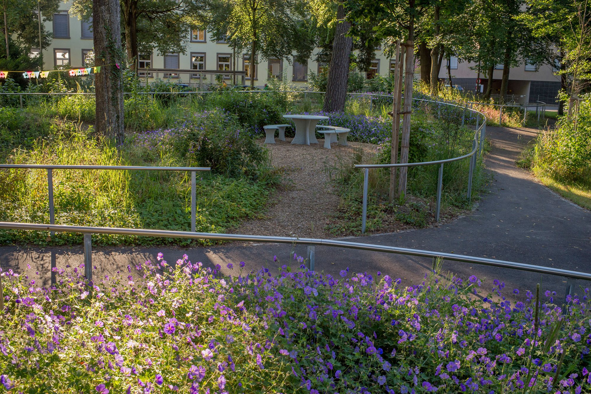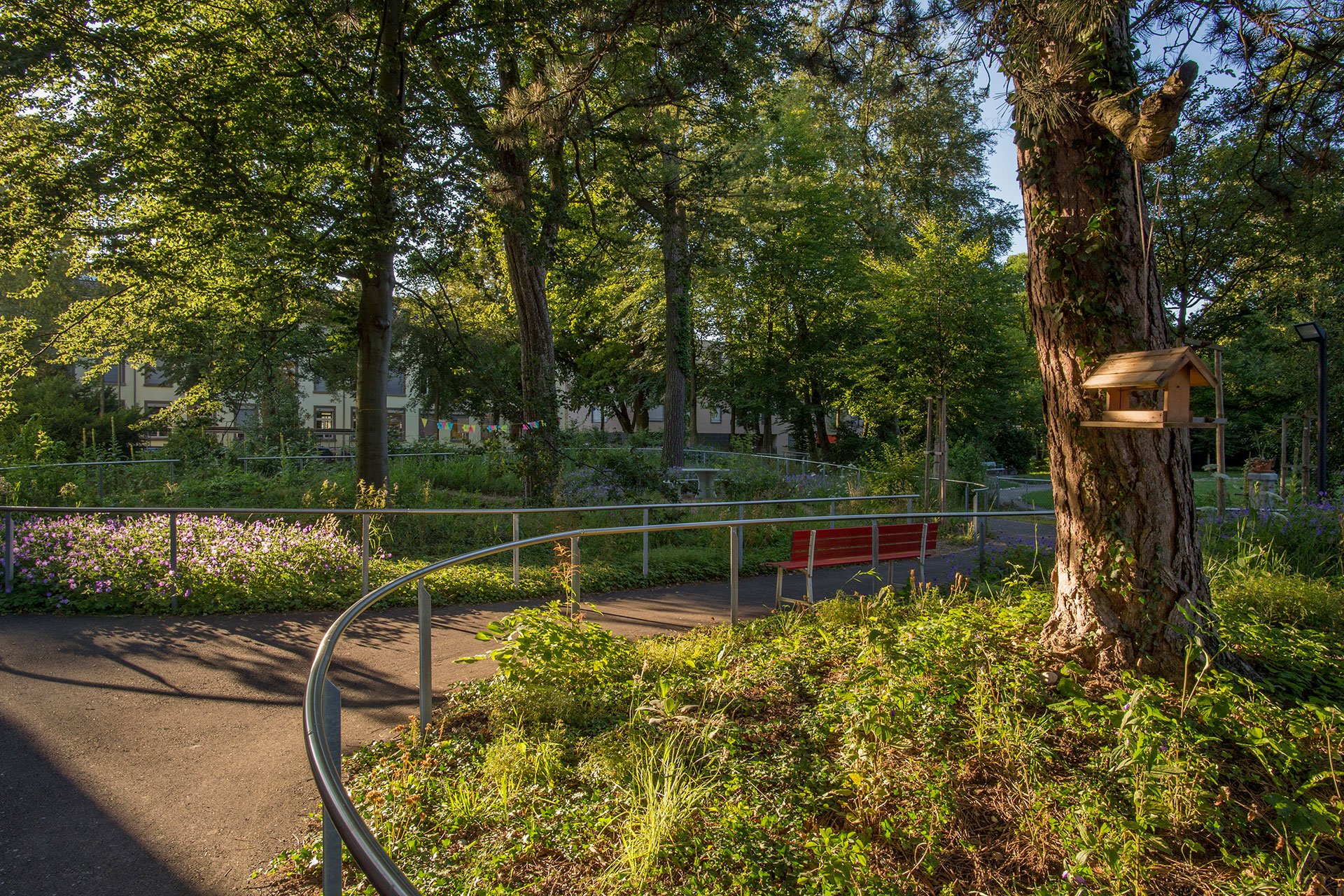 Als erweiterter Wohnraum ist der Garten für die Bewohner zugleich Ort für Bewegung, Erlebnis und Erinnerung. Zwei Wegovale bieten sich für kleine und grosse Spaziergänge an und führen durch den schattenspendenden Baumbestand, vorbei an Sitzbänken für Pause und Aufenthalt. Vögel und Schmetterlinge lassen sich auf der vielfältigen Bepflanzung nieder und beleben den Garten - zusammen mit dem plätschernden Trinkbrunnen entsteht eine die Sinne anregende Atmosphäre. Hochliegende Pflanzbeete in denen die Nutzer selbst Pflanzen setzen, beobachten und schneiden können, ermöglichen den direkten Kontakt mit der Natur und wecken Erinnerungen. Treffpunkt ist der vor dem Ausgang in den Garten vorgelagerte Sitzplatz, von wo aus die Bewohner den Ausblick über den Garten bis in die Parkanlage geniessen können.