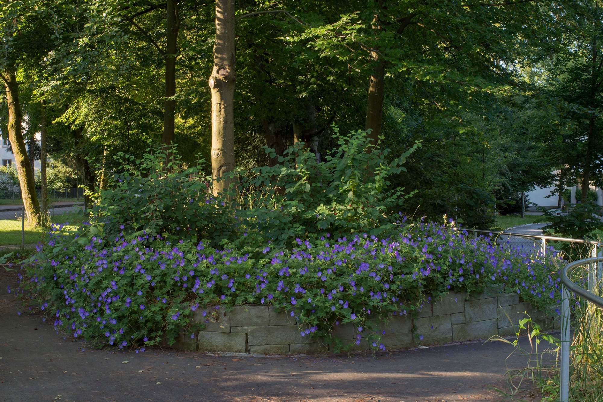 Die neu gestaltete Vorzone trägt die neue Visitenkarte des Alterszentrums nach aussen. Vorbei an üppigen Pflanzeninseln gelangt man zum Haupteingang. Von den Sitzbänken aus lässt sich das Treiben an diesem verfolgen und beobachten. Ein neuer Plattenbelag zeichnet den Vorplatzbereich aus, der auch die geforderten Abstellplätze für Velos und Motorräder aufnimmt.