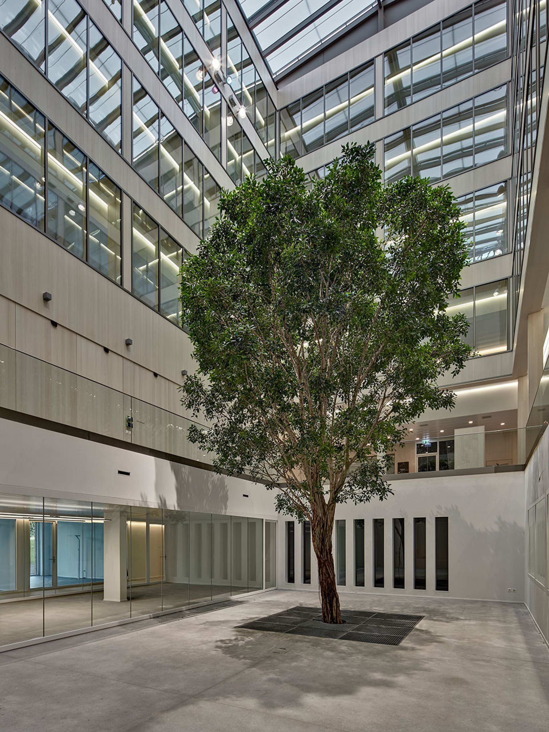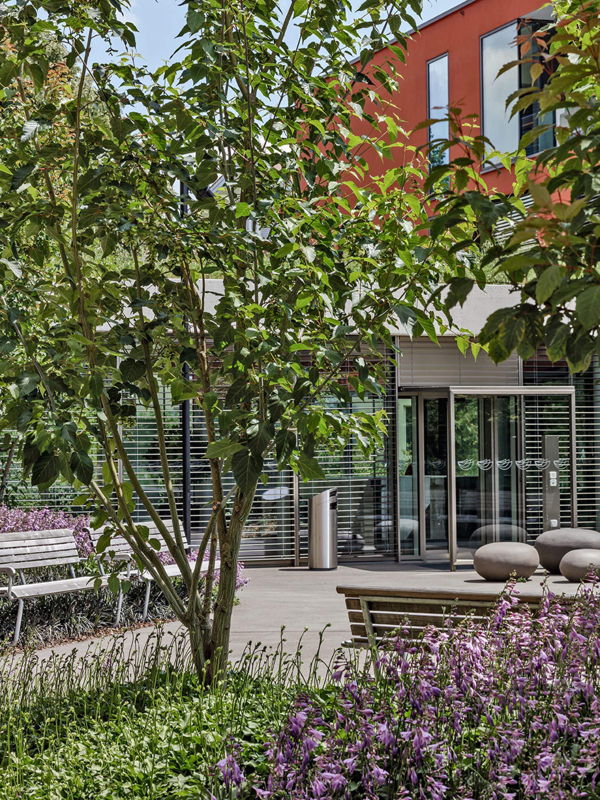 Die bewegte Topografie mit einheimischen Laubgehölzen bis an die Fassade geführt. Topografisch überhöhte Pflanzeninseln führen vom Pflegepark in den seitlich offenen Hofraum zwischen Neubau und dem bestehenden Pflegezentrum und schaffen als fliessende Raumsequenz einen über den Verbindungsbau greifenden Gartenraum. In ihrer individuellen Grundform und Bepflanzung sind sie identitätsstiftende Merkmale. Als raumbildende Stimmungsträger entfalten sie je nach Standpunkt perspektivische Wirkung, sind zonenbildend, schattenspendend und gewähren mit ihrem Schutz vor Einsicht eine hohe Aufenthaltsqualität. Holzsitzbänke laden zum Verweilen im üppigen Grün und ein Pflanztisch zur Interaktion mit der Natur ein. Als erweiterter Wohnraum ist der Gartenhof für die Bewohner zugleich Ort für Bewegung, Erlebnis und Erinnerung. Ein bepflanztes Wasserbecken akzentuiert den Hof im Aussenraum und ein identitätsstiftender Ficus belebt den Lichthof im Neubau.