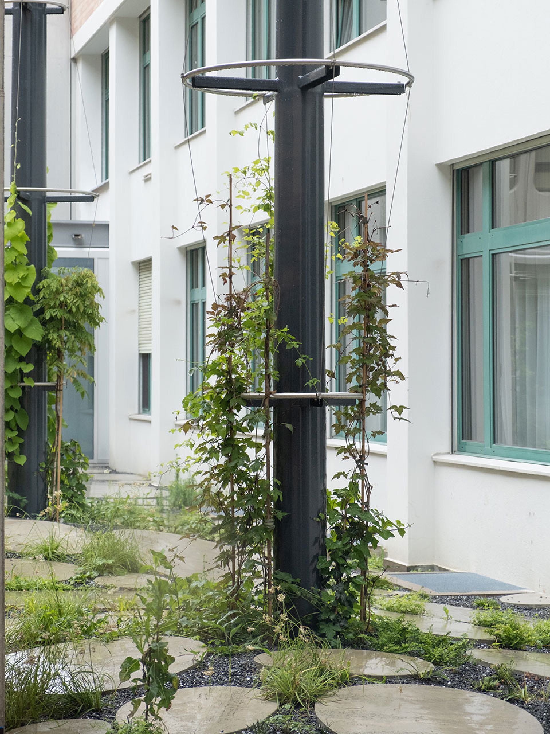 Die vertikalen Gärten der Schauhöfe stehen als Sinnbilder für die Sehnsucht nach dem Paradies und sind als solche mit Ausnahme des Schauhofes im OKS, welcher gleichzeitig als Therapiehof dienen soll, nicht begehbar. An Ranksäulen schlingen sich üppige Kletterpflanzen empor und durchwirken die Hofräume über alle Geschosse bis über das Niveau des Stadtgartens. In ihrer Präsenz stiften sie Identität und schaffen Orientierung.