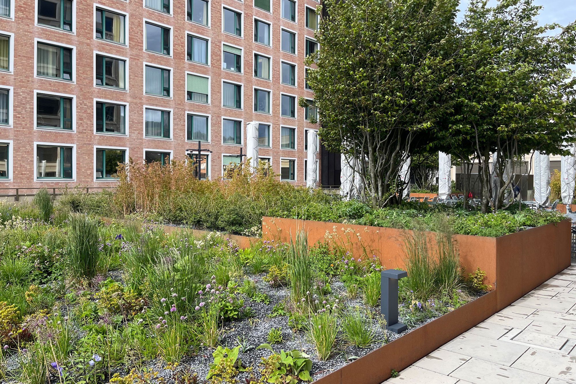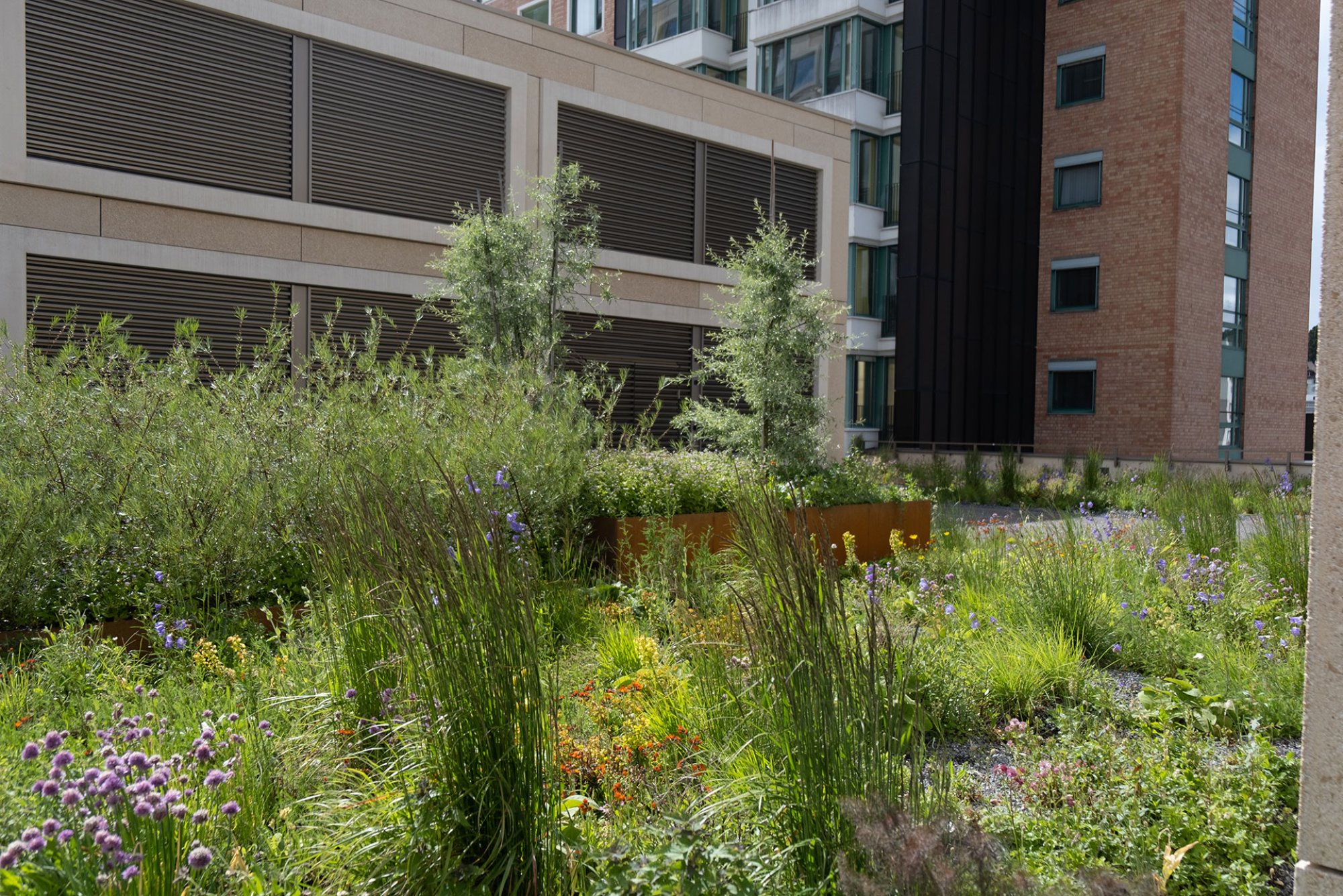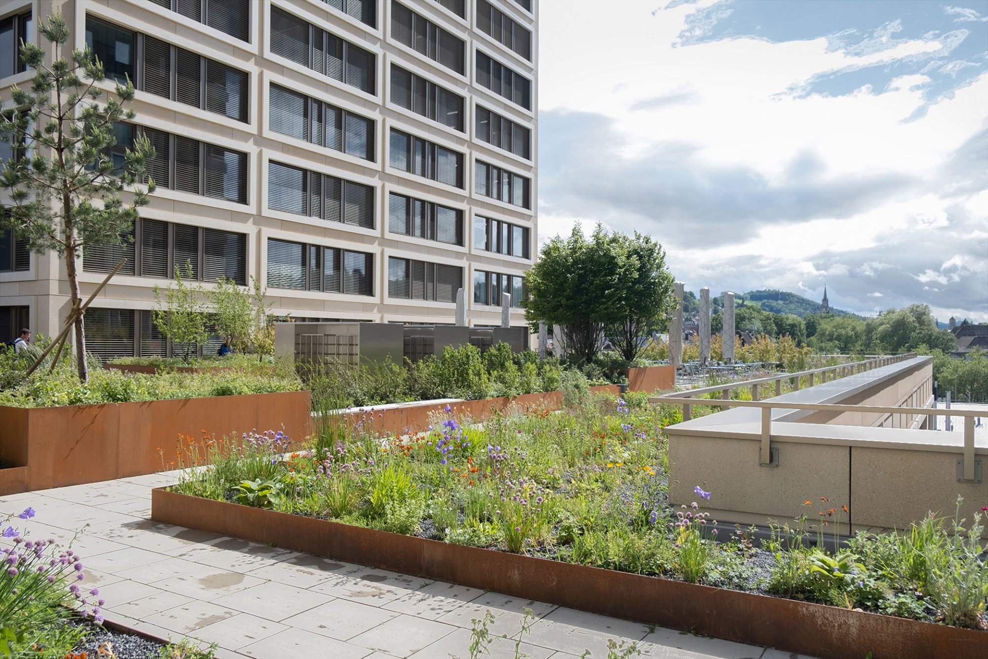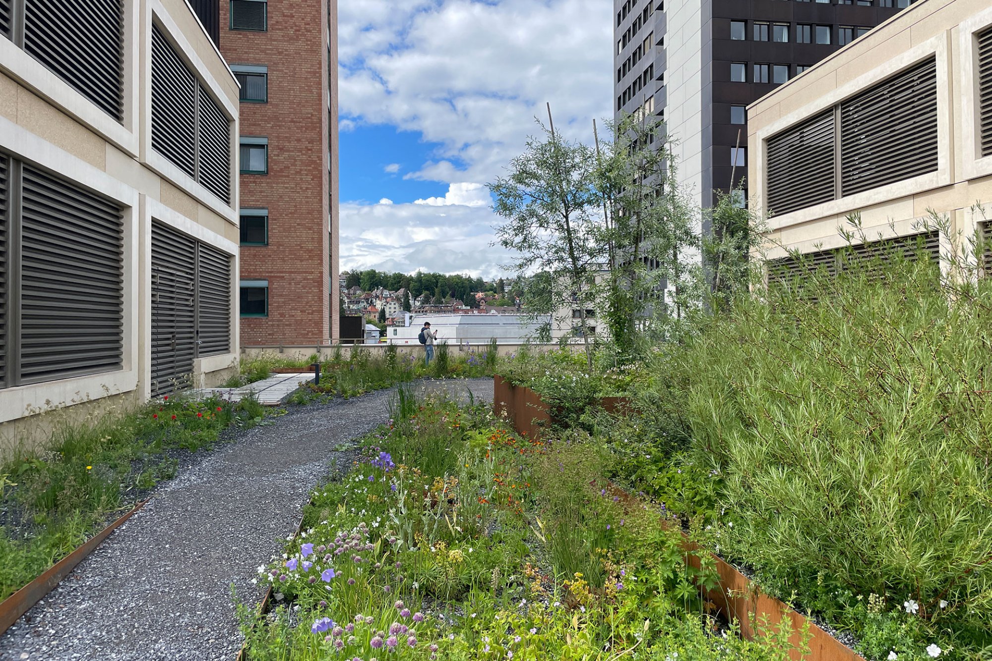 Die Gestalt des Stadtgartens wird aus einem auf der Gebäudestruktur basierenden System aus Weg-, Platz- und Grünflächen entwickelt. Über eine Abstufung der Aufbaustärken erfährt die Dachoberfläche eine reliefartige Erscheinung mit einer vielfältigen Vegetation und Räumen für Rückzug und Bewegung. In seiner Vielfalt erfüllt der Stadtgarten den Wunsch nach Natur und individuellem Freiraum und wirkt sich positiv auf das Wohlbefinden und den Heilungsprozess aus.
