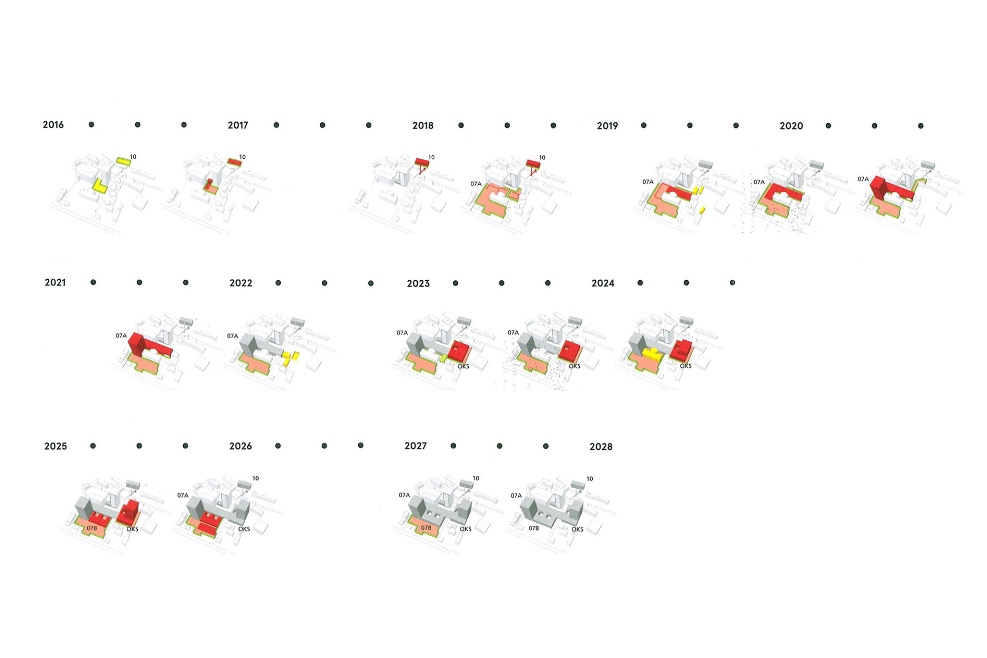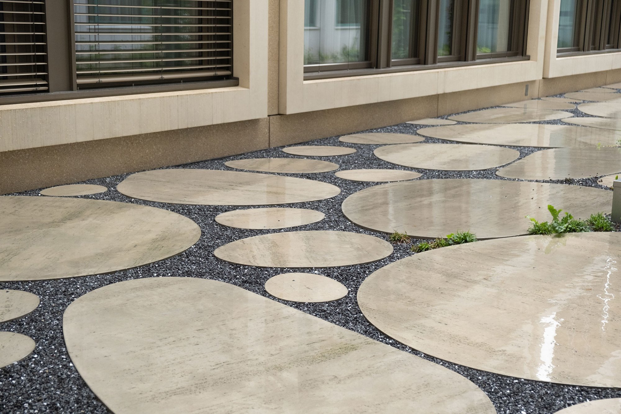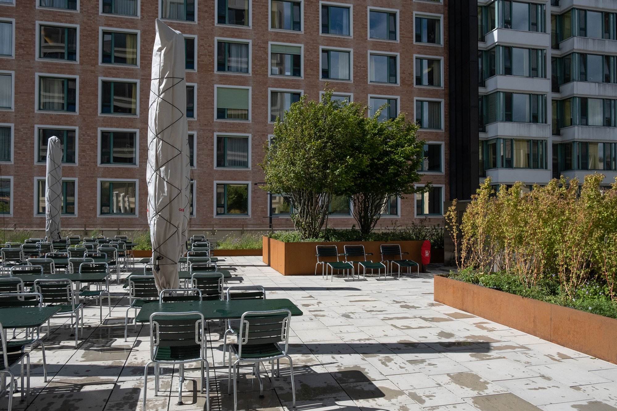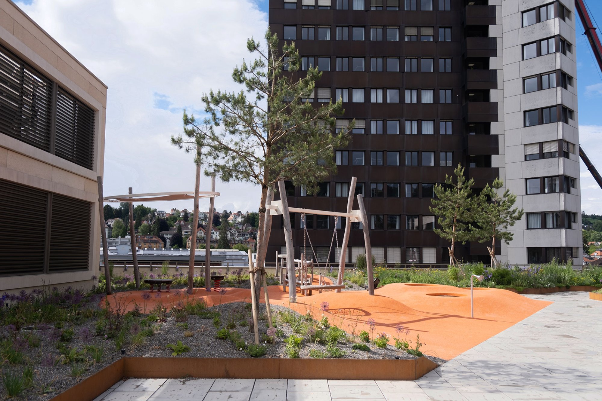 Die Gestalt des Stadtgartens wird aus einem auf der Gebäudestruktur basierenden System aus Weg-, Platz- und Grünflächen entwickelt. Über eine Abstufung der Aufbaustärken erfährt die Dachoberfläche eine reliefartige Erscheinung mit einer vielfältigen Vegetation und Räumen für Rückzug und Bewegung. In seiner Vielfalt erfüllt der Stadtgarten den Wunsch nach Natur und individuellem Freiraum und wirkt sich positiv auf das Wohlbefinden und den Heilungsprozess aus.