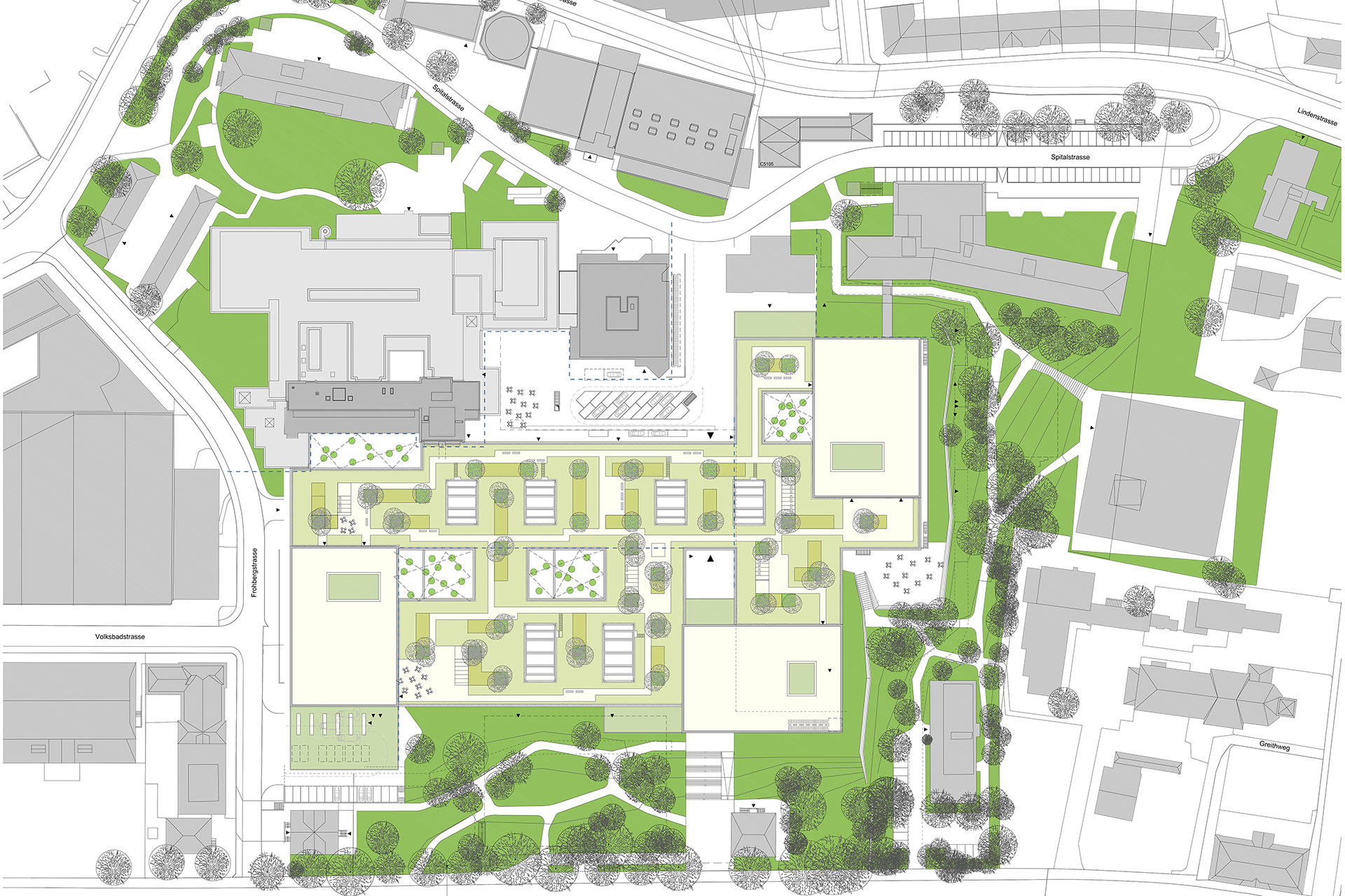 Der umlaufende Spitalpark vermittelt zwischen den bestehenden und neuen Spitalbauten. Ein frei verlaufendes Weg- und Platzsystem aus Hartbelag fügt sich in die Topografie ein und knüpft an den Bestand an. Im Park befindliche Aufenthaltsorte werden mit schattenspendenden Baumgruppen akzentuiert.