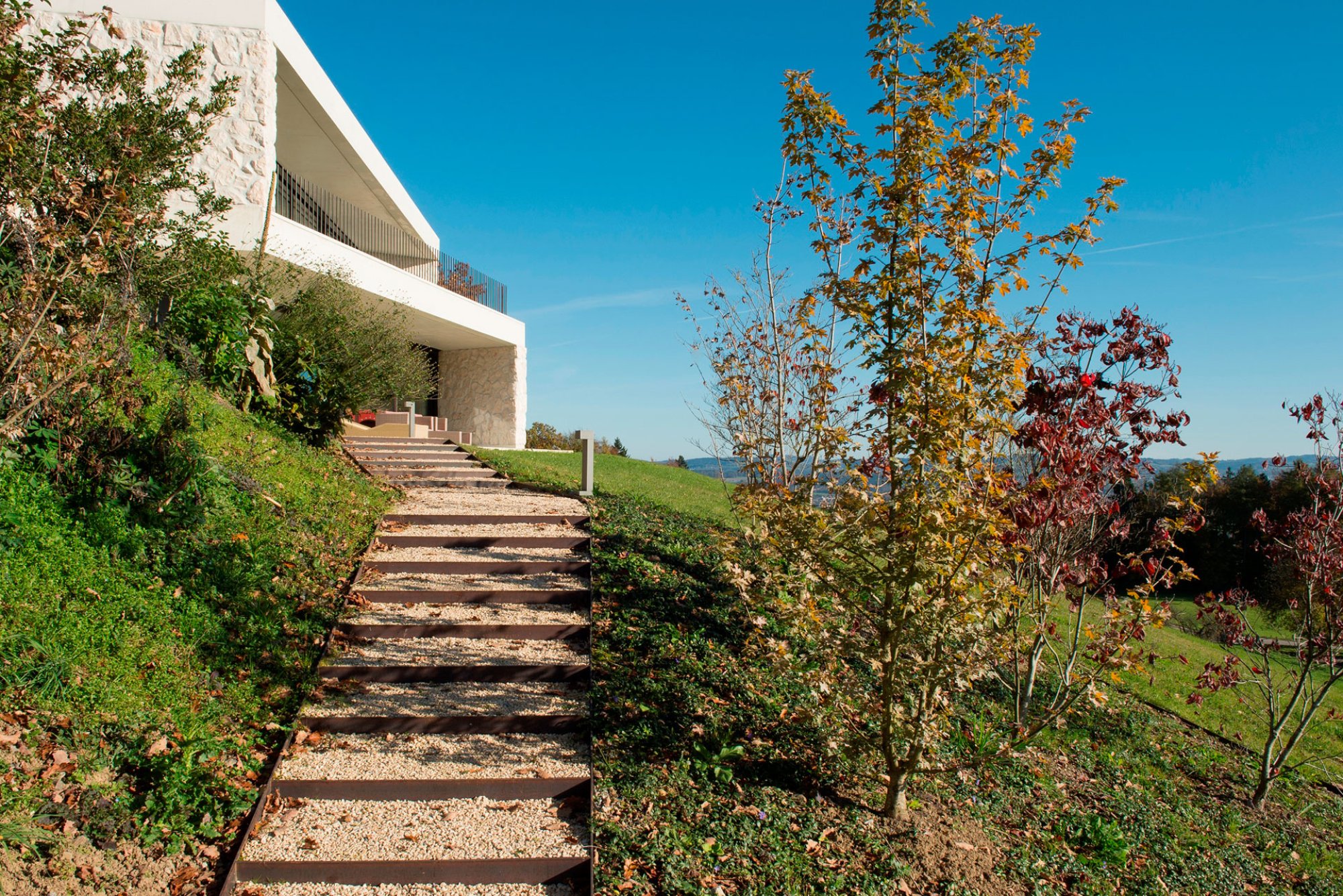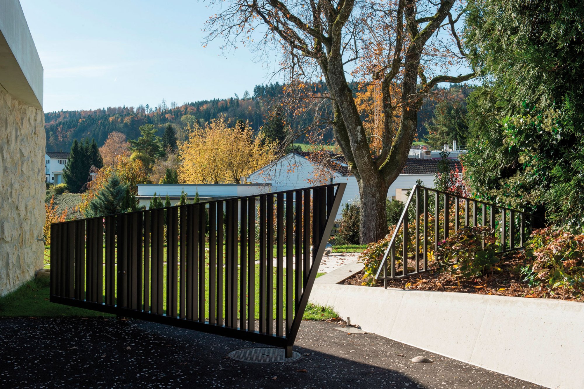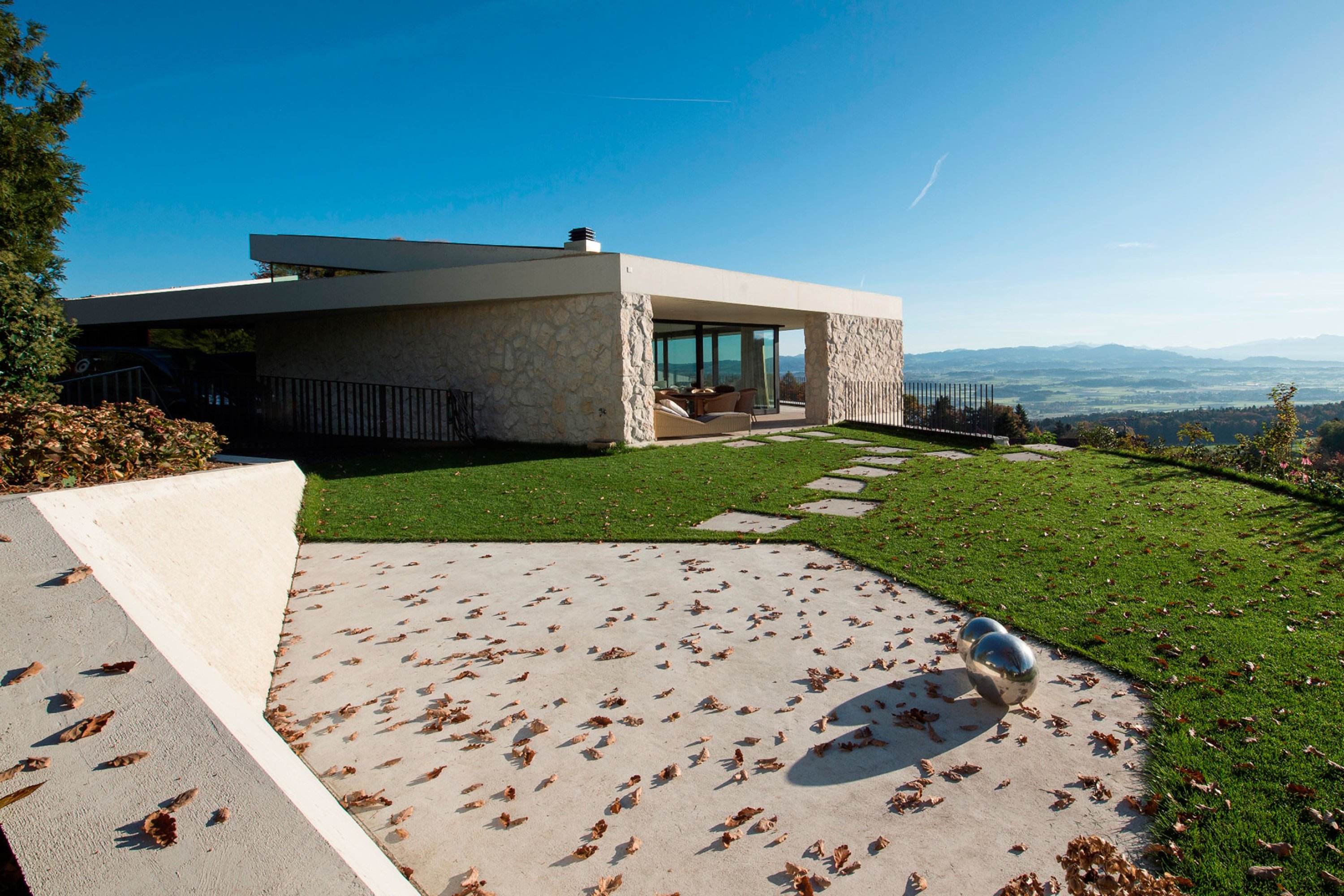 Die Villa und ihr Garten wenden ihr Gesicht der Landschaft und dem fern glitzernden Greifensee zu. Über eine Blumenwiese und einen schlichten Weidezaun hinweg blickt das Haus auf die Landschaft und wird Teil dieser Landschaft. Im Rücken des Gebäudes liegt der Kontrapunkt zur amorphen Offenheit: Eine skulpturale Mauer fasst Haus und Garten und formt den Eingangshof.