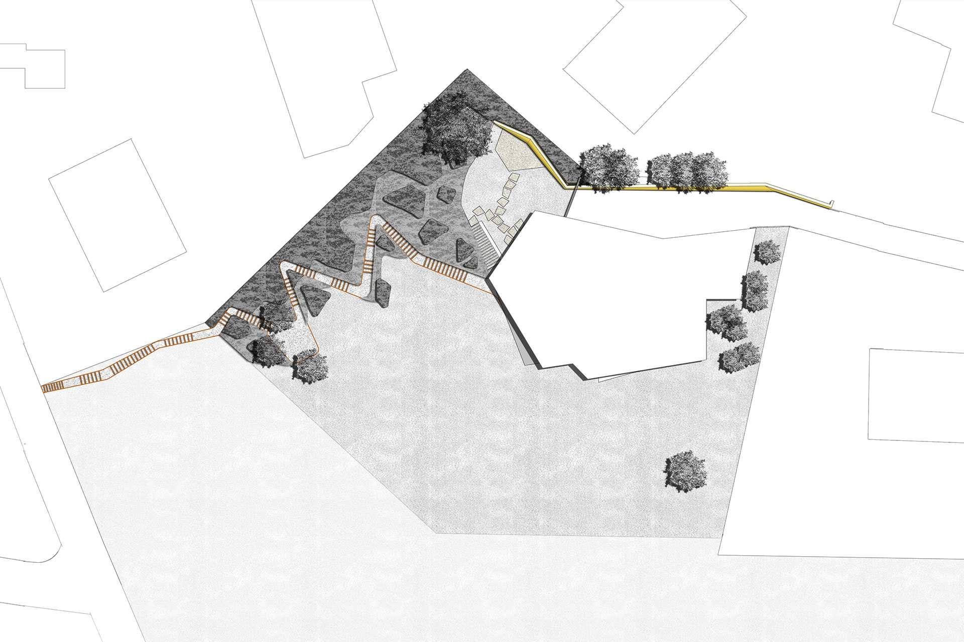 Die Mauer nimmt die Materialien und Geometrien des Hauses auf. In leicht abgeschrägtem Zickzack und wechselnder Höhe fasst die Mauer den gebäudenahen Aussenraum in warme Farben und schräge Ebenen. Unter einer alten Eiche wird sie zum schützenden Rücken des aussichtsreichen Sitzplatzes. An den Seiten des Grundstücks fassen dichte, vielgestaltige Pflanzflächen die offene Weite und sorgen für Geborgenheit.