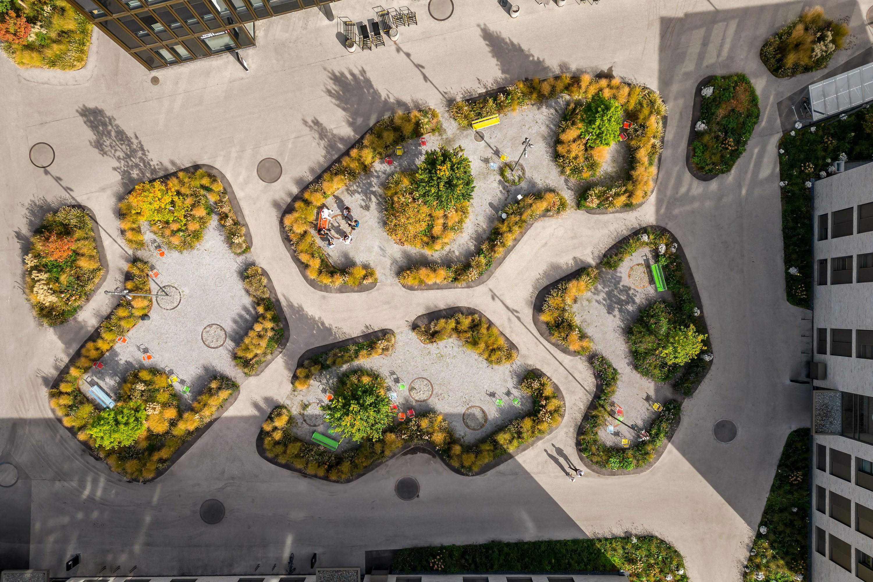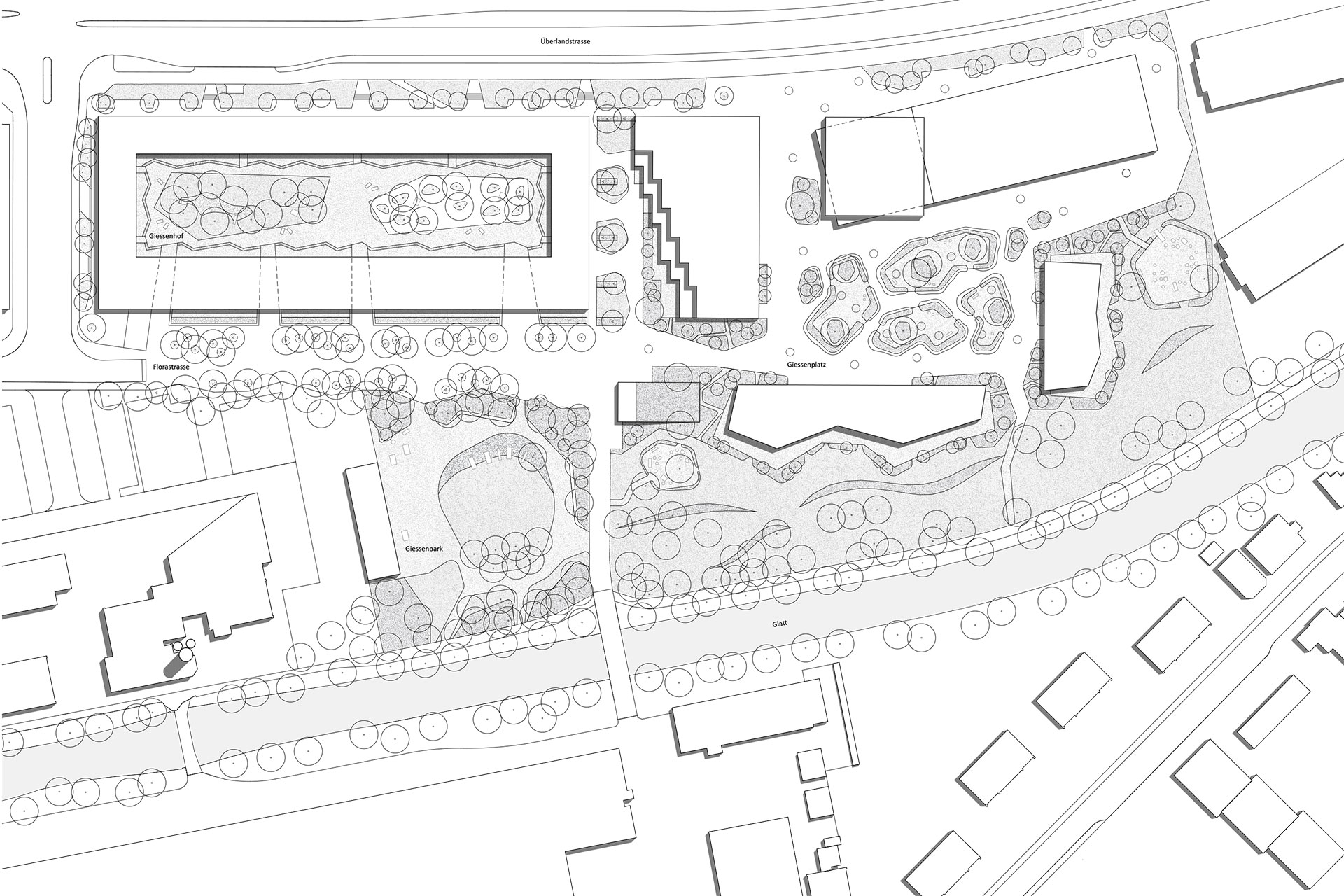Während die Architektur an Baufelder gebunden ist, macht der Freiraum nicht an deren Grenzen Halt. Er bildet ein fliessendes Kontinuum. Er ist der öffentliche oder gemeinschaftliche Raum, der die mächtigen Baukörper zum neuen Quartier zusammenbindet; der den gewinnbringenden Innenraum um lebenswerten, biodiversen und vielfältigen Freiraum ergänzt; der zwischen baulichem und menschlichem Massstab vermittelt.