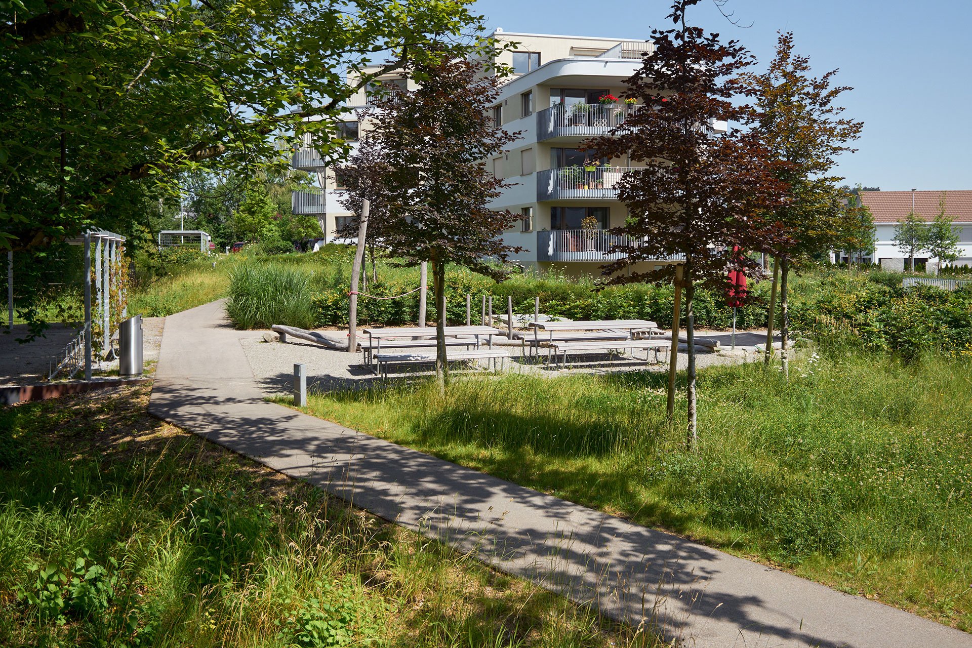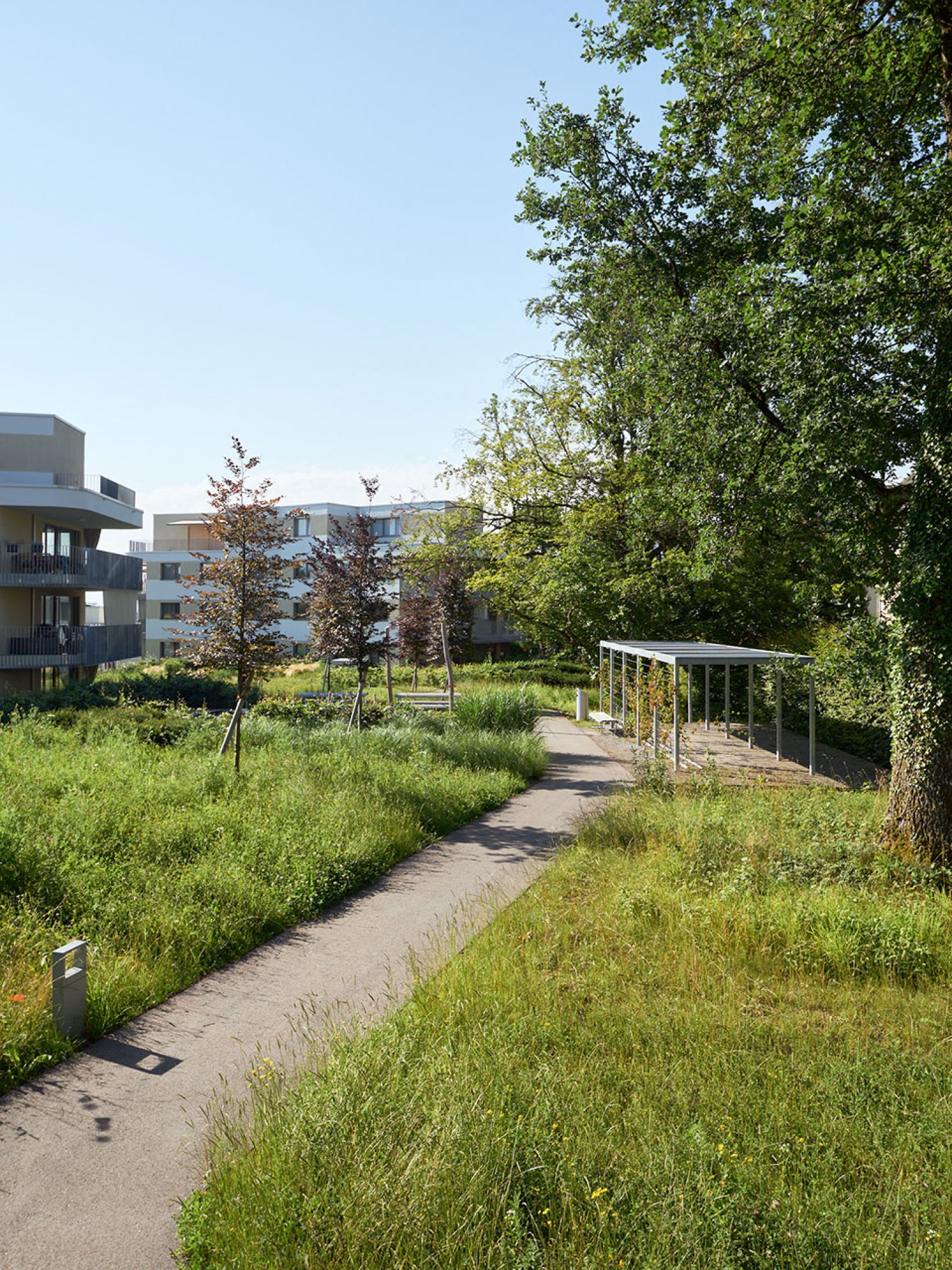 Das Wegsystem vermittelt zwischen den Gebäuden und den Aufenthaltsorten und führt mit moderatem Gefälle wie selbstverständlich dem Terrainverlauf entlang. Die bunt blühende Wiese kann auch als Spielwiese in vorübergehend gemähten Bereichen genutzt werden. Zwischen den duftenden Blumen, den strukturierenden Vegetationskörpern und den prägenden Baumbouquets entsteht ein individuelles, qualitatives Wohnen im Eichbergpark.