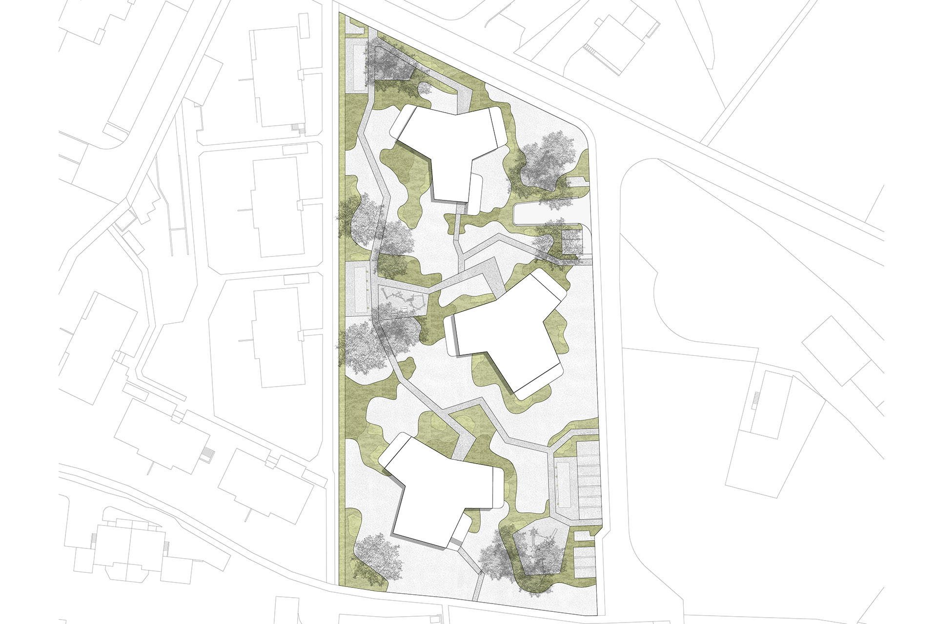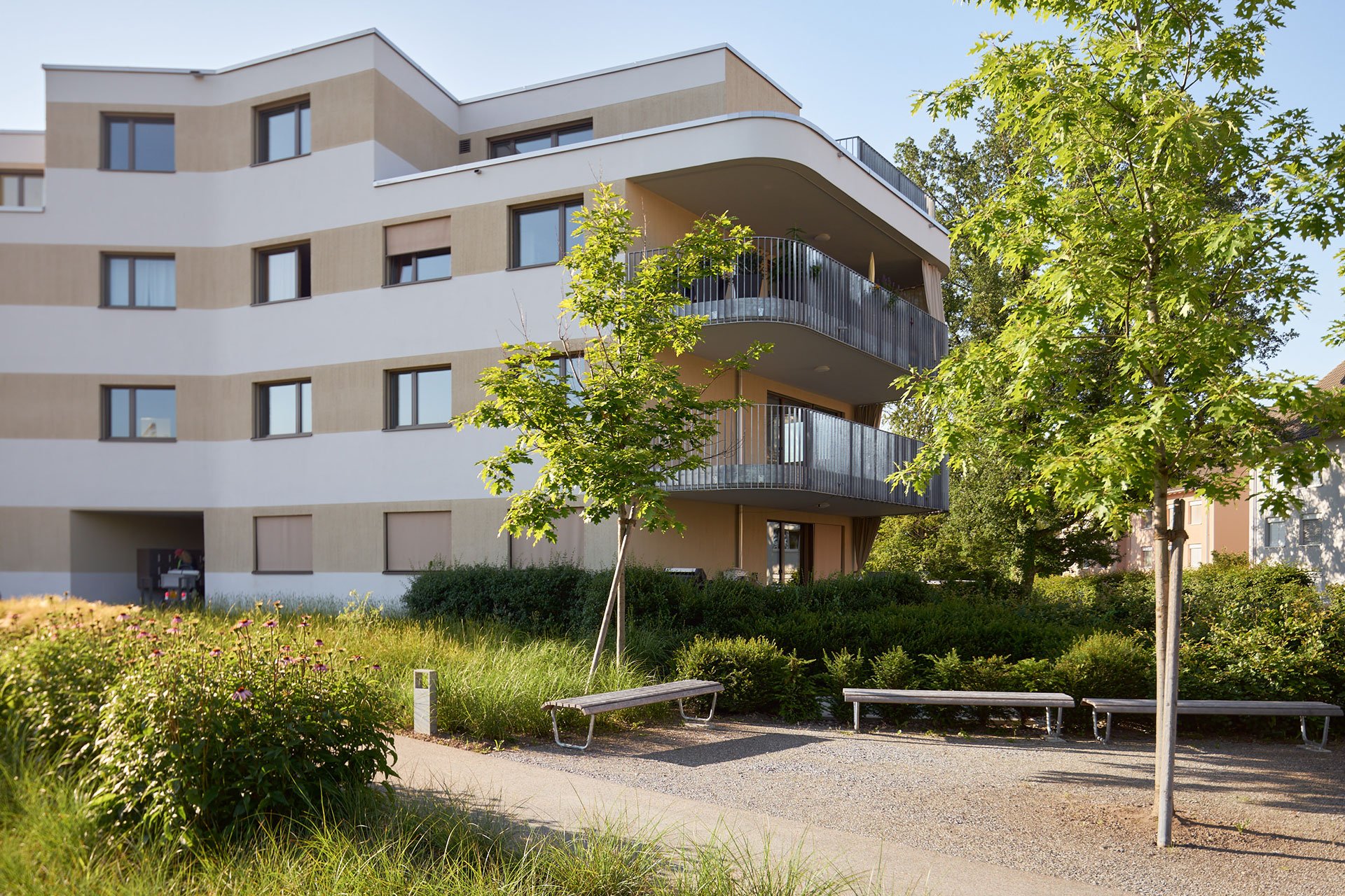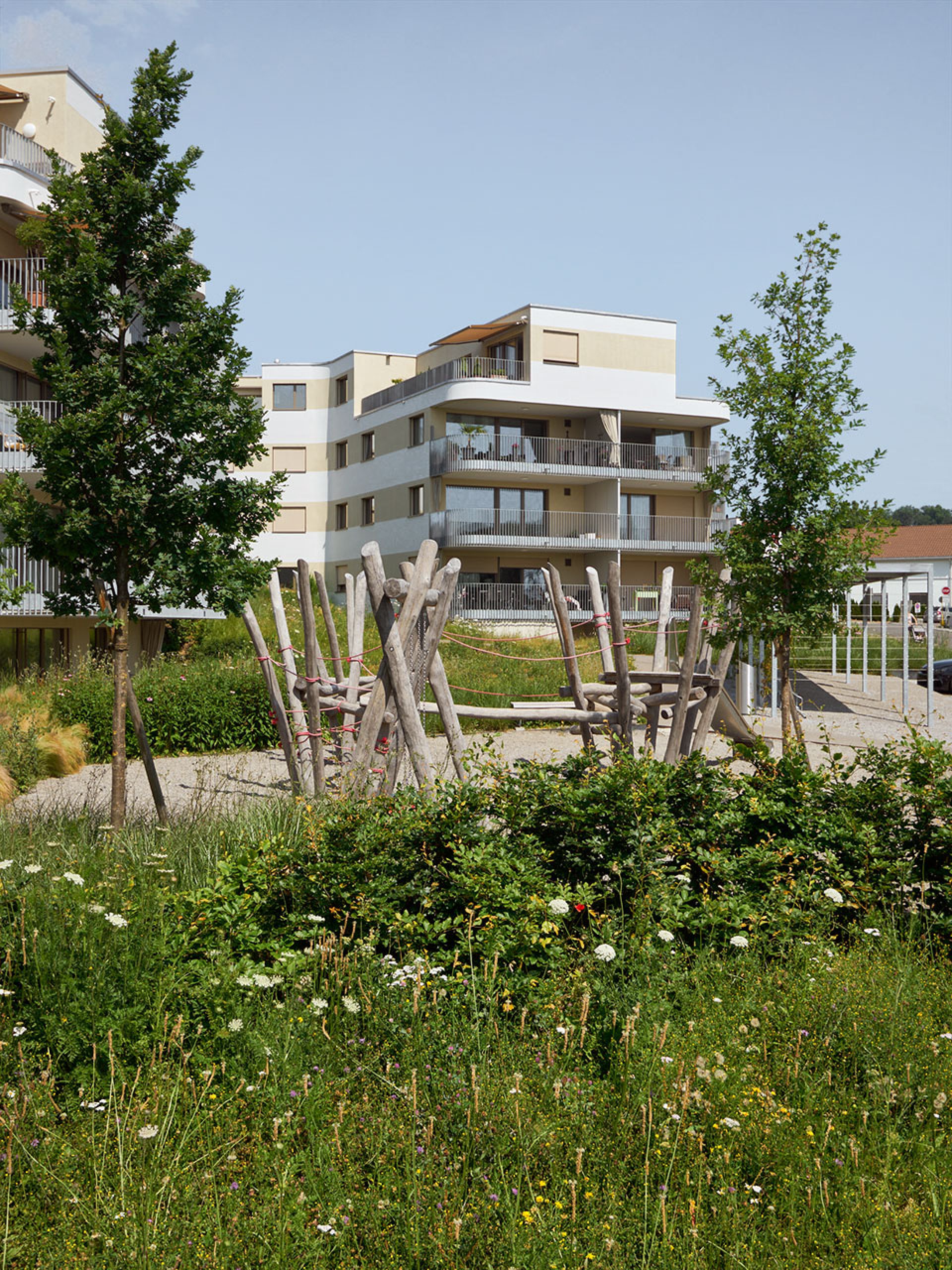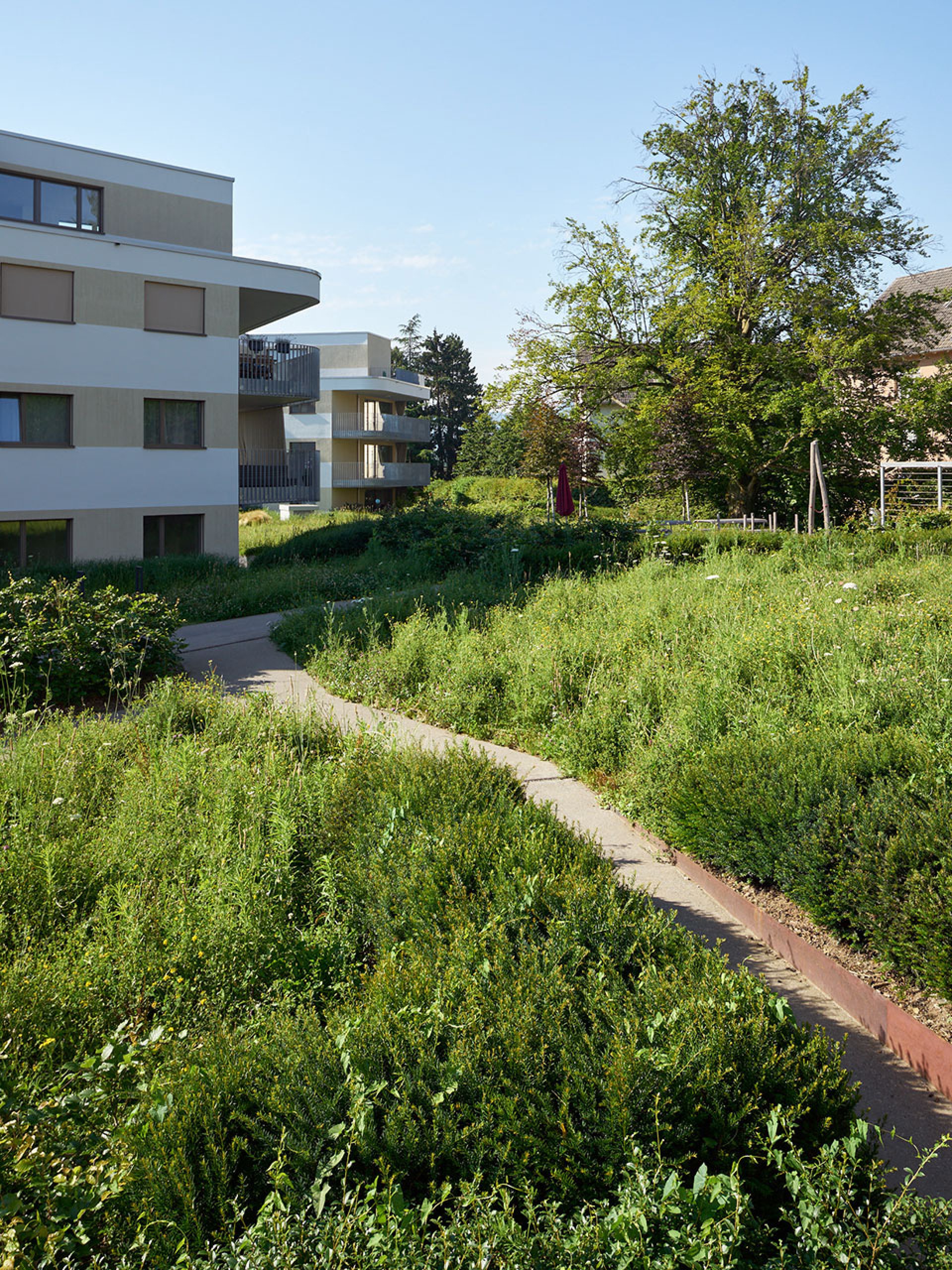 Die Überbauung zeichnet sich durch das sanft modellierte, leicht abfallende Terrain aus. Die erhaltenswerten, bestehenden Bäume setzen mit ergänzten, kompakten Baumbouquets auf der offenen, grossflächigen Blumenwiese räumliche Akzente und lassen ein Bild der Einfachheit und Selbstverständlichkeit entstehen.