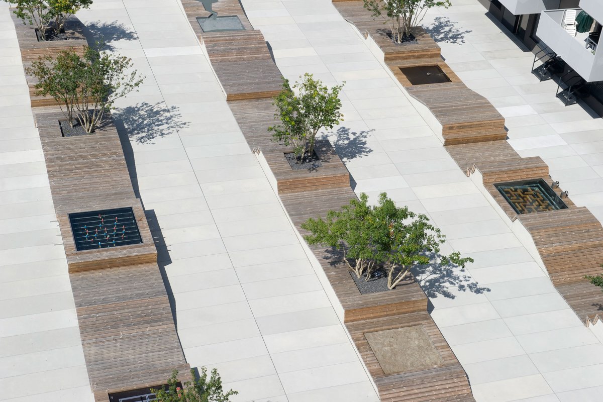 Unter den Baumdächern befinden sich Aufenthaltsorte für Begegnung, Spiel und Ruhe. Vegetationskörper aus Gräsern und immergrünen Gehölzen betten die Aufenthaltsplätze schützend ein. Durch die Vegetationskörper werden auch die Gebäude und die privaten Terrassen in die Umgebung eingebunden.