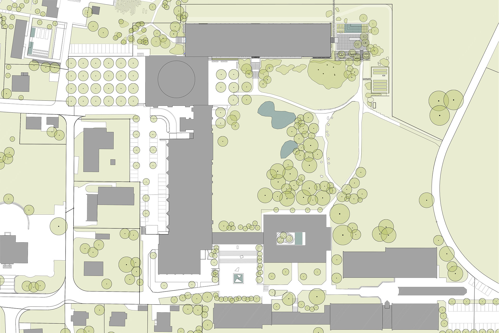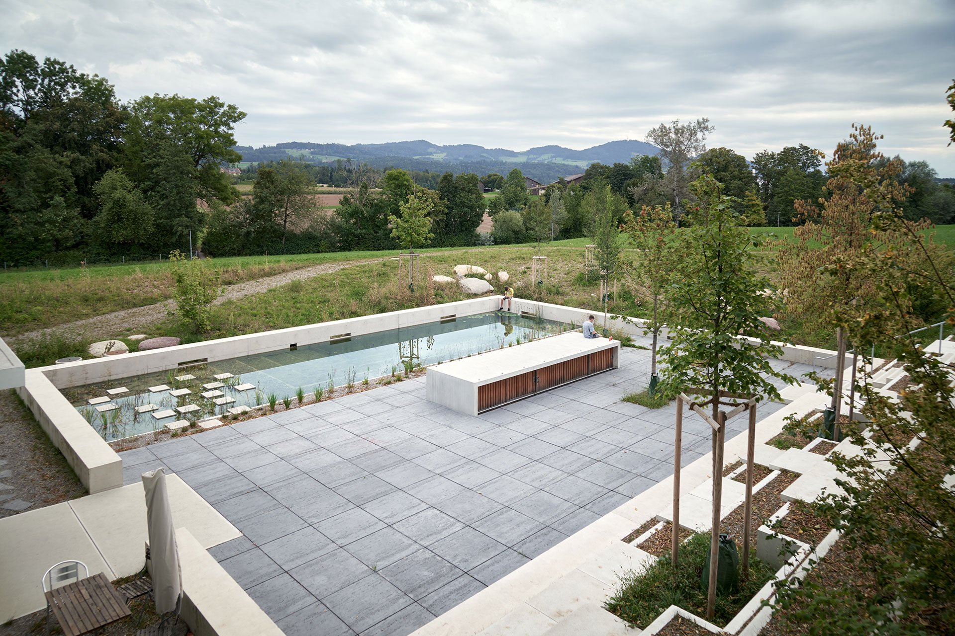 Zu den bestehenden Feldern, den Aulaplätzen mit den markanten Platanen und dem Platzfeld mit der grossen Freitreppe, fügt sich an die Erweiterung des Grossen Spezialtrakts das neue Aussenschulzimmer an. Das Zimmer bietet Lehrraum, Arbeitsraum sowie auch Aufenthaltsraum und integriert sich wie selbstverständlich in den denkmalgeschützten Kontext.