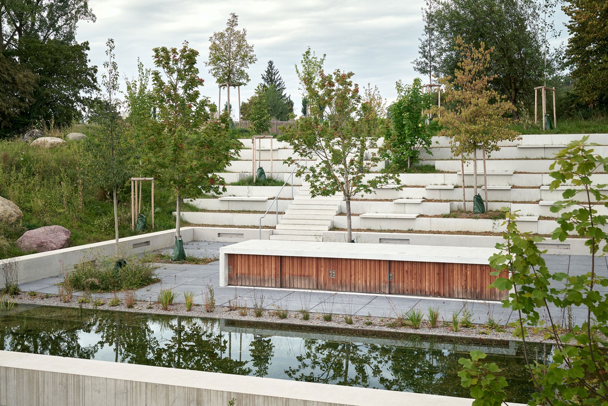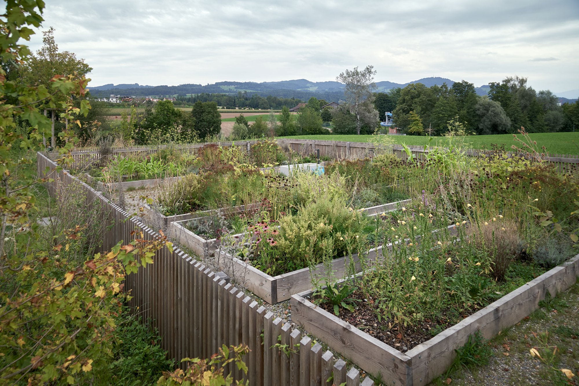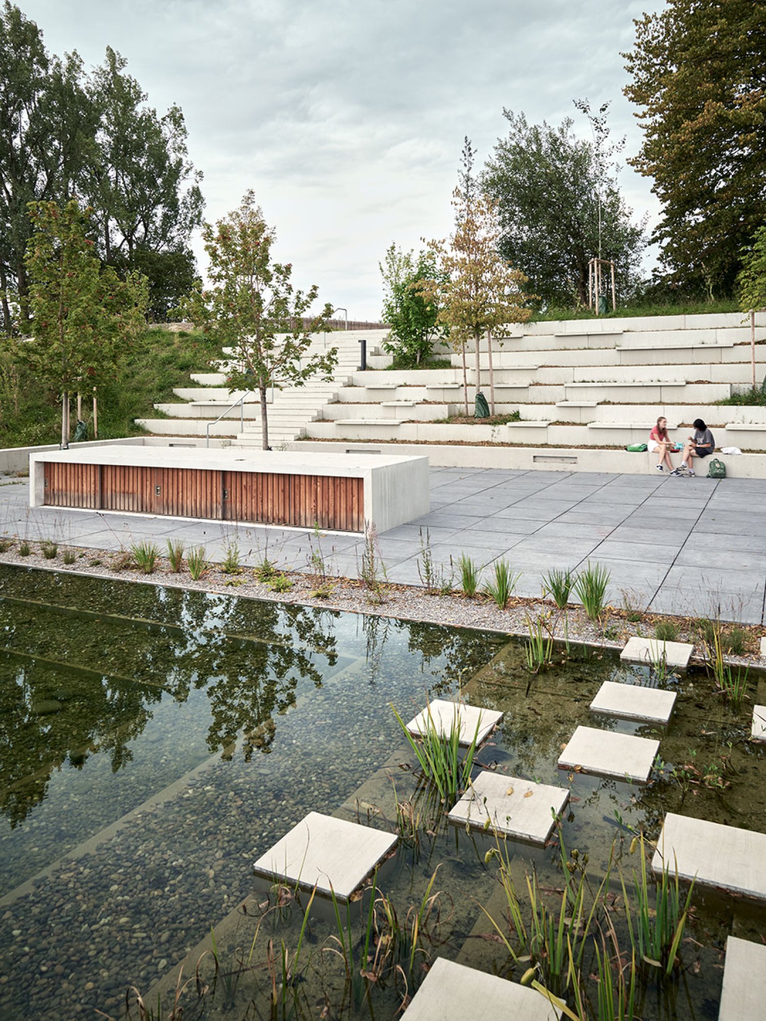 Ein klarer Rahmen, eine Sitzmauer mit integrierten Kleintier-Durchlässen, fasst das Aussenschulzimmer. Angrenzend an die Sitzmauer bieten durchgrünte Sitzstufen mit Sitzplatten Raum für den Unterricht und die Pausen im Freien. Über den Spiegel des Wassergartens hinweg öffnet sich das Zimmer in die Weite der umfliessenden Landschaft. Die verschiedenen Wassertiefen des Gartens sorgen für eine grosse Pflanzendiversität und ausreichend Versuchsraum. Ein grosser Werktisch bietet die Möglichkeit im Freien zu Werken, zu Gestalten und Wasserpflanzen zu studieren. Durch das Blätterdach der hochstämmigen und mehrstämmigen Bäume entsteht an sonnigen Tagen ausreichend Schatten im Aussenschulzimmer. Neben dem leicht vertieften Aussenschulzimmer bietet der gefasste Pflanzgarten Unterrichtsmaterial und Lernstoff.