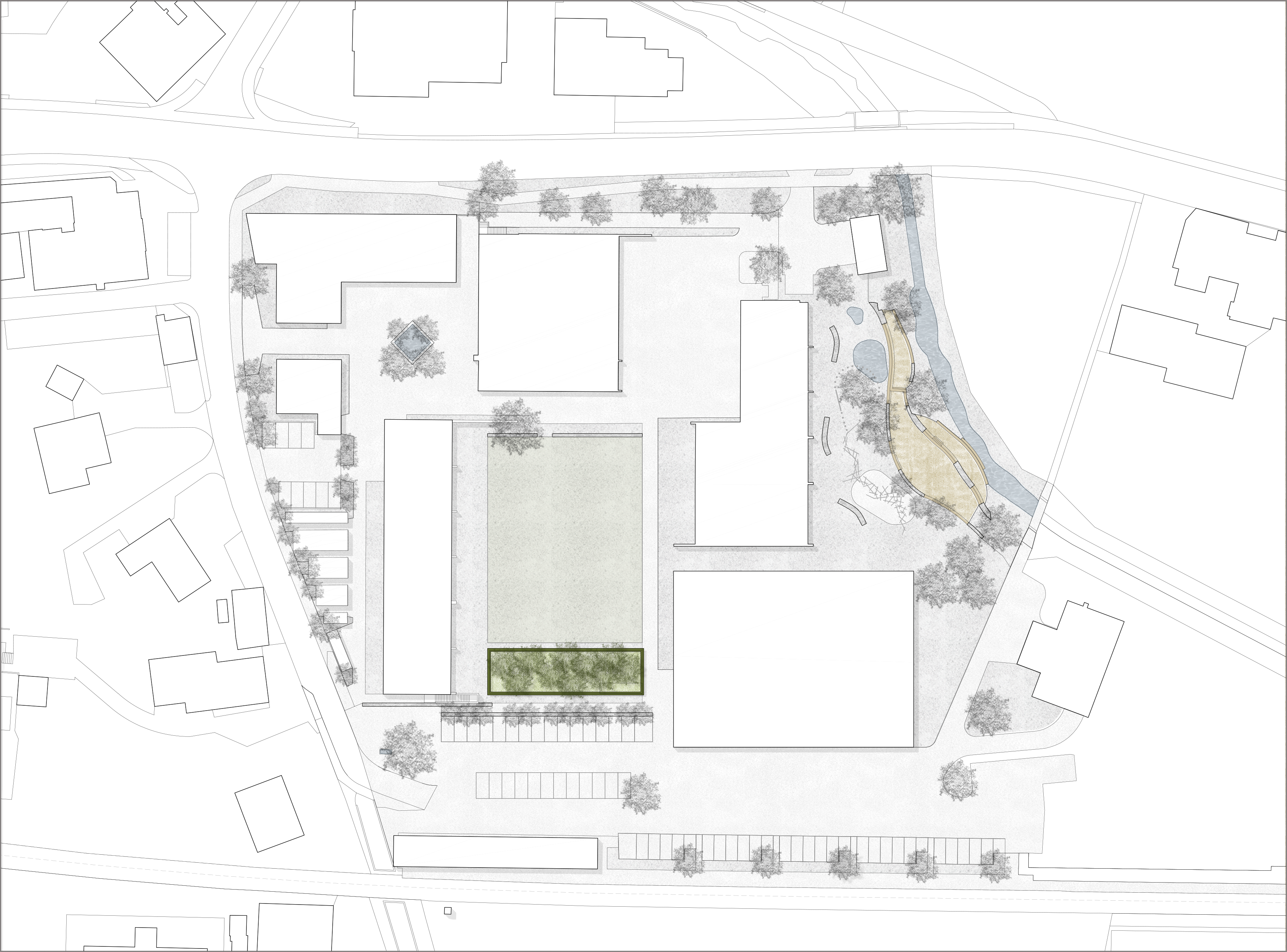 Pädagogisch und organisatorisch hat sich die bestehende, gewachsene Anlage bestens bewährt. Die schulischen Räumlichkeiten werden an den schutzwürdigen Trakt B angebaut und die bestehende Situation weiterentwickelt. Die frei gestaffelten und sanft erweiterten Hauptvolumen werden zudem mit einem neuen, freistehenden Hallenbau ergänzt. Dieser lässt jedoch die Mitte der Schulanlage frei und offen und fügt der etablierten Aussenraumabfolge zwei weitere Episoden hinzu: Die durch den Hallenbau und die Erweiterung neu gefasste Spiel- und Aufenthaltsbereich an der Surb und den neuen Platz zwischen Gemeindehaus und Sporthalle. Die neue Sporthalle markiert zudem zwei klar identifizierbare Adressen: Den Schulhof und den neuen Gemeindeplatz.