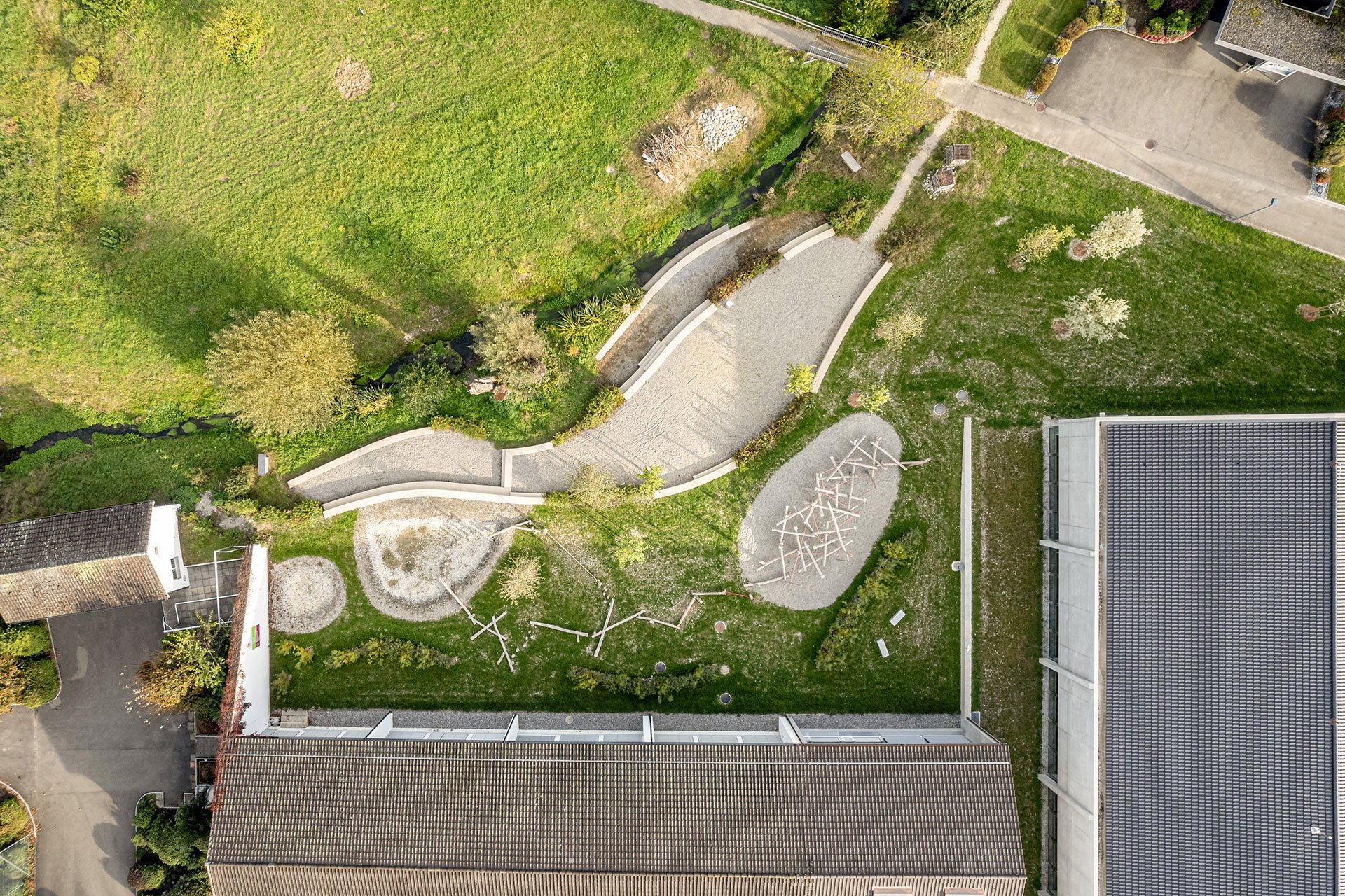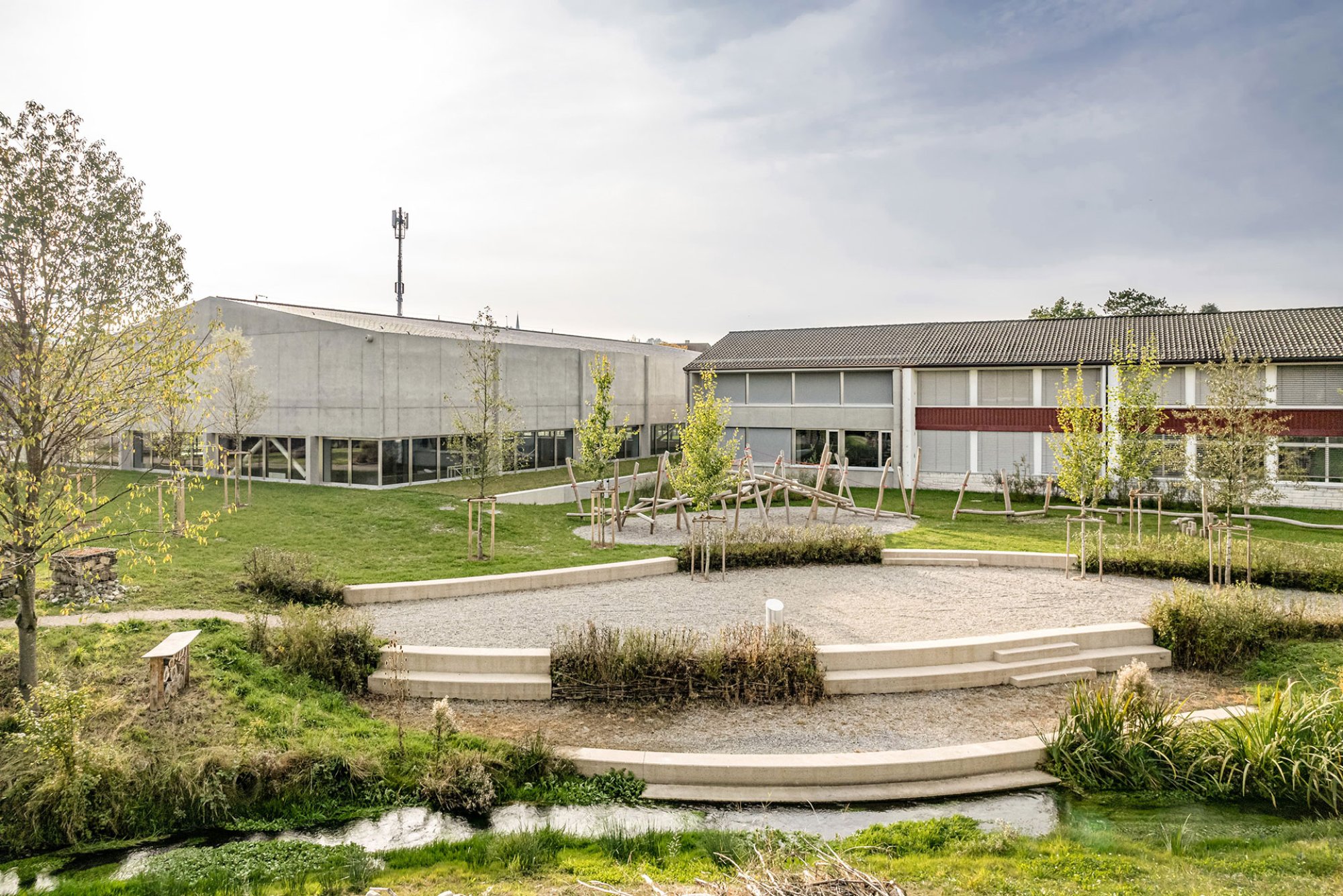 Ein Gartenzimmer ergänzt die grosszügige Wiese und bietet einen gerahmten Rückzugsraum. Schlängelnd durch die Blumenwiese und Ufervegetation hindurch führt ein Kiesweg zum Biotop und zum fein gestalteten Platz beim Gemeindehaus. Der mit Pflästerung ausgebildete Platz spannt sich zwischen Uferraum, Schule und Gemeindehaus auf und wird mit zwei Bauminseln aus Erlen akzentuiert.