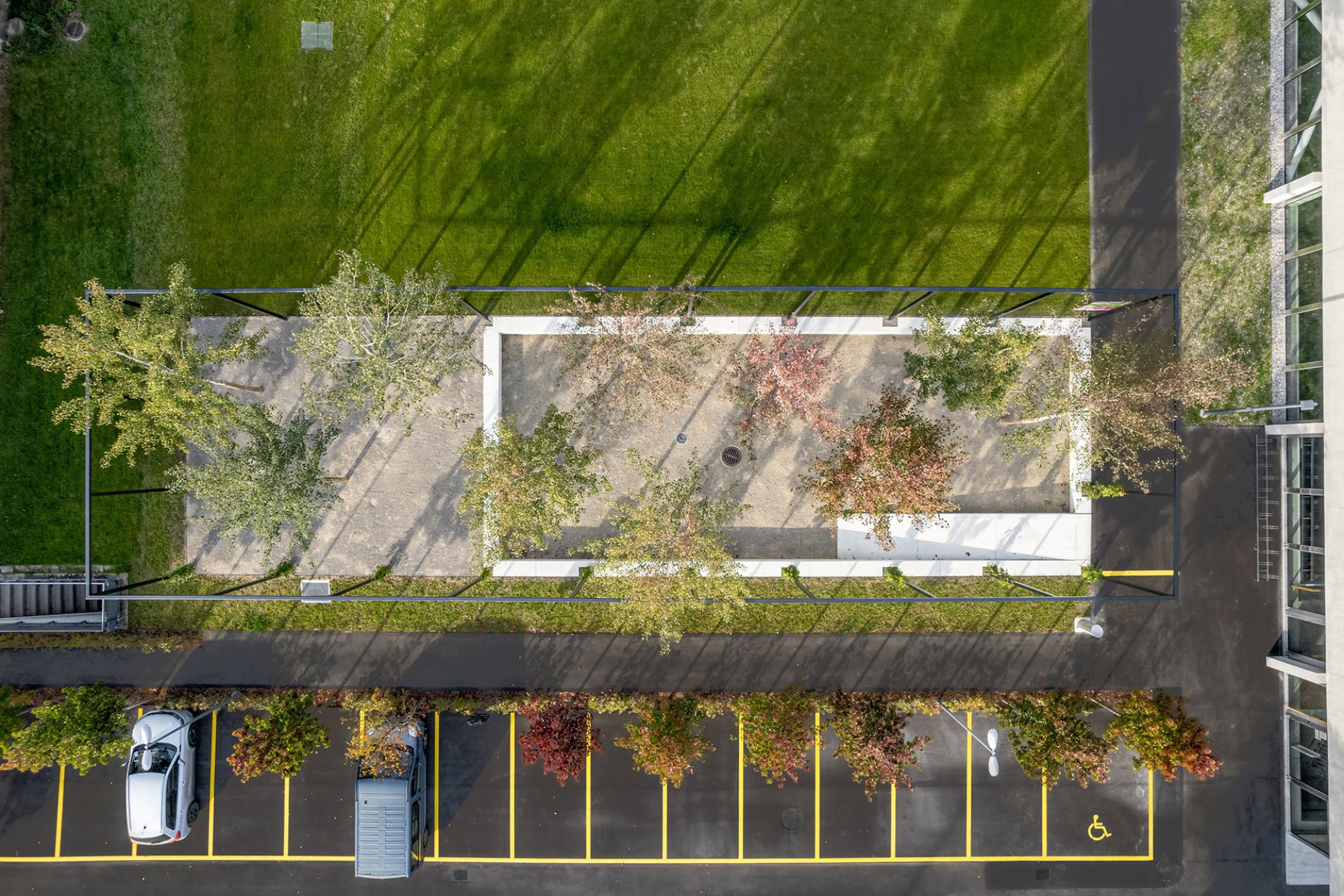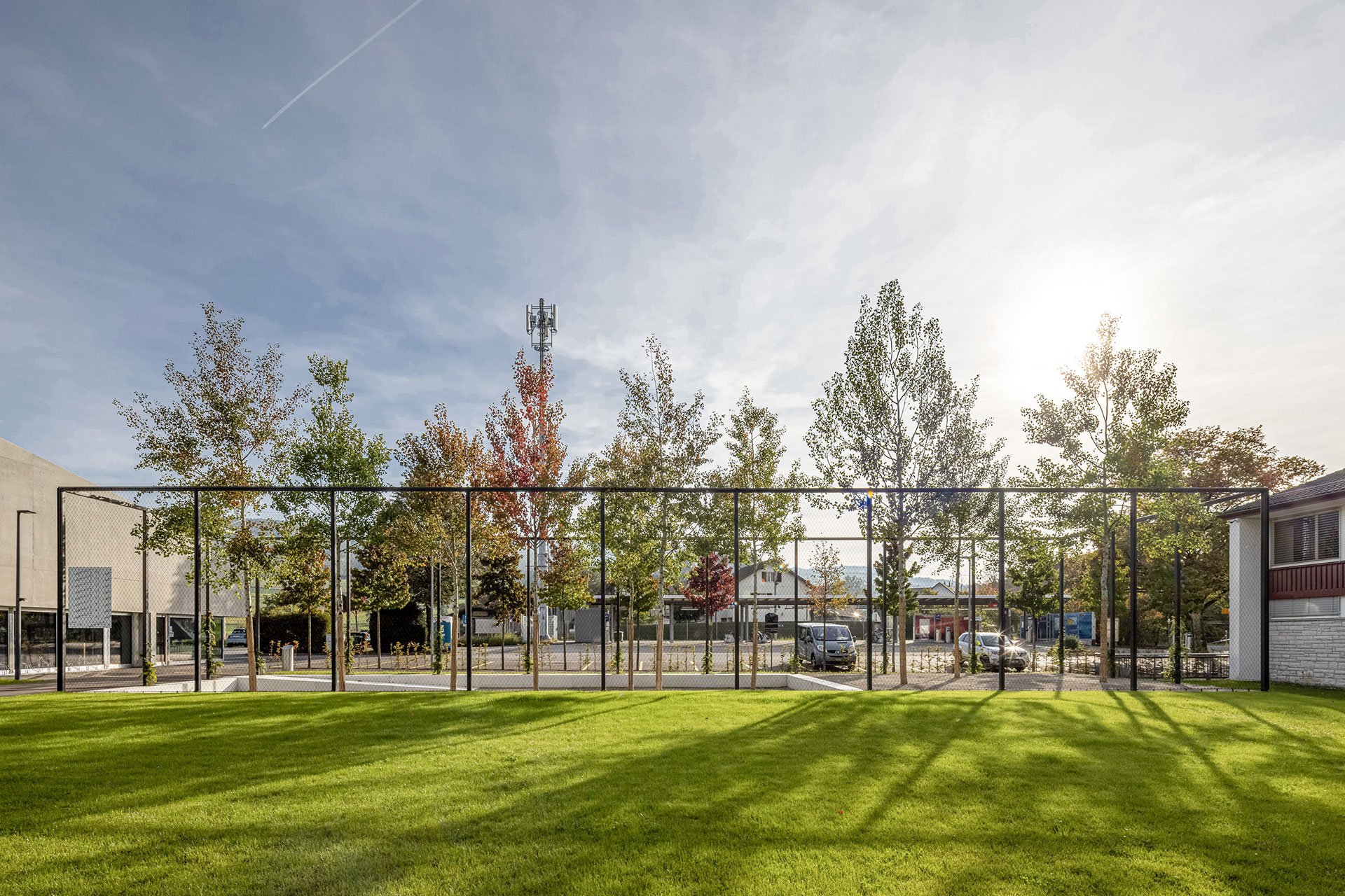 Lineare Heckenkörper und Hochstammbäume begrenzen das Schulareal zum Parkplatzbereich. Der bestehende Brunnen und die grosse Linde auf dem gepflästerten Platz schaffen einen Ankunftsort für Wartende, Pendler und Schüler.