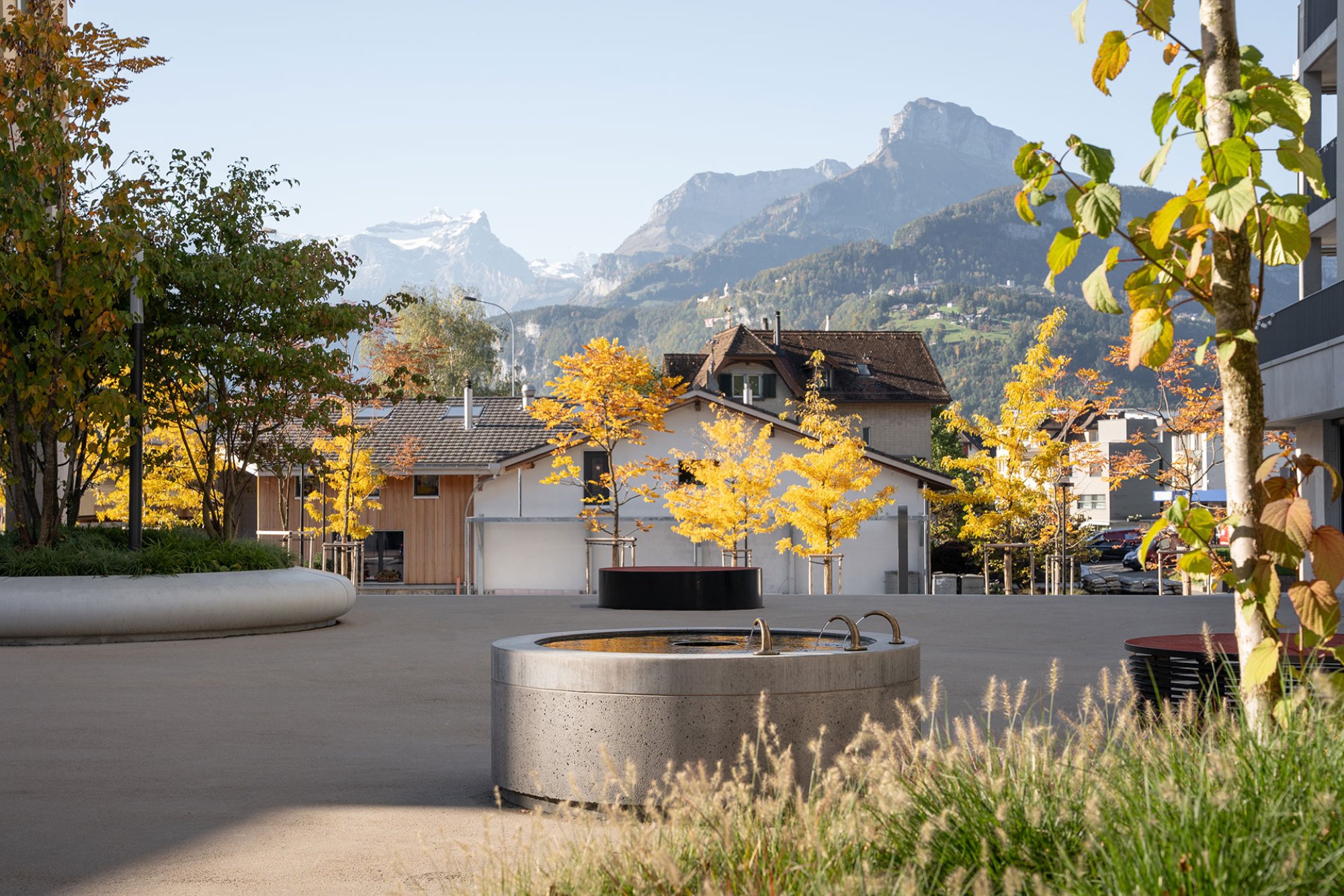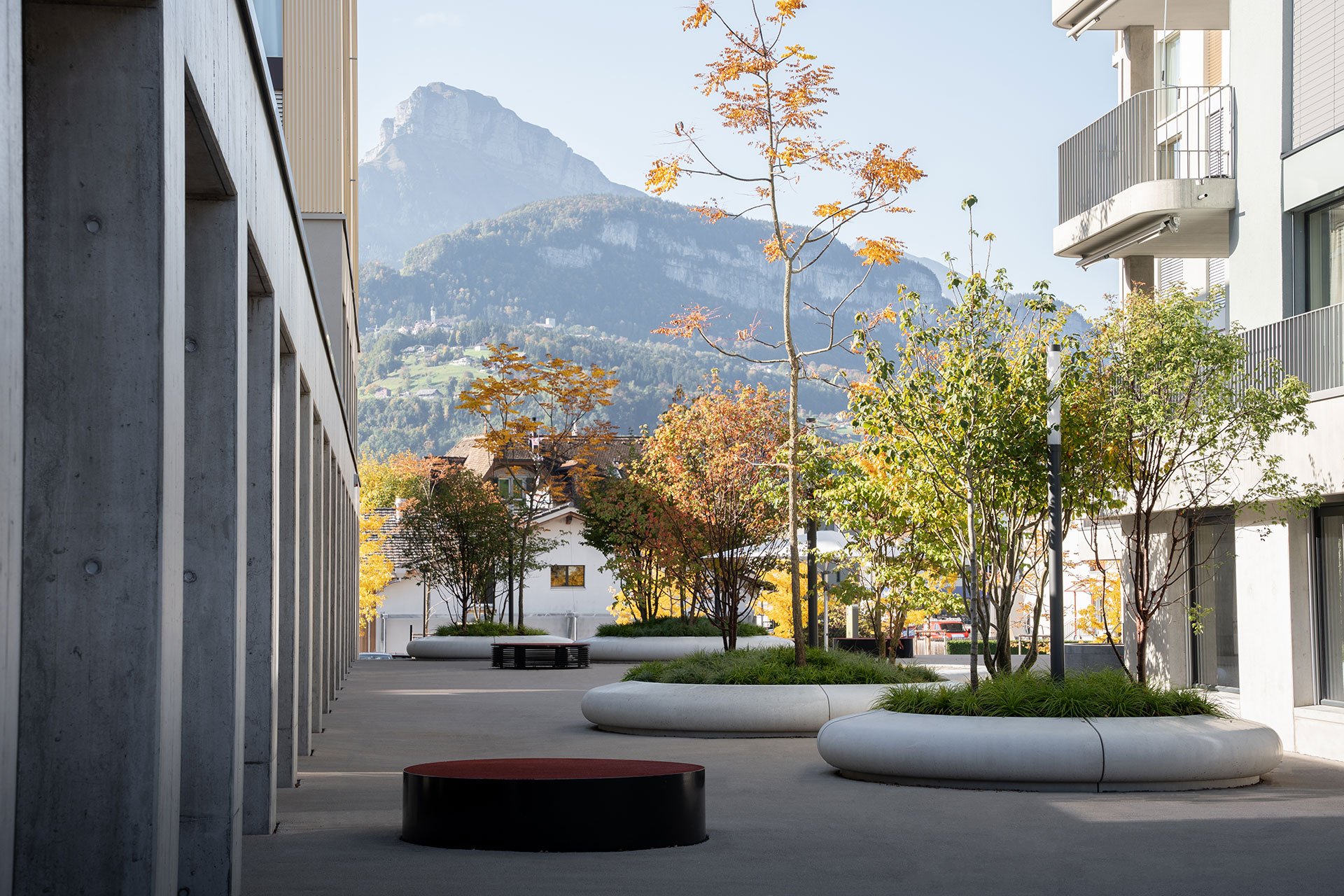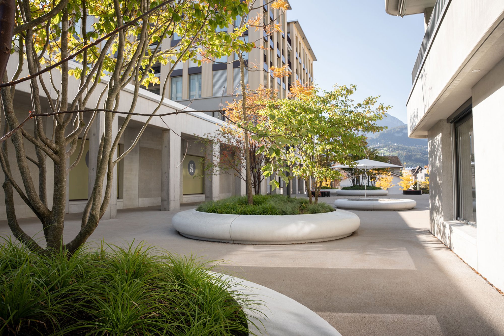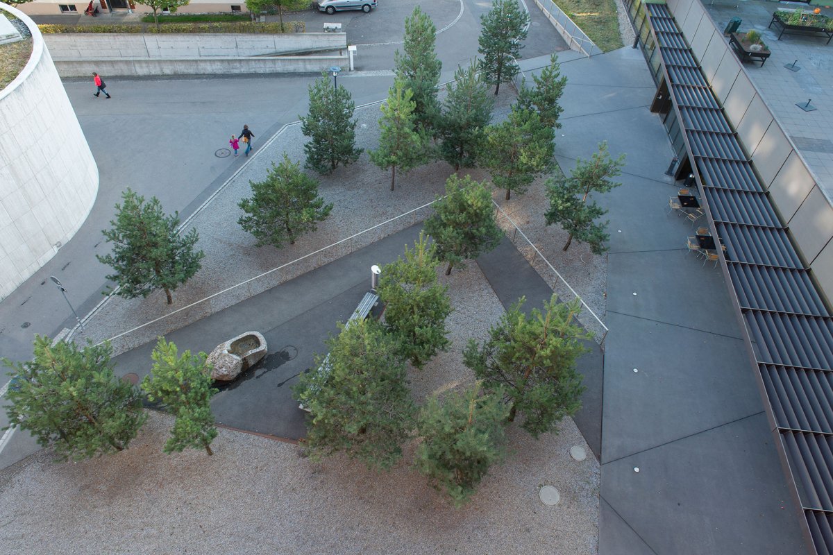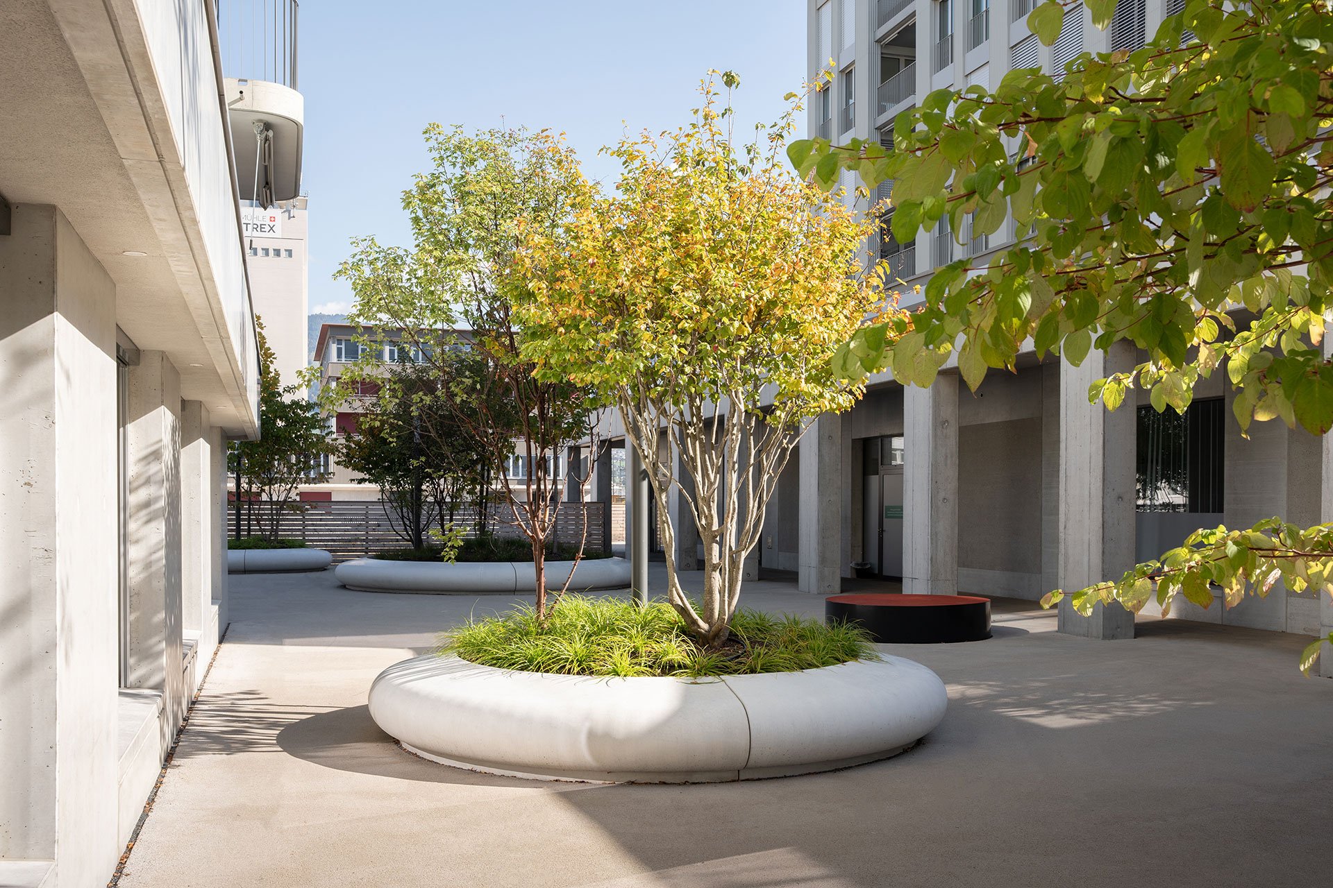 Eine Lagerung, beziehungsweise Sammlung, von über hundert unterschiedlichen Baumarten (Arboretum) aus Nord und Süd bildet das Herzstück des Hertiparkes und verleiht diesem eine starke Identität, eine grosse Aufenthaltsqualität und ein gutes Mikroklima für Wohnen und Arbeiten. Die grosse Diversität der Vegetation erzeugt unterschiedliche Atmosphären und variierende Hofbilder. In der Gesamtheit entsteht ein lichter Hain aus Laubgehölzen und immergrünen Bäumen, der Assoziationen an vergangene Reisen weckt. Die Bäume wachsen in skulptural geformten Baumkissen, welche mit verschiedenen Brunnen und Kinderspielbereichen ein lebhaftes Ensemble zwischen den Gebäuden bilden. Hochstammbäume aus einer Baumart kontrastieren die vielfältige Vegetation im Hof und bilden einen homogenen, grünen Rahmen für die Bebauung des Hertiparkes.